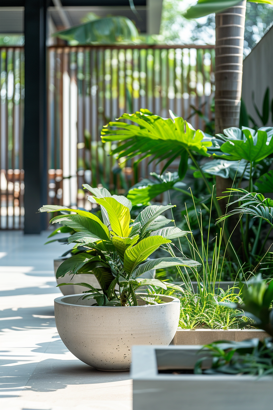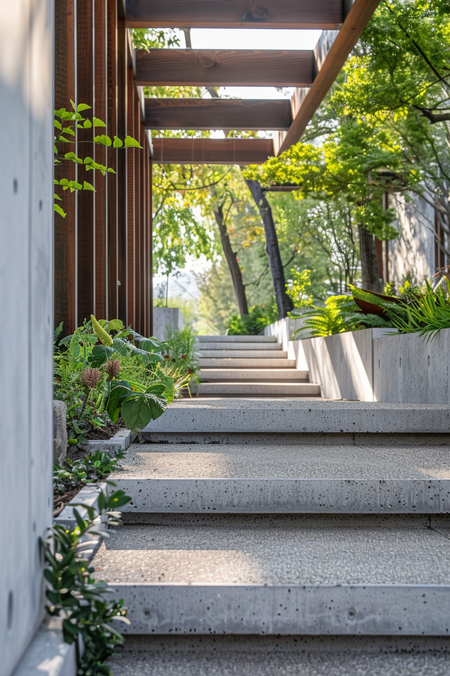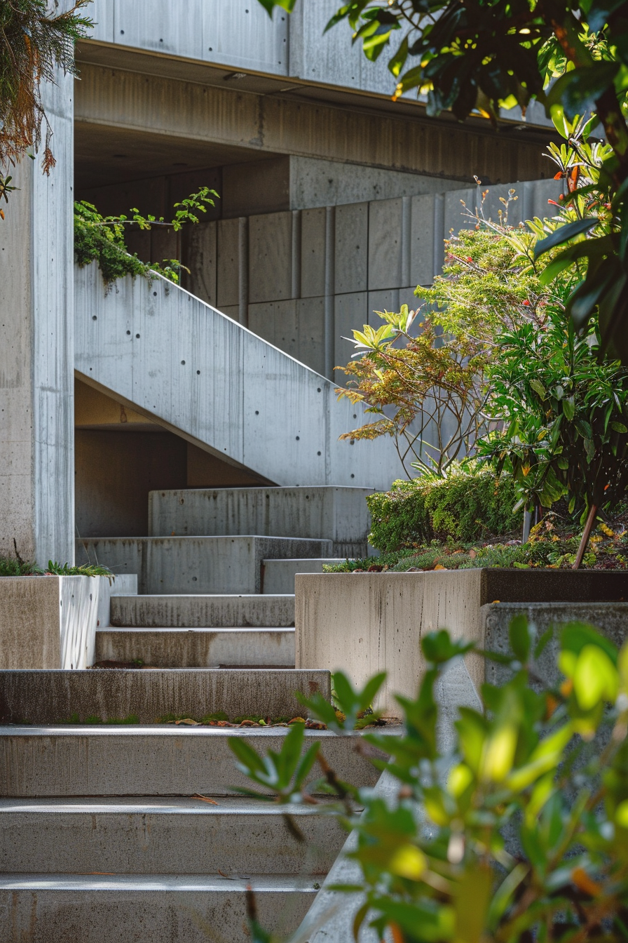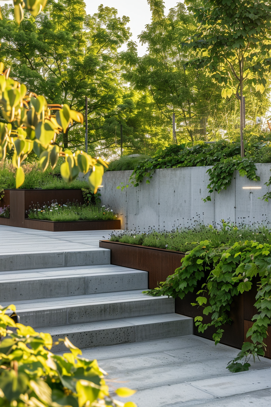 Tiered concrete structures hold lush plants, creating a cool contrast between hard and soft. The greenery spills over the edges, blending nature with the rugged surfaces. It’s a layered, balanced look that’s both striking and calming.