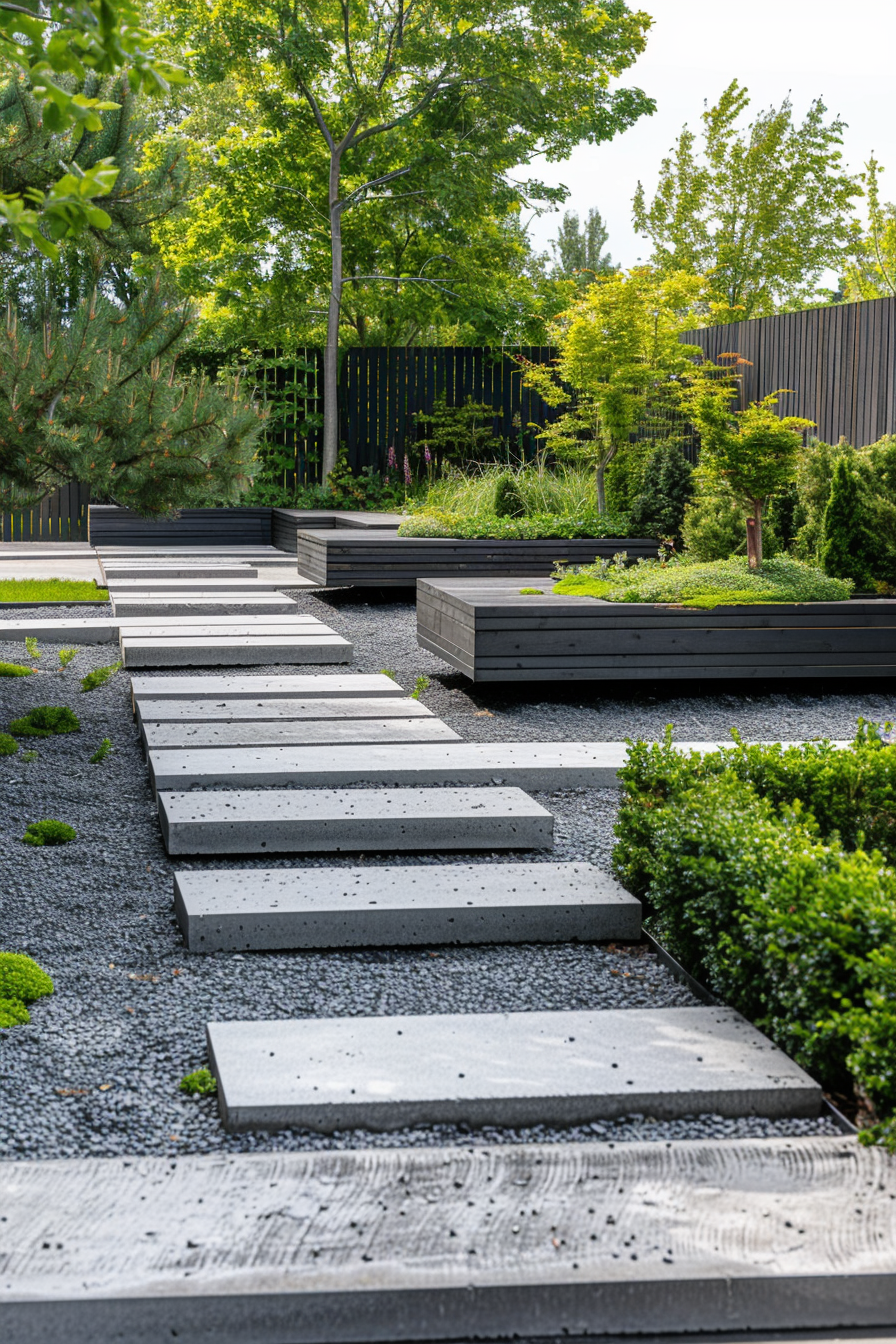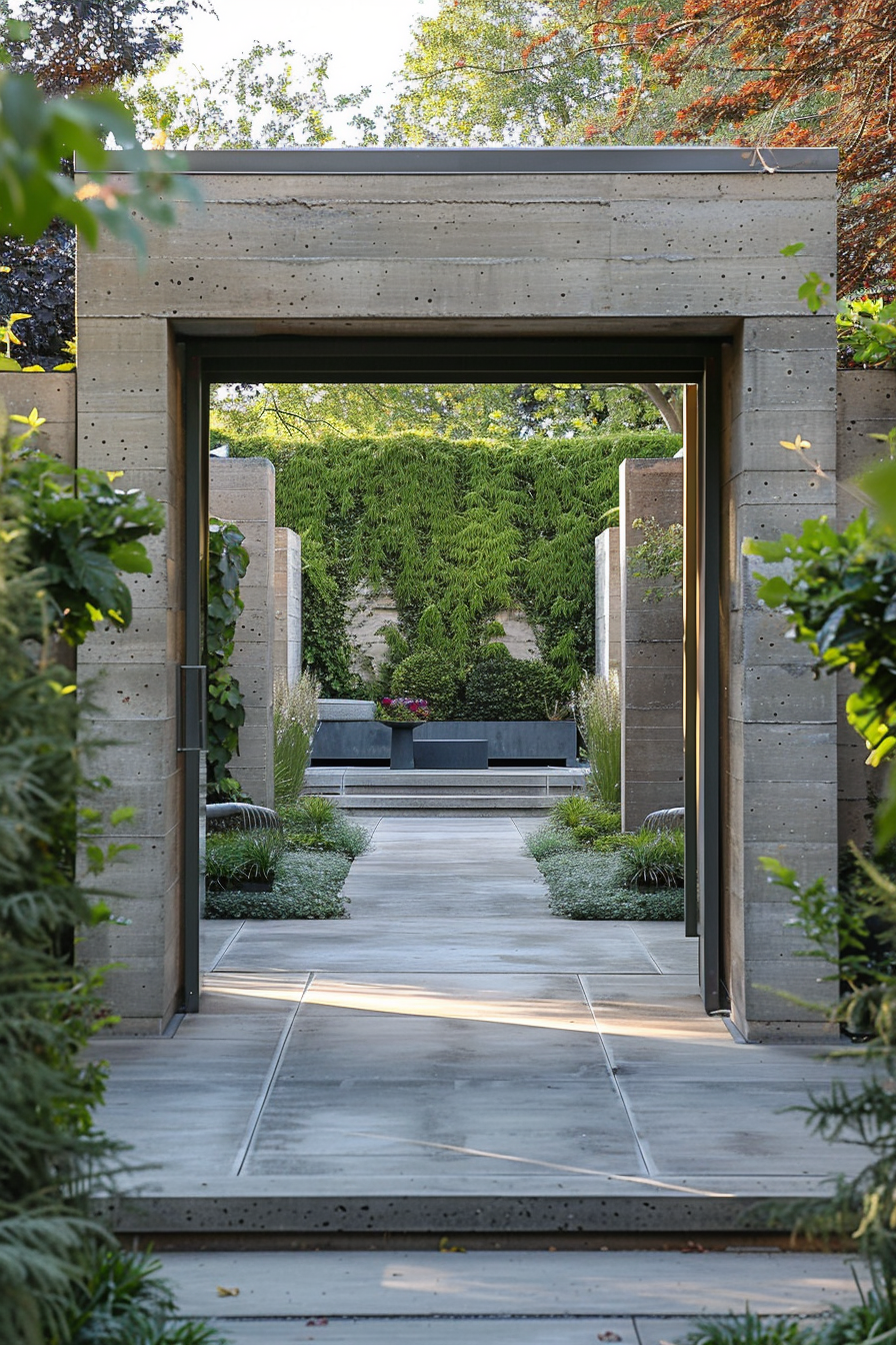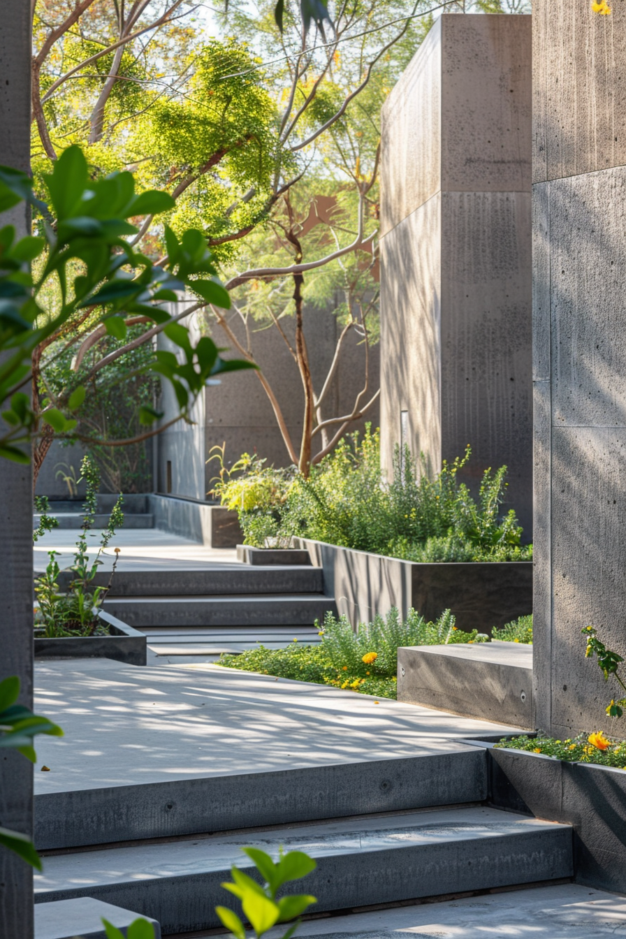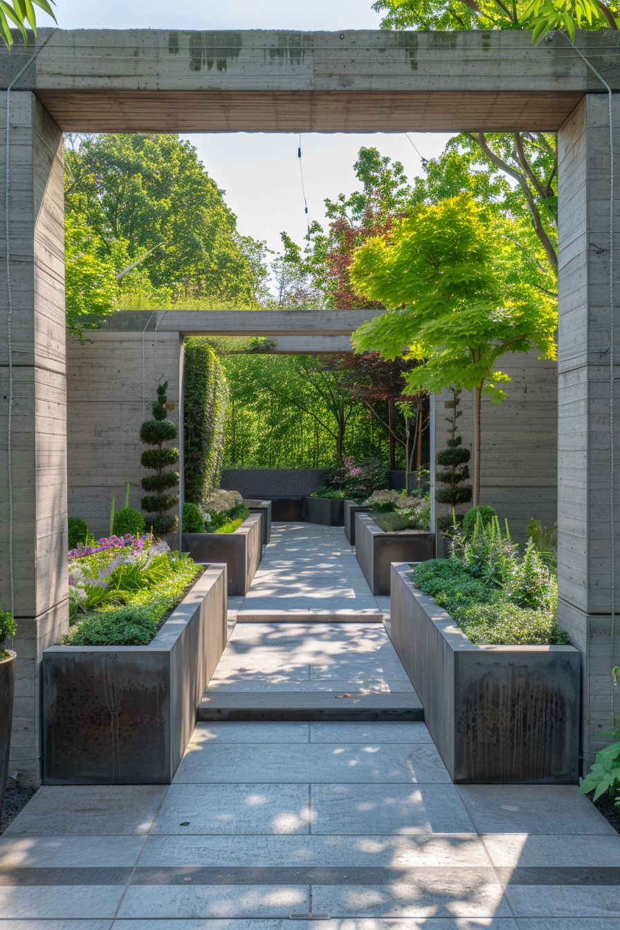 Concrete borders guide you through the space, while plants add a touch of softness. It’s a mix of order and nature, with repeating patterns that draw your eye and keep things interesting.