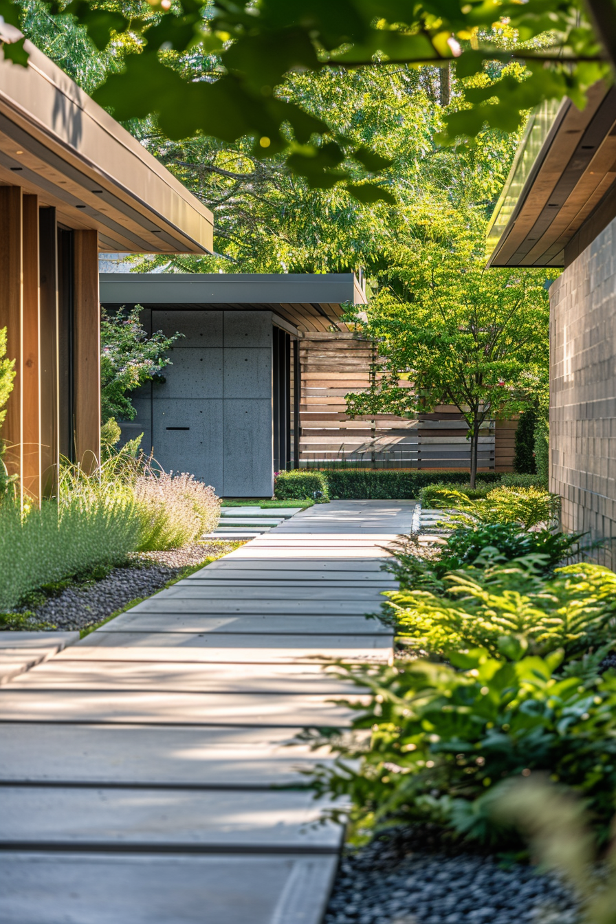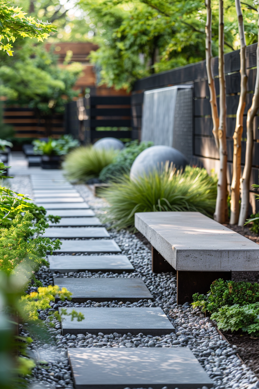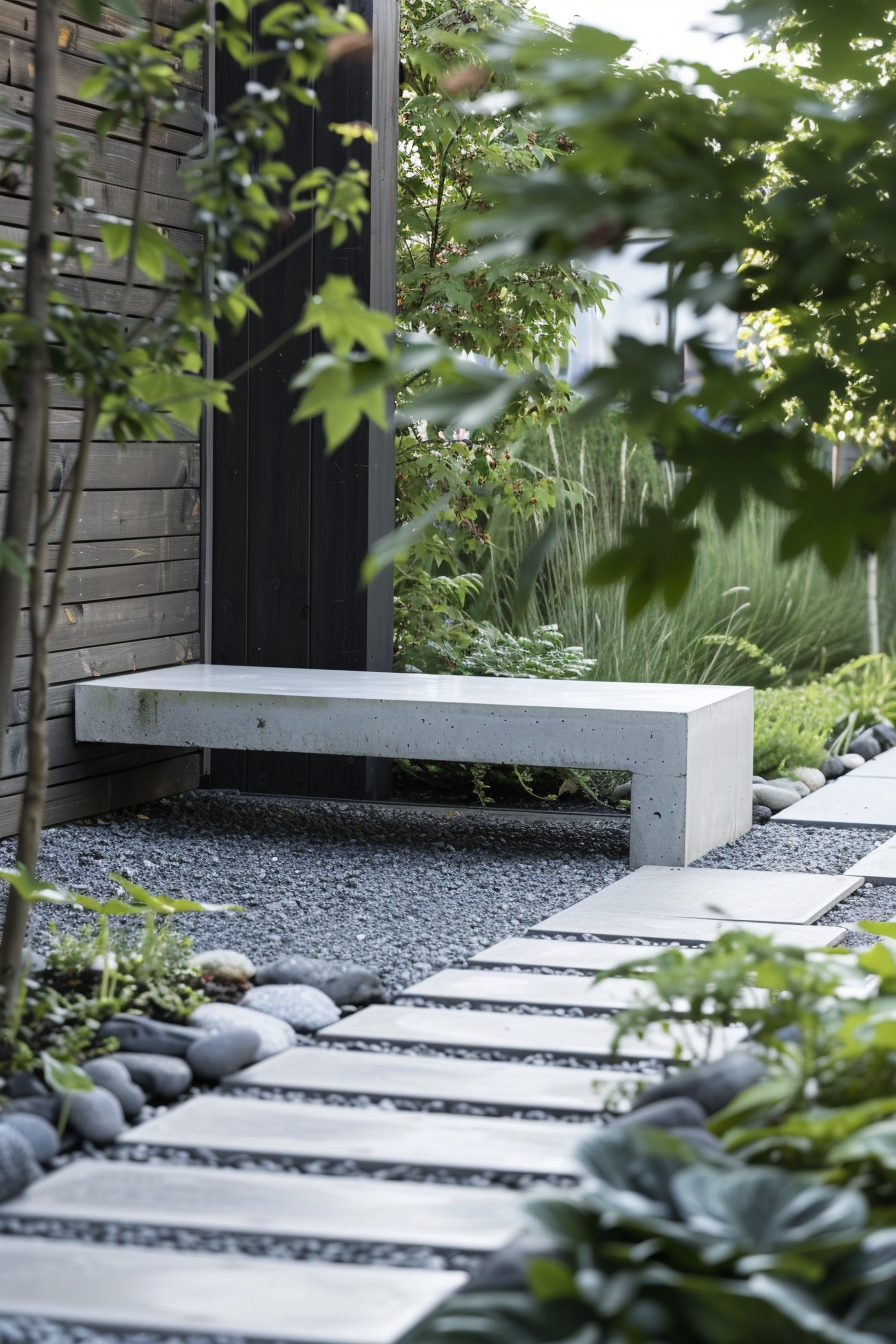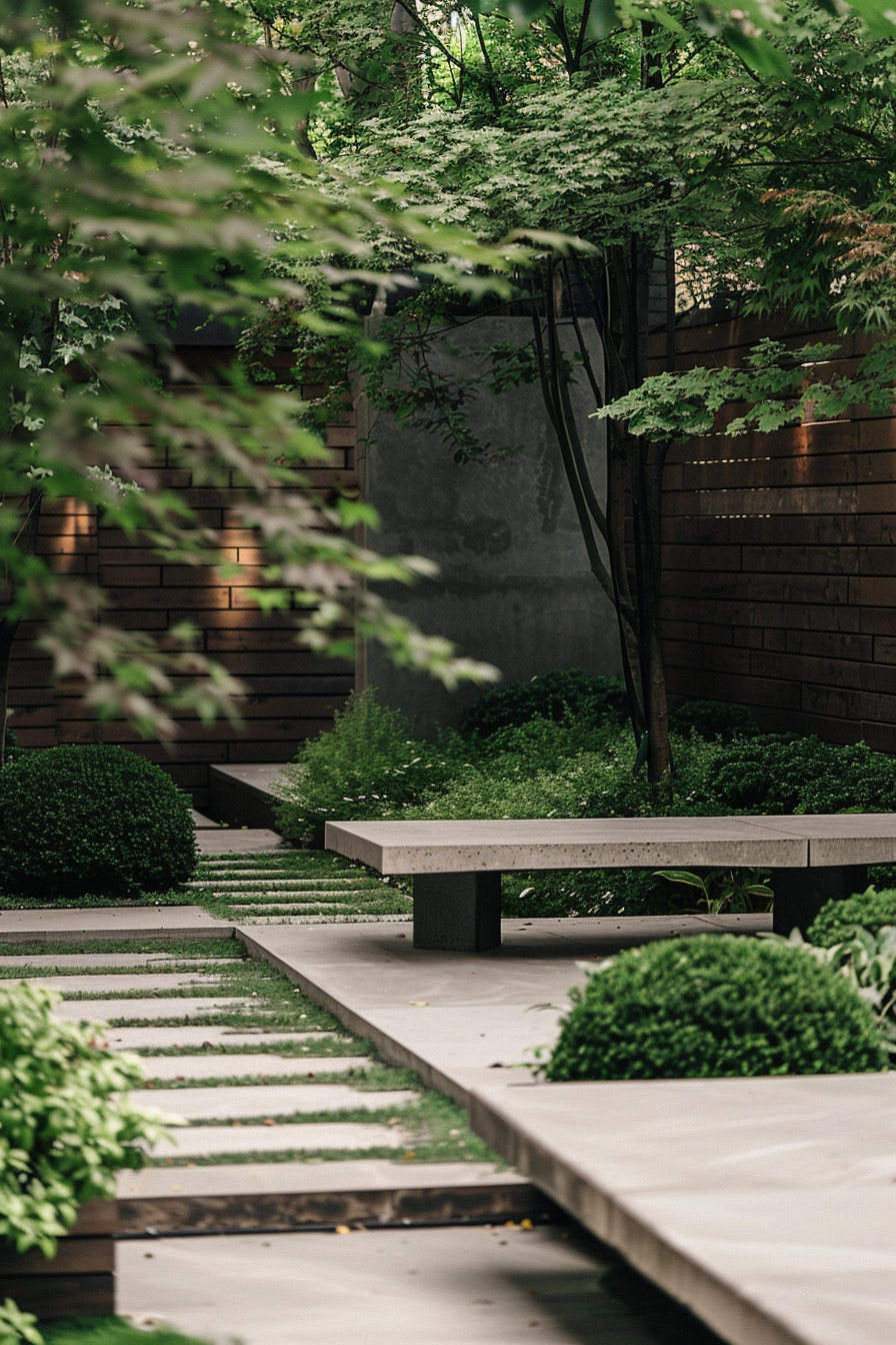 Concrete pathways and structured greenery create a balanced, tranquil space that’s perfect for quiet moments.
