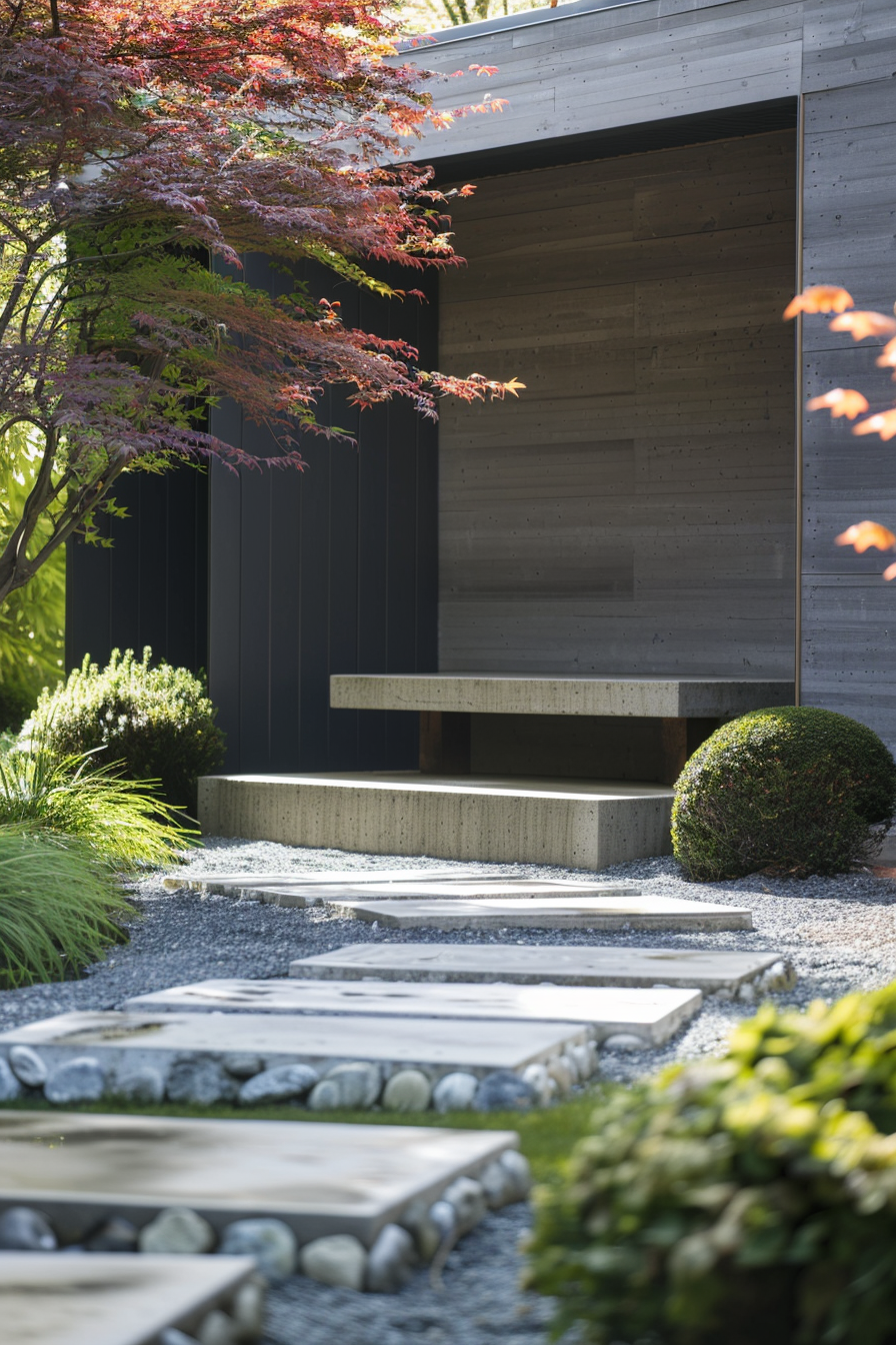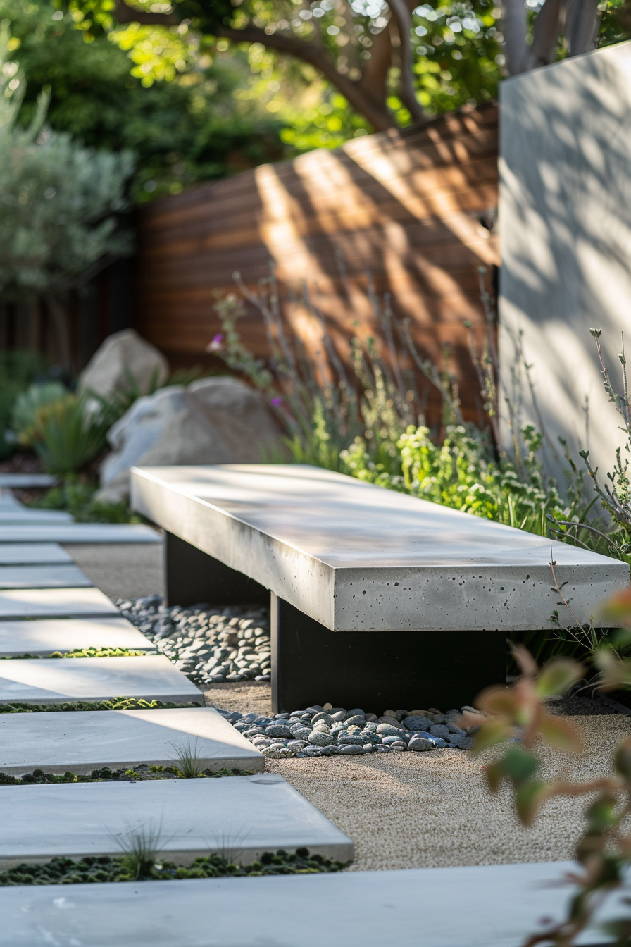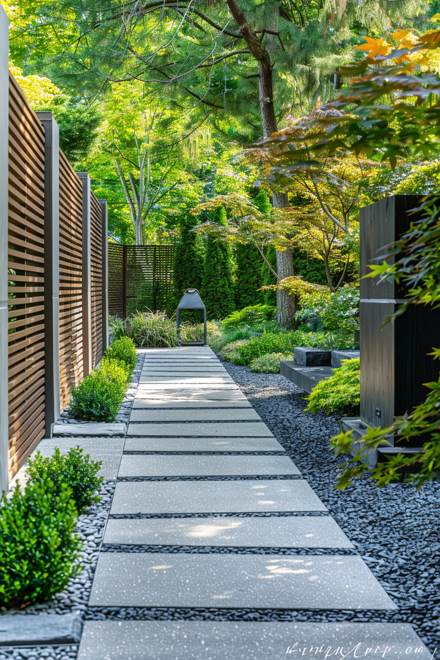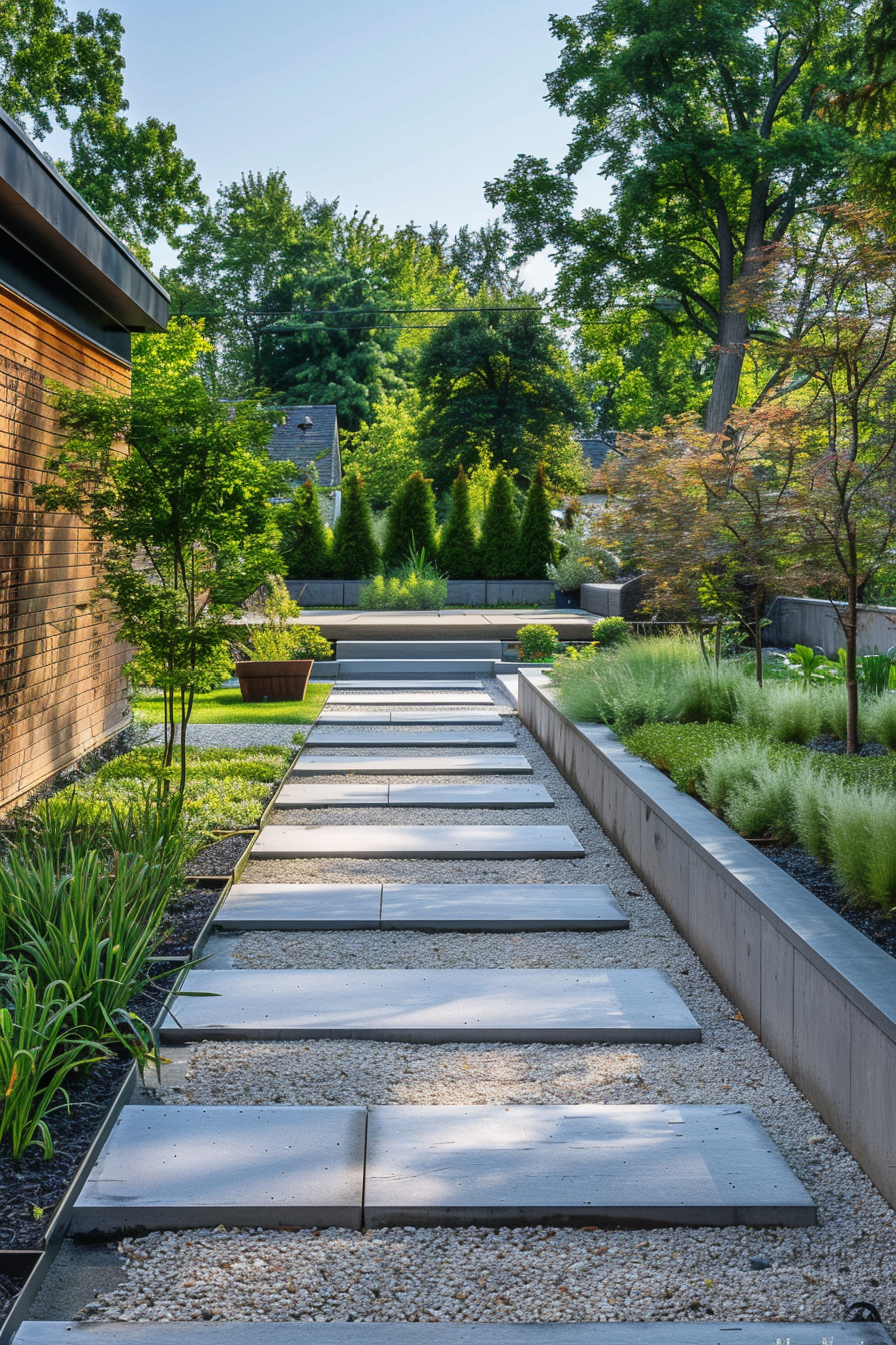 Concrete pathways and structured greenery create a balanced, tranquil space that’s perfect for quiet moments.