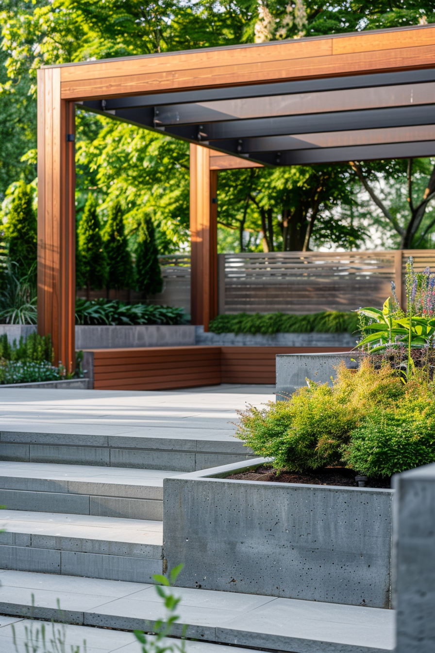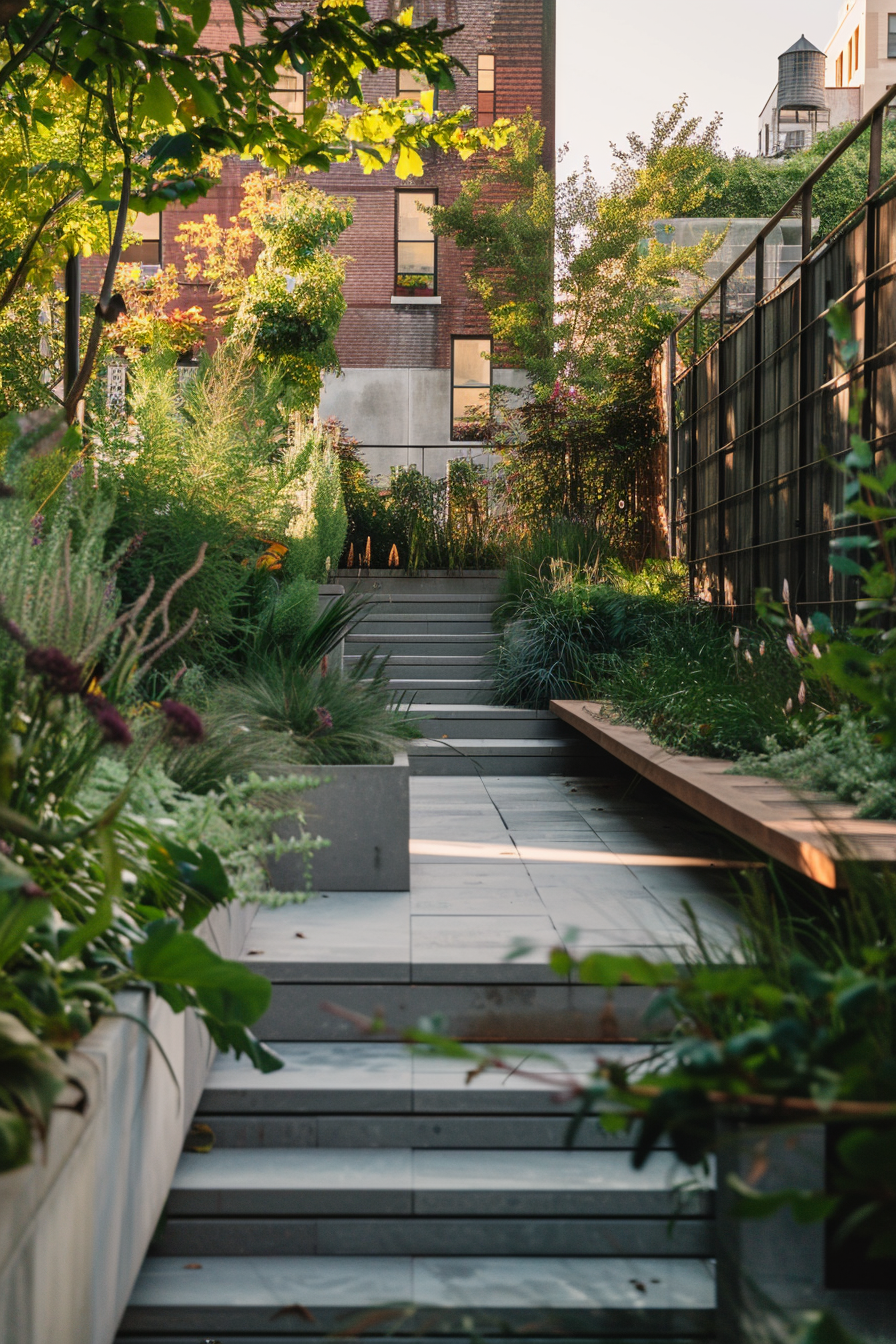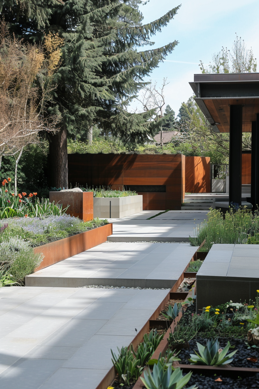 Elevated terraces create a sense of movement, with geometric shapes and structural plants adding depth. It’s a layered, open space that feels both functional and visually interesting.
