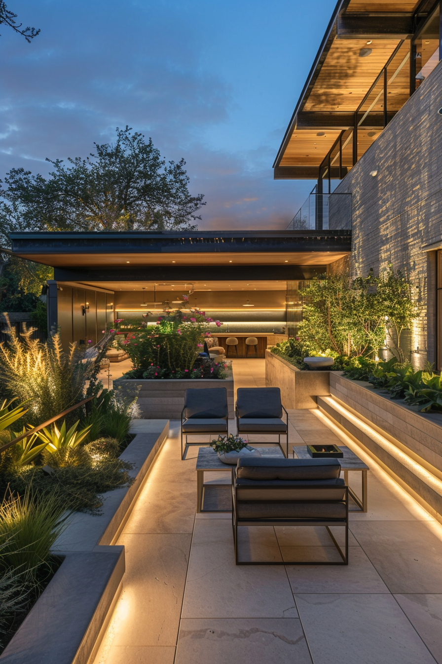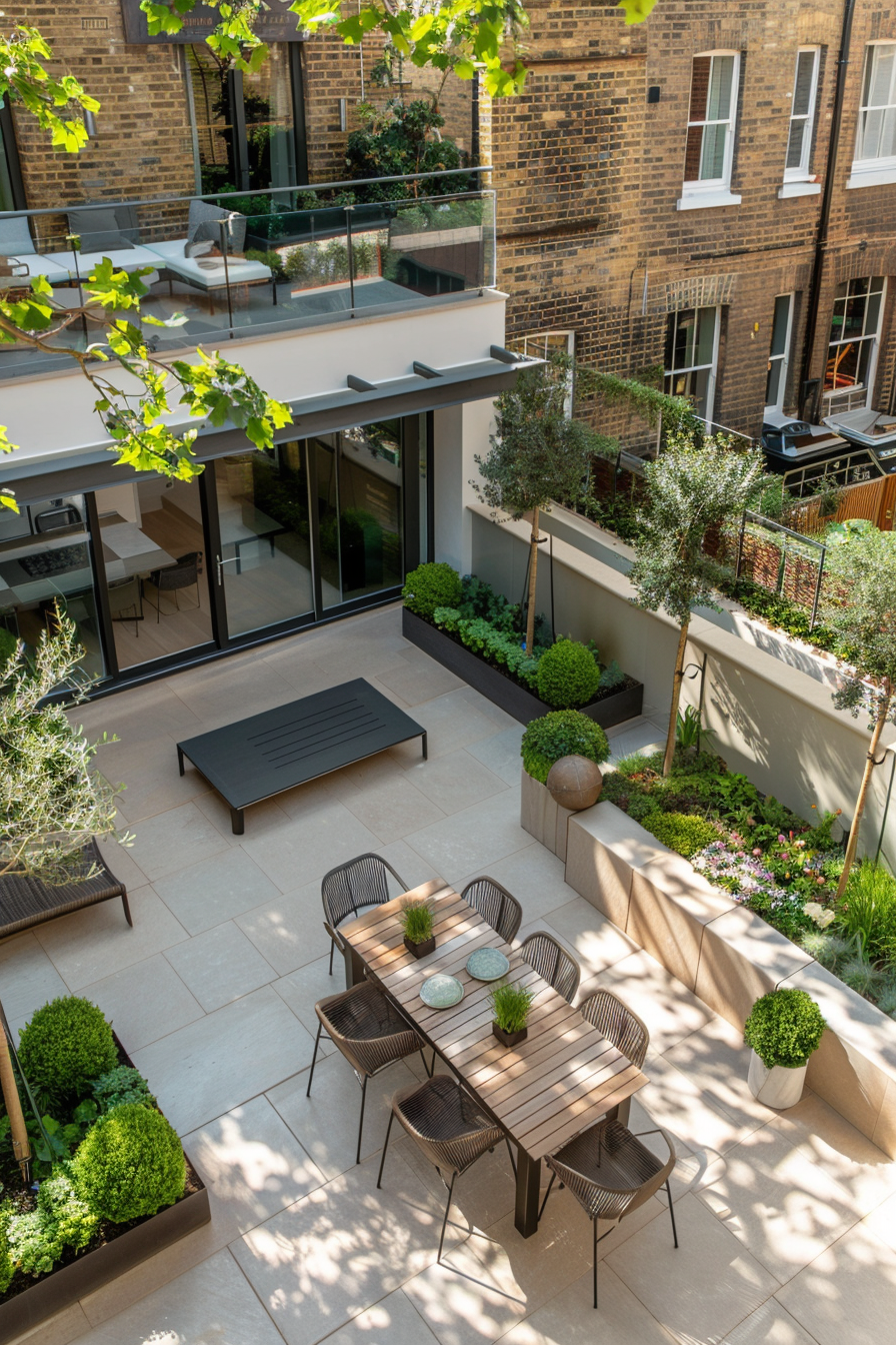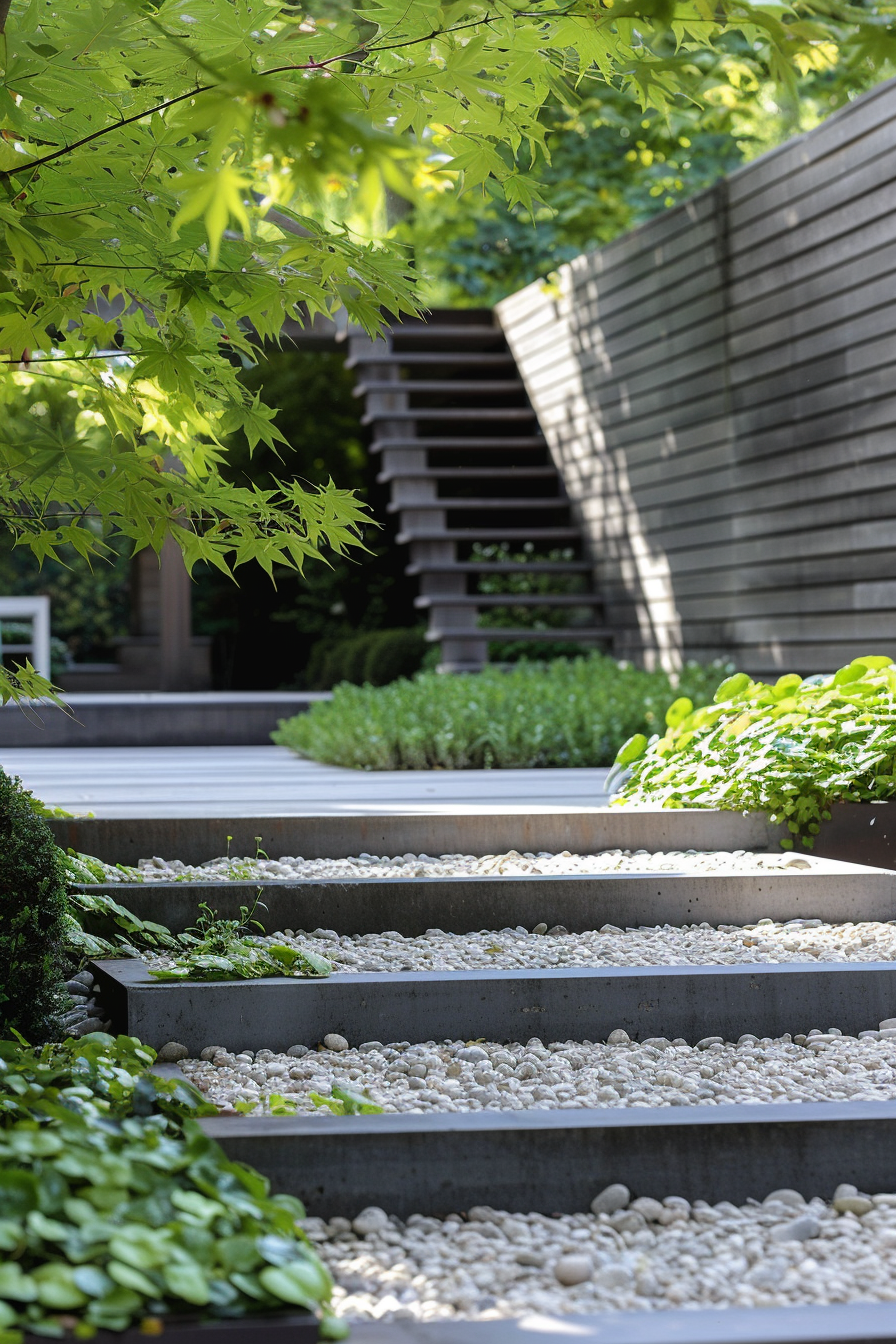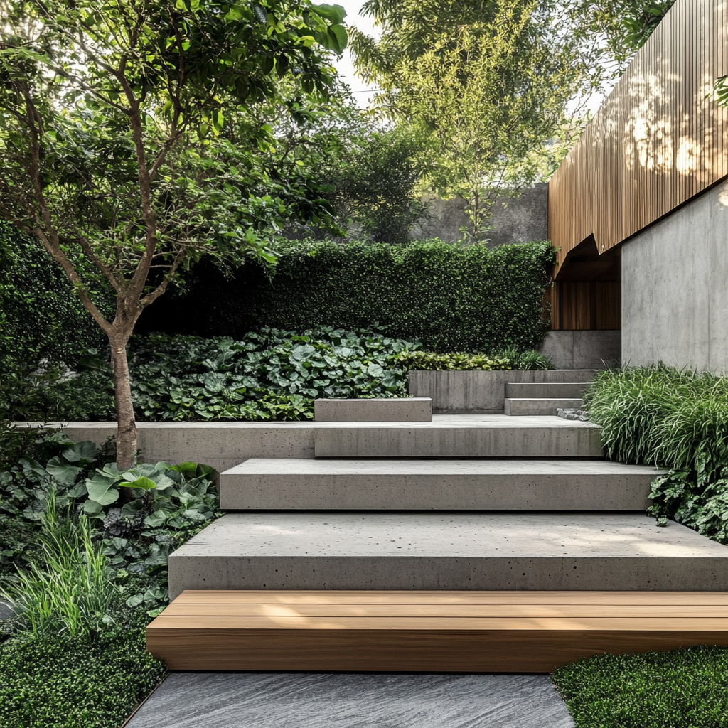 Elevated terraces create a sense of movement, with geometric shapes and structural plants adding depth. It’s a layered, open space that feels both functional and visually interesting.