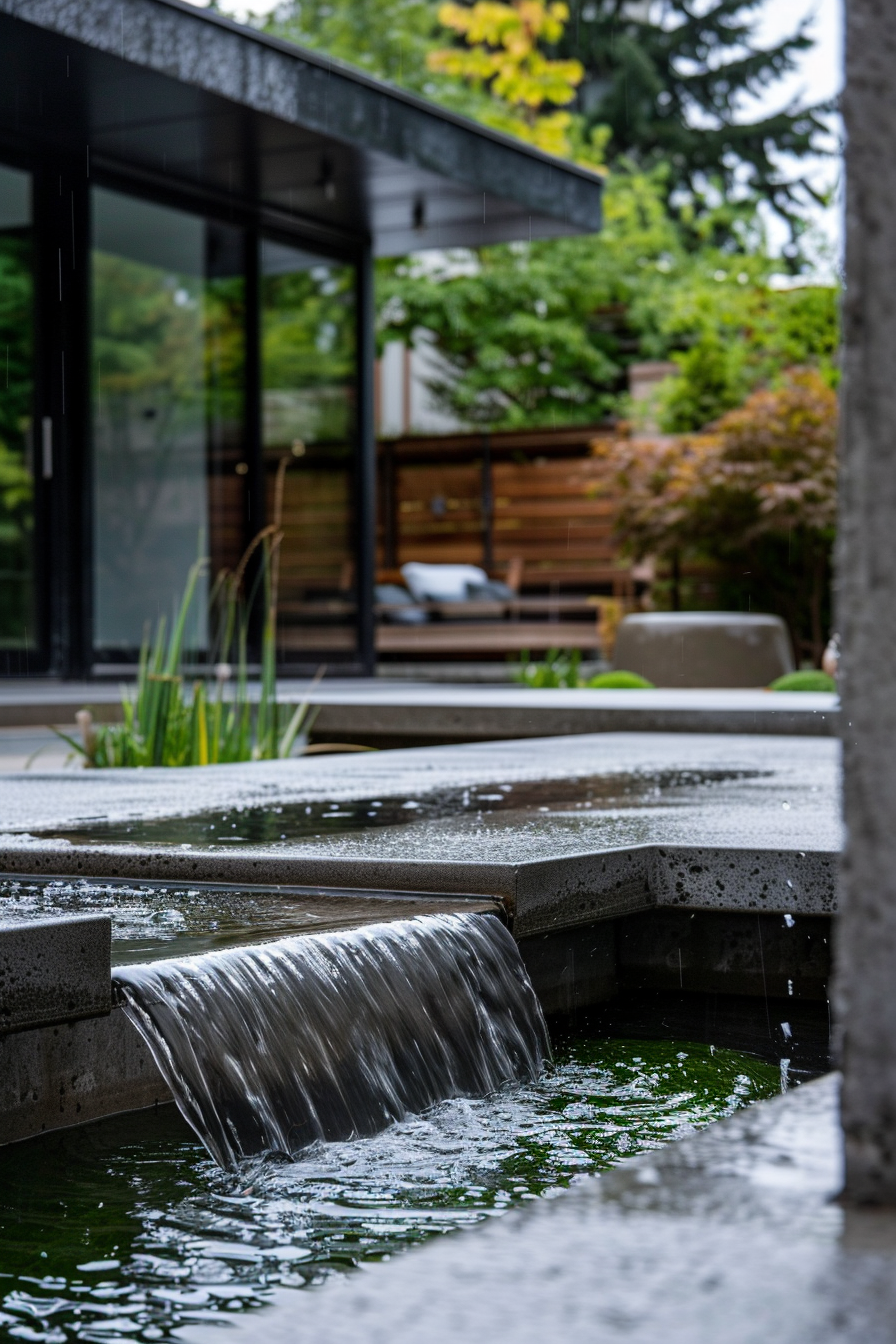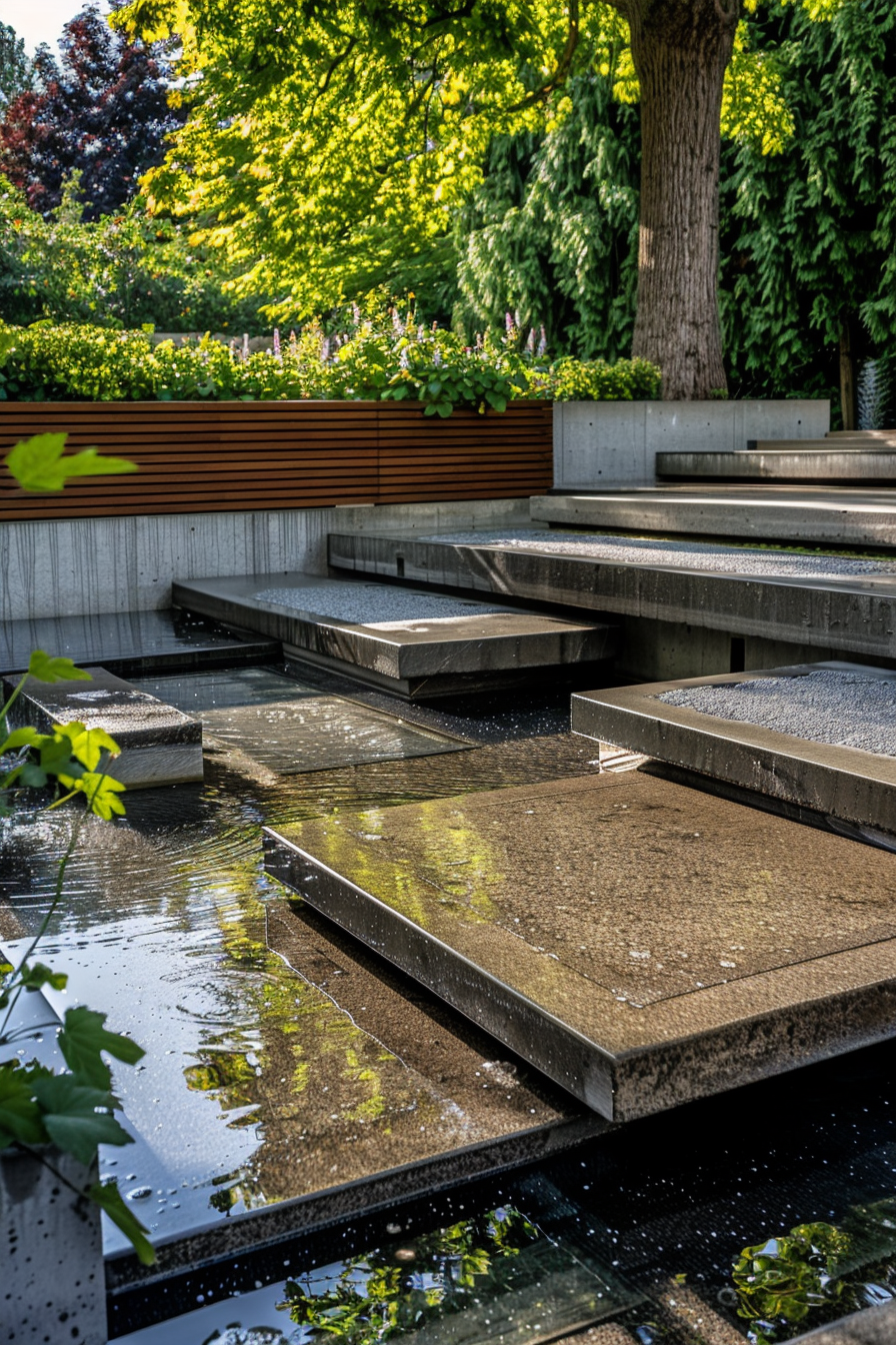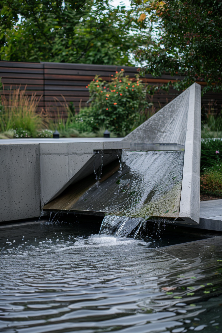 The sharp angles and smooth surfaces create a cool contrast, and the sound of water adds a peaceful touch.