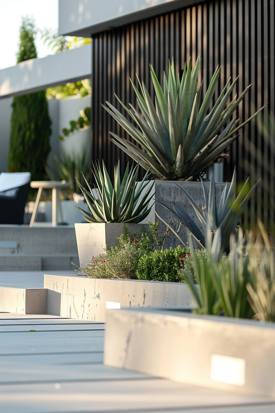 This elevated terrace mixes raw concrete with sculptural plants for a balanced look.