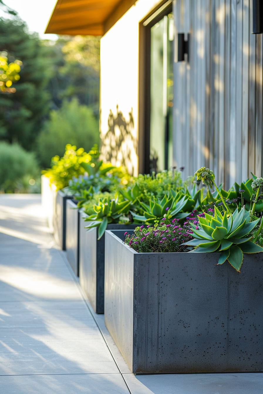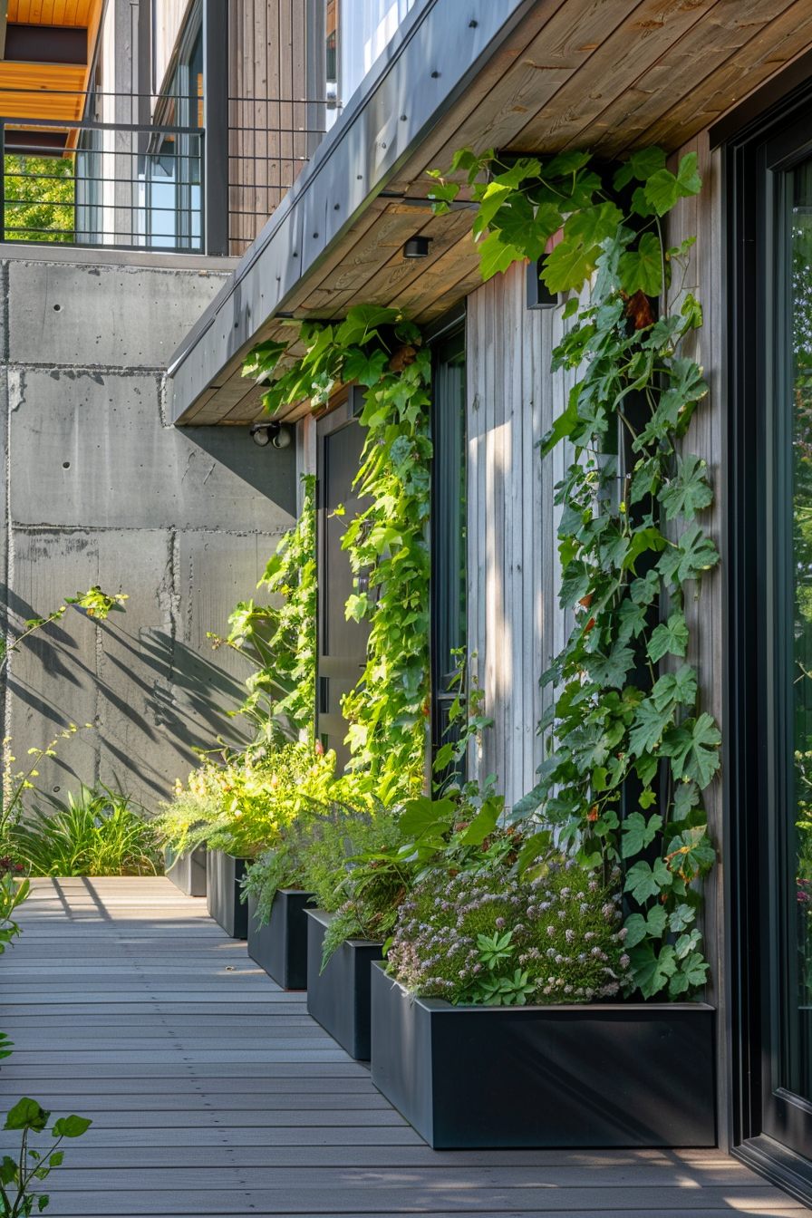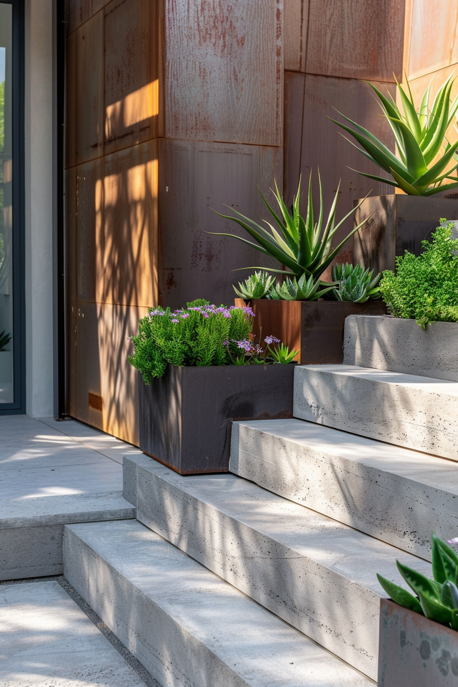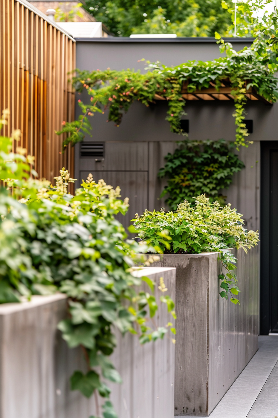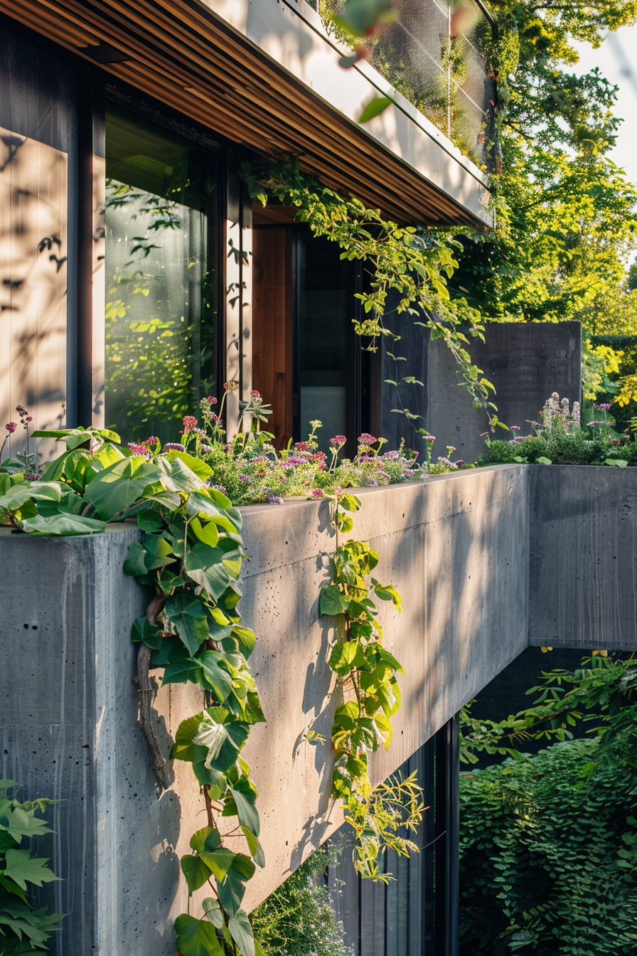 This elevated terrace mixes clean concrete lines with trailing plants that spill over the edges.