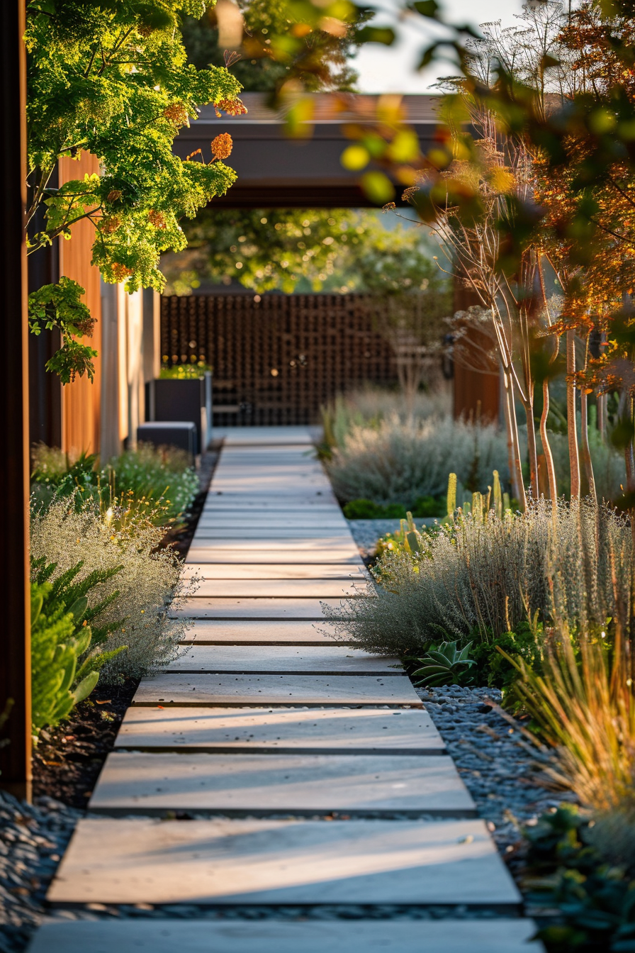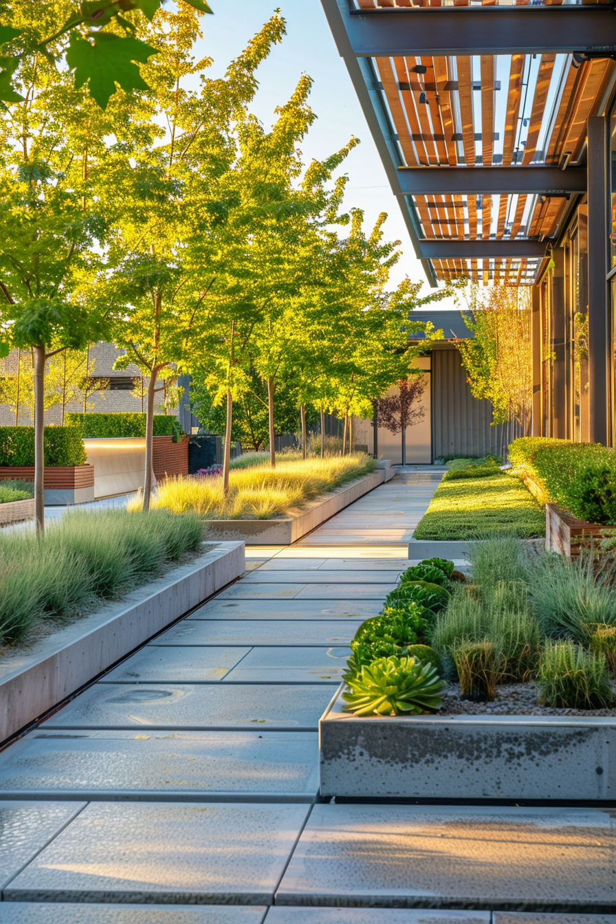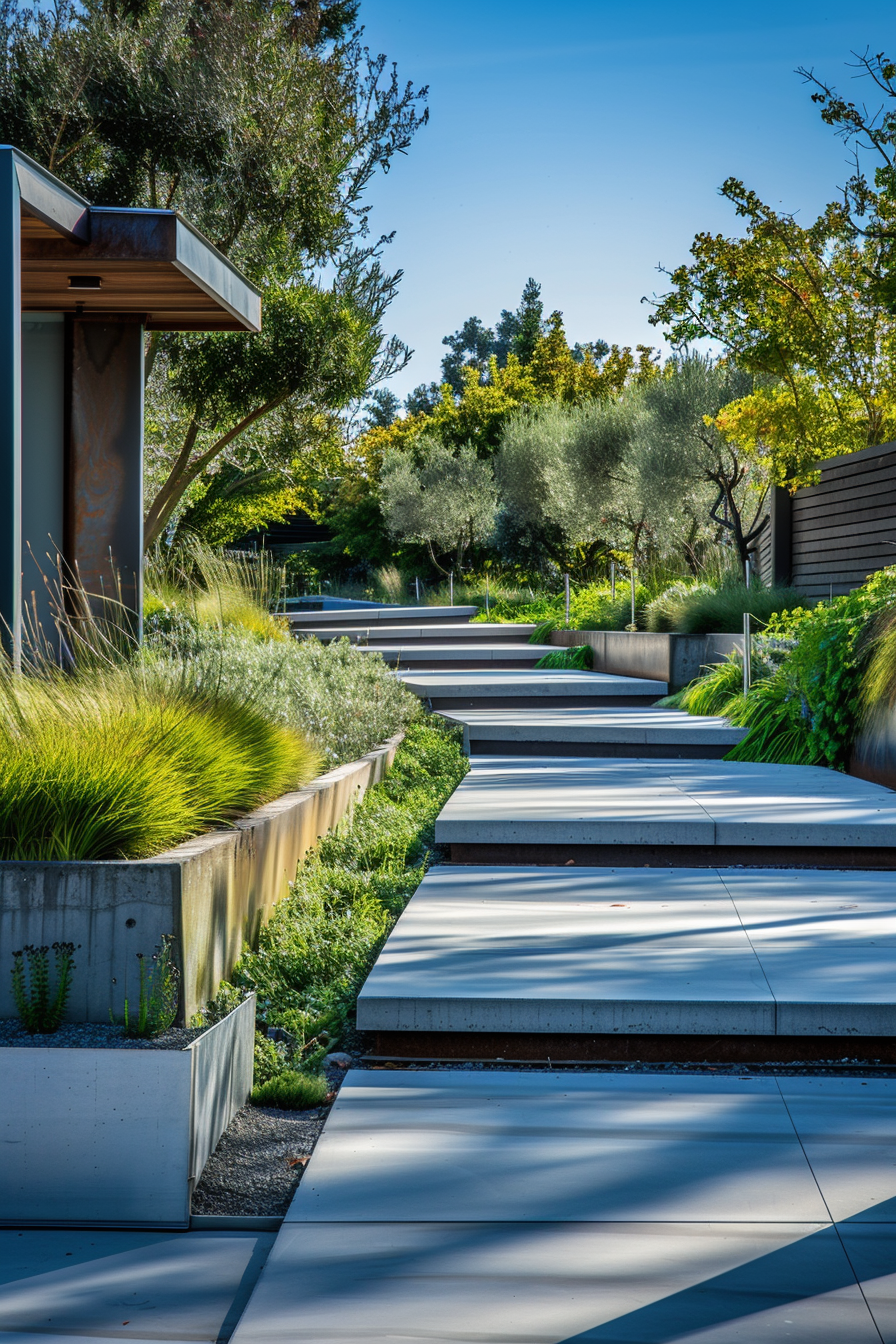 This walkway is all about clean lines and geometric shapes, with concrete paving and elevated terraces.