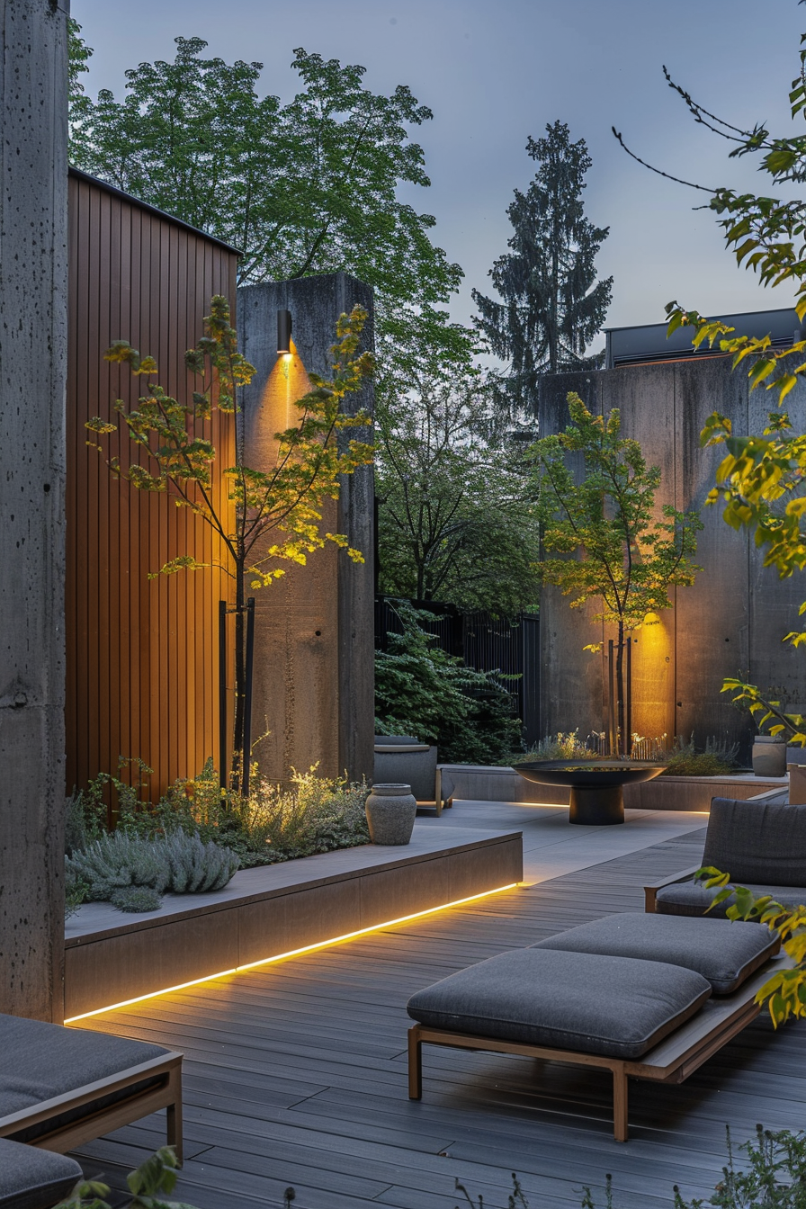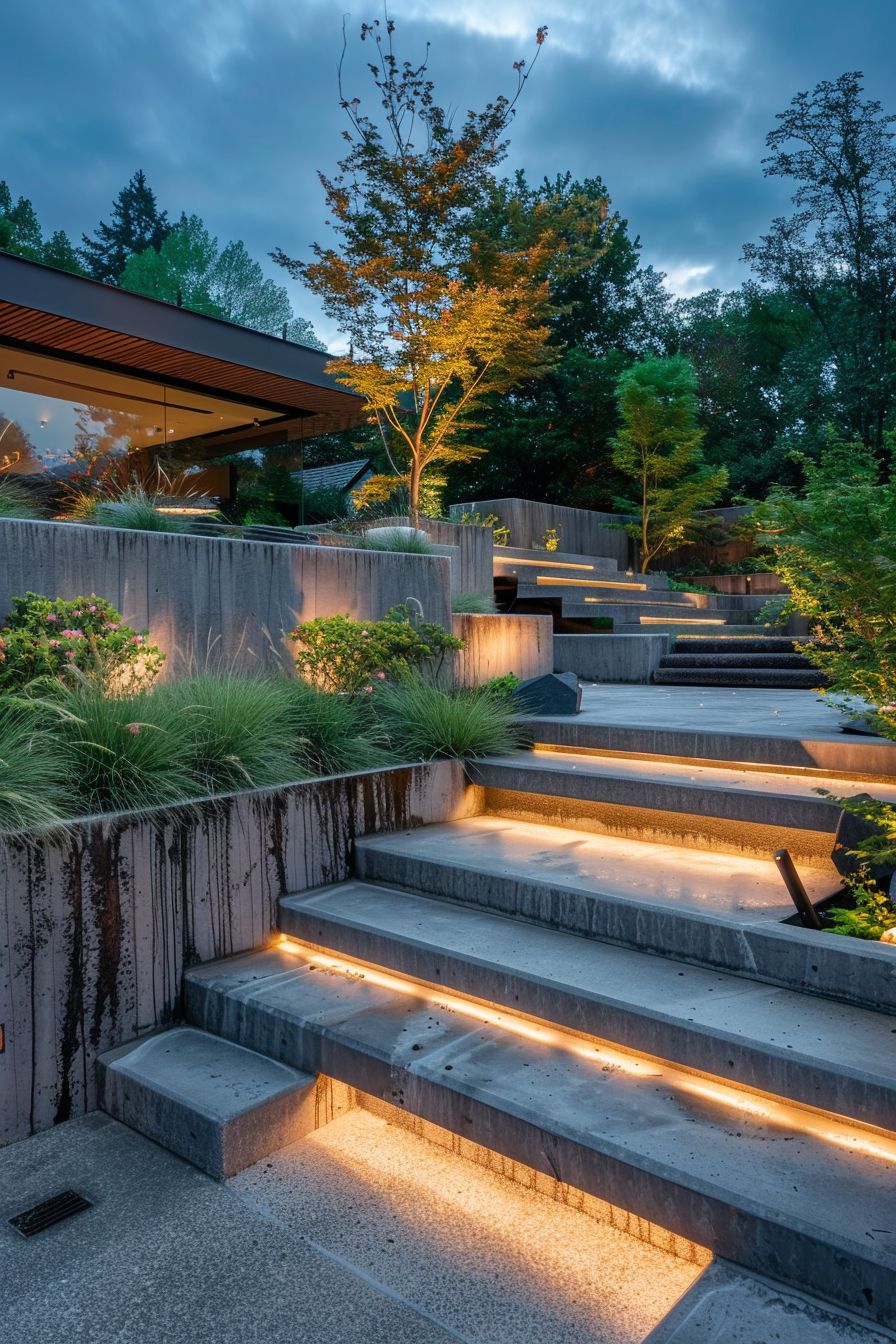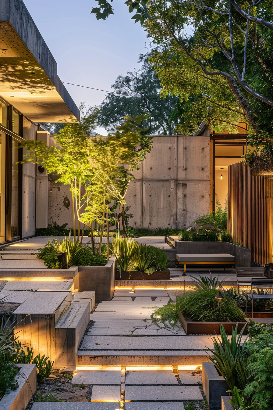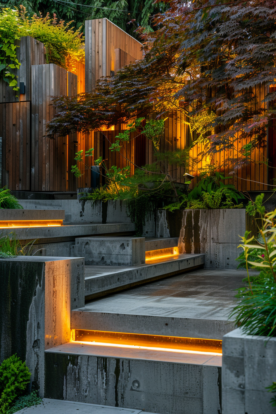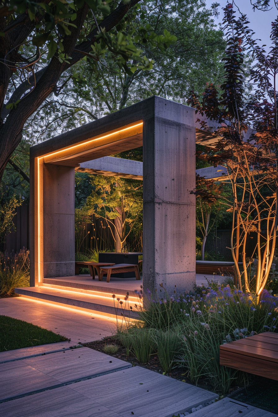 Massive concrete structures define this garden, but hidden lighting softens the look at night. The glow highlights the sharp angles and textures, creating depth and a cool, modern vibe.