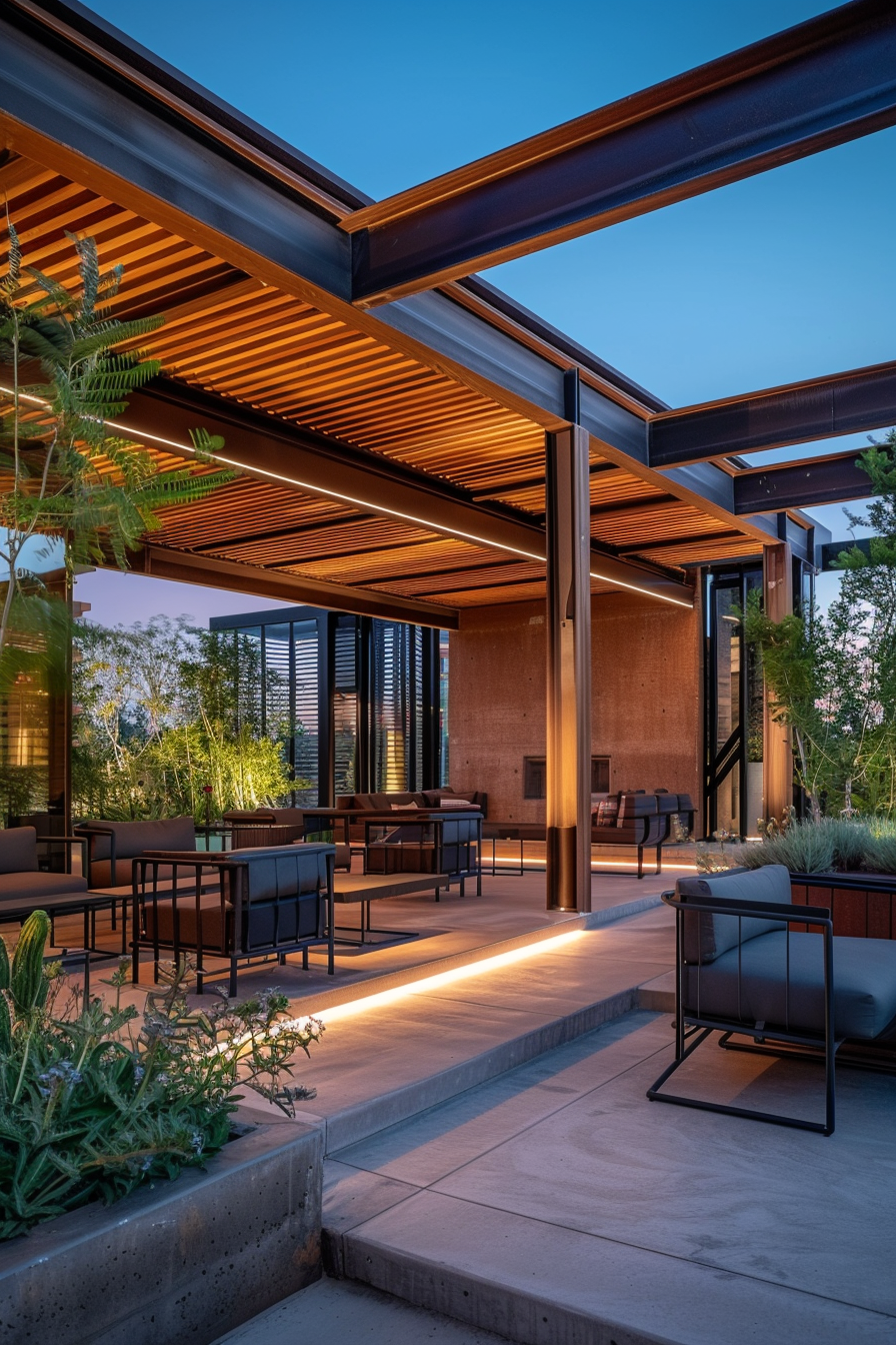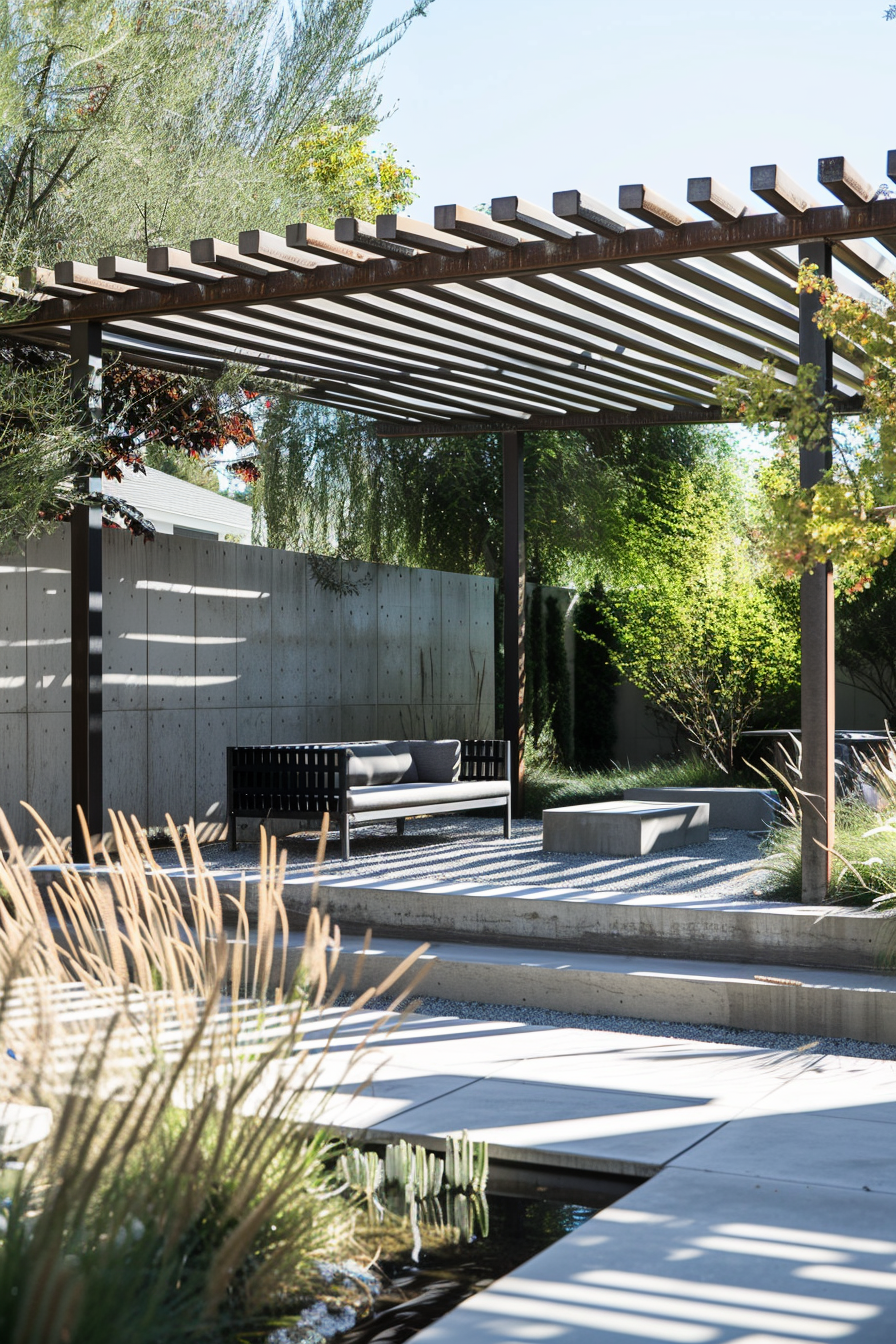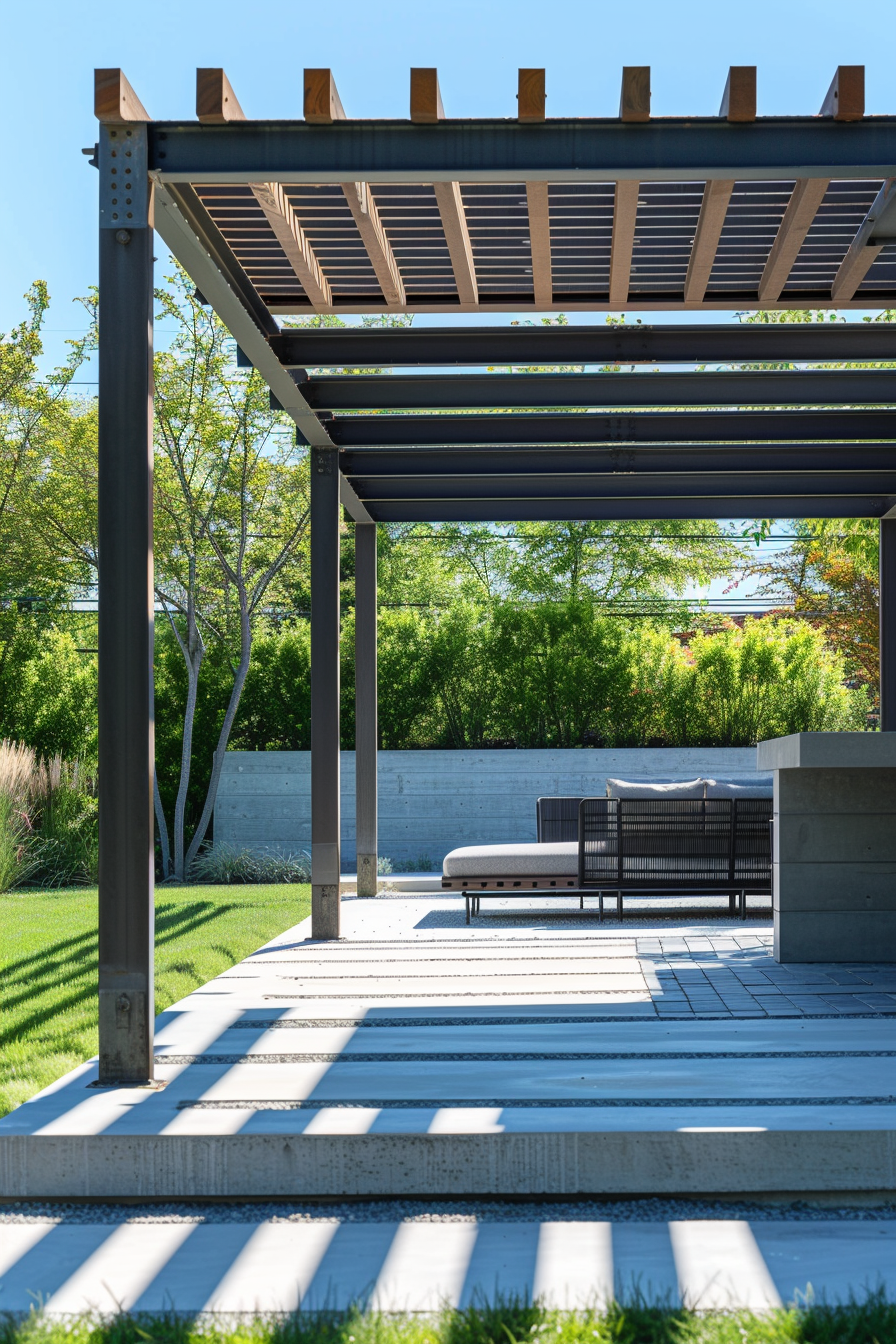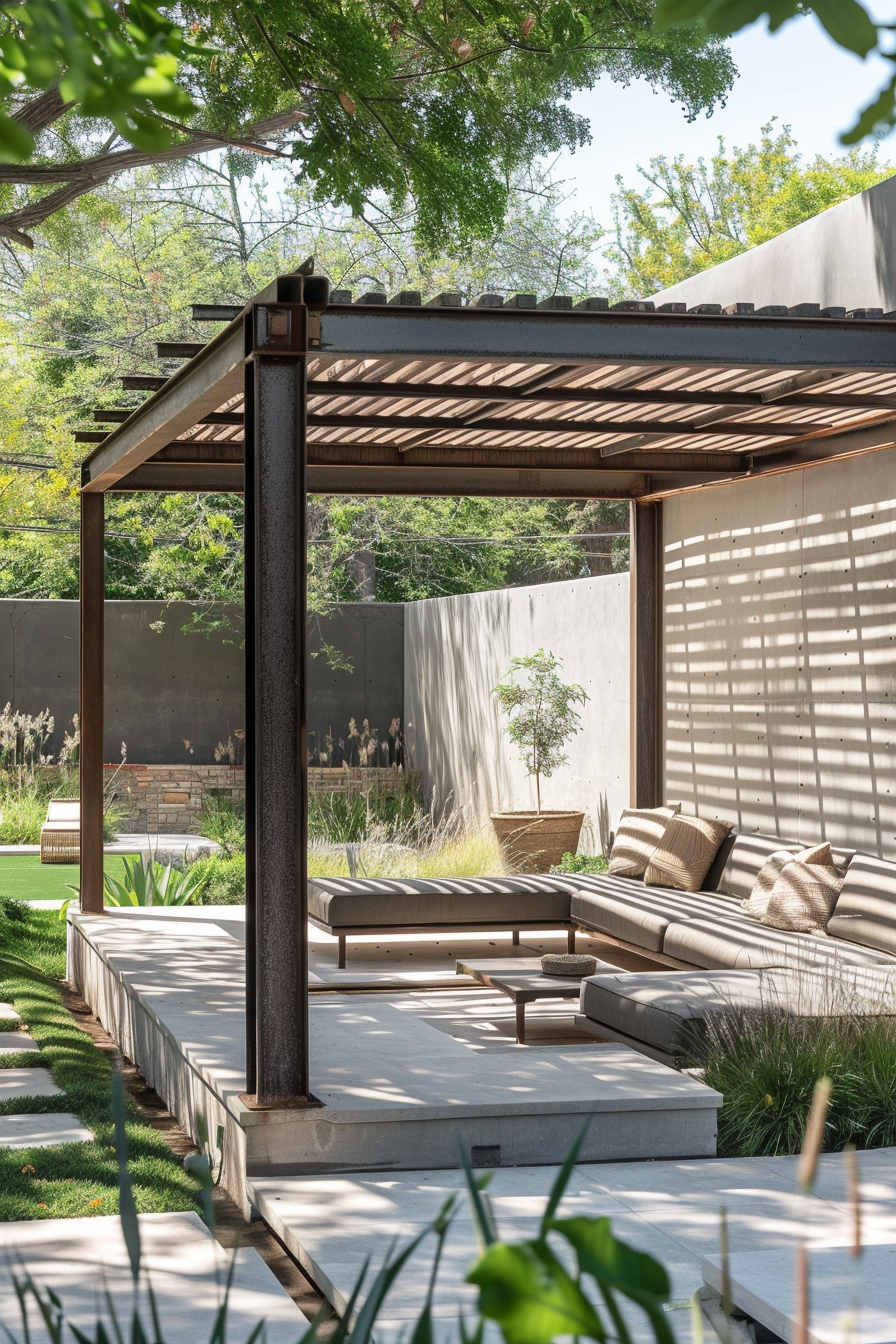 A steel pergola shades a concrete patio, casting cool shadows throughout the day. The mix of raw textures and clean lines creates a modern, tranquil spot to relax.