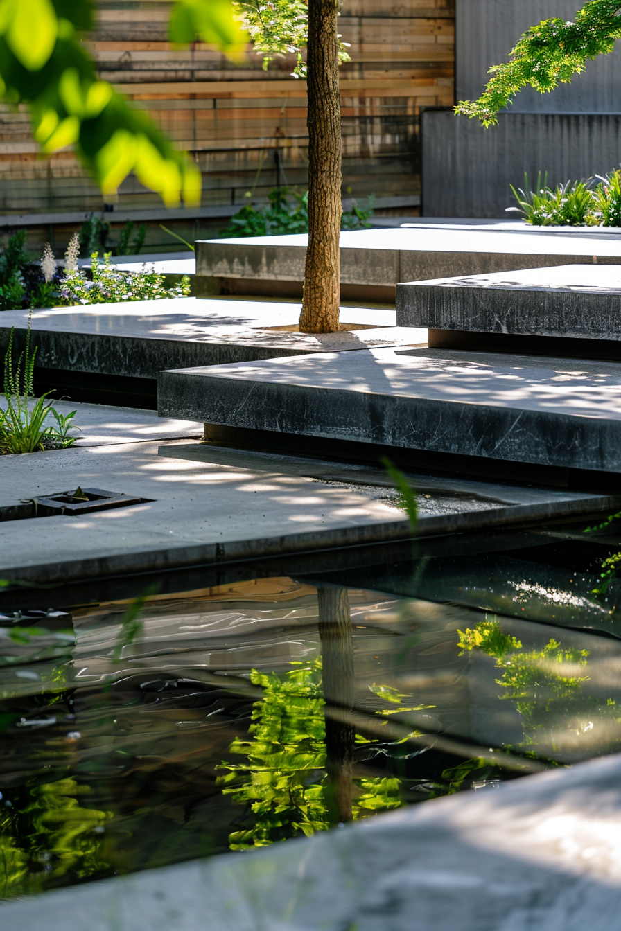 Geometric steps lead to a central water feature, with sharp angles casting cool shadows throughout the day.