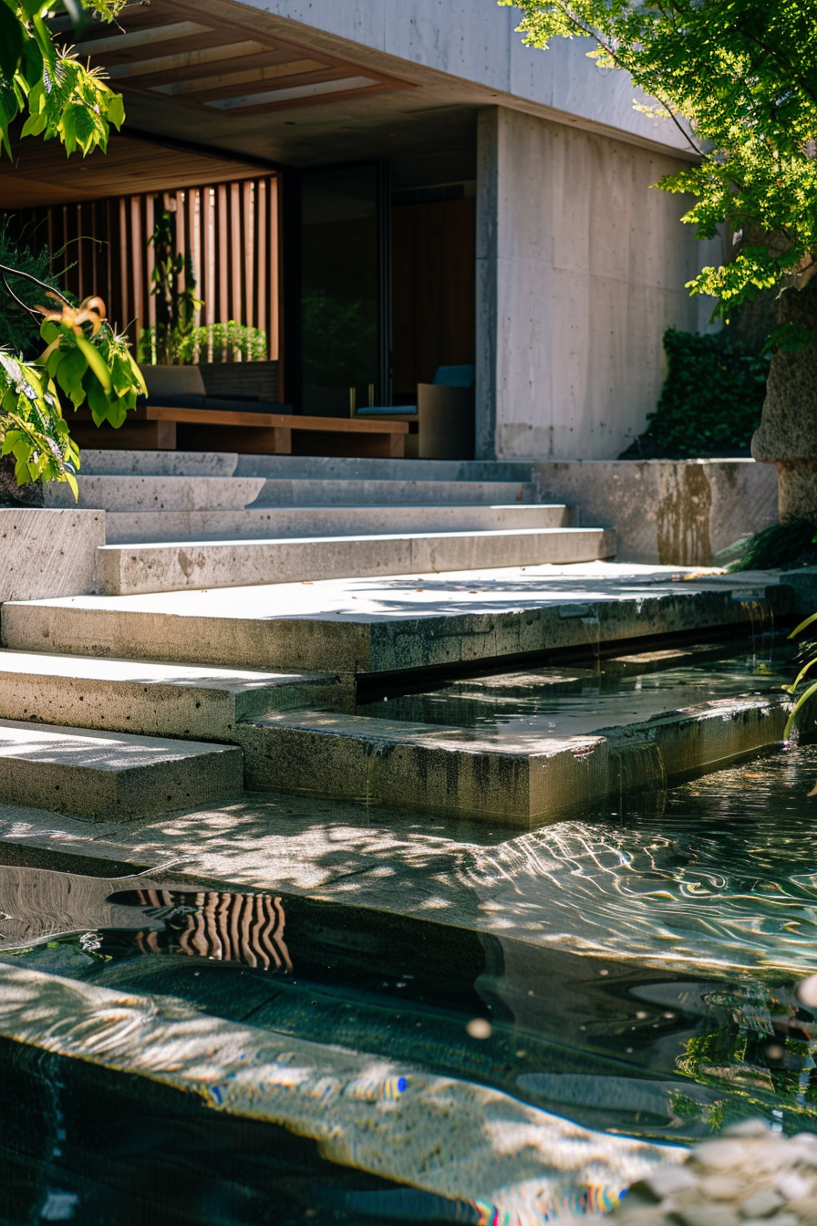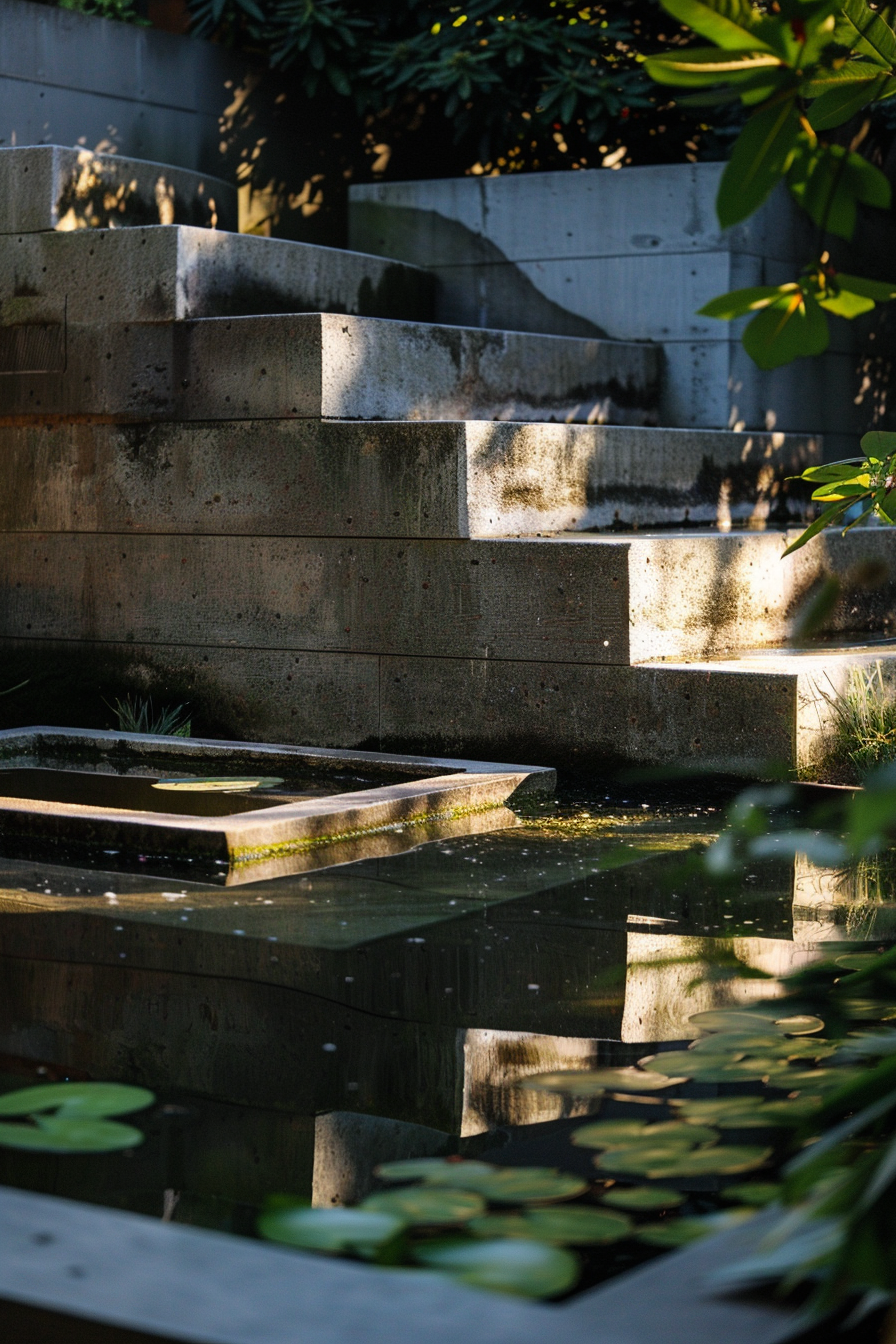 The mix of concrete and water creates a dynamic yet peaceful space that changes with the light.