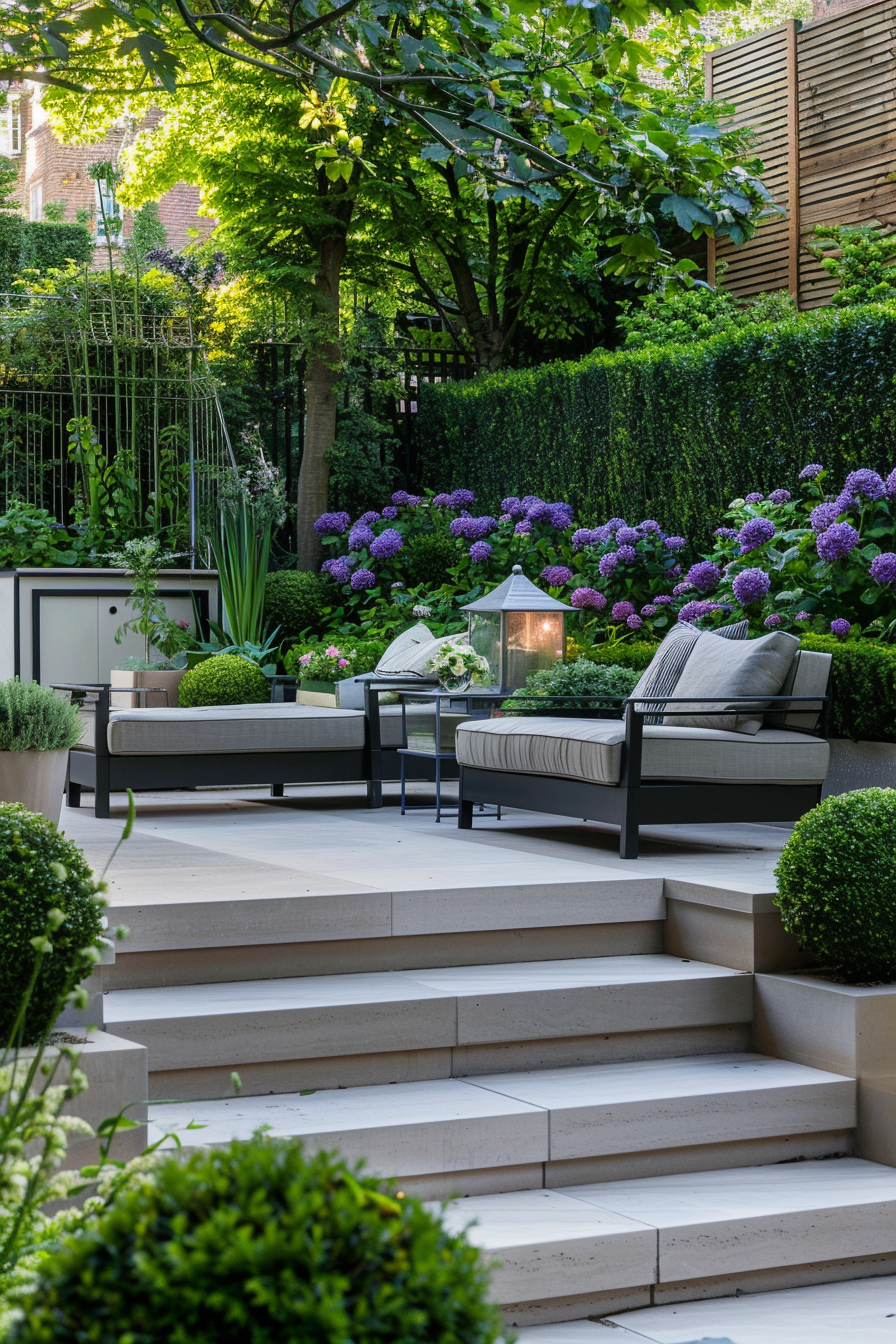 This patio is all about clean lines and geometric shapes, with concrete slabs and low-maintenance plants along the edges. It’s sleek, modern, and easy to care for.. perfect for a fuss-free outdoor space.