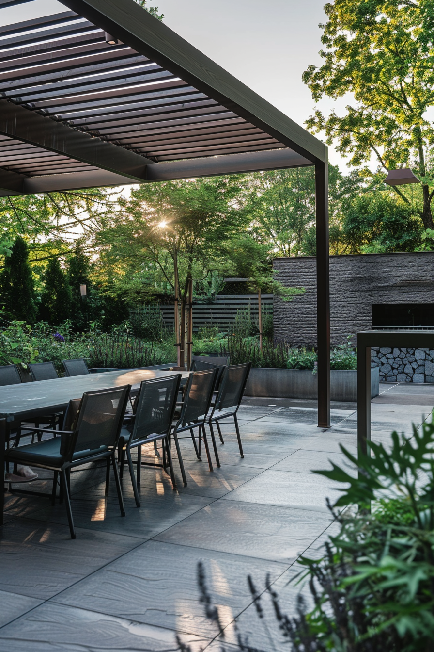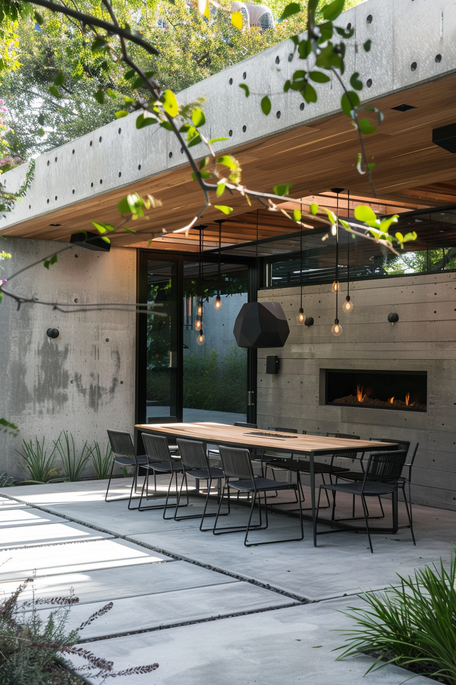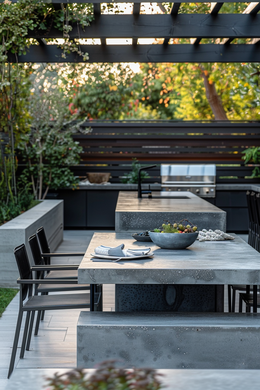 This sleek dining area combines concrete and stone for a bold, modern look. The black-and-white palette keeps things simple, while clean lines and subtle textures add depth. It’s a stylish spot for outdoor meals.