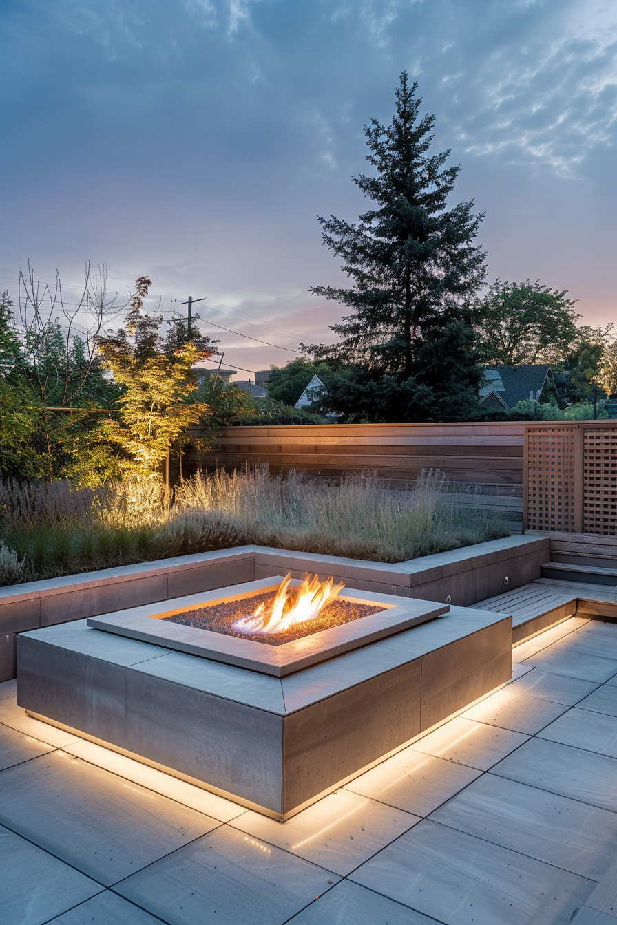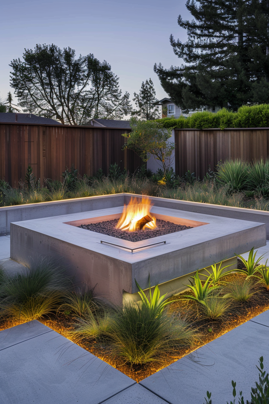 A recessed fire pit sits at the centre of a geometric seating area, surrounded by smooth concrete and subtle greenery.