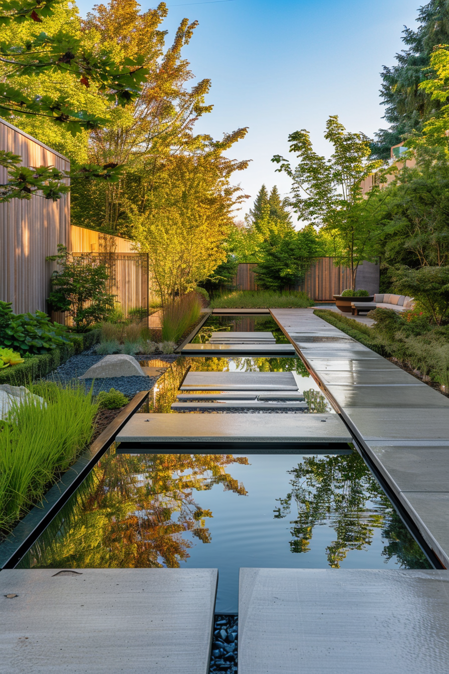 A still water feature reflects clean geometric shapes, adding a peaceful vibe to this minimalist garden.