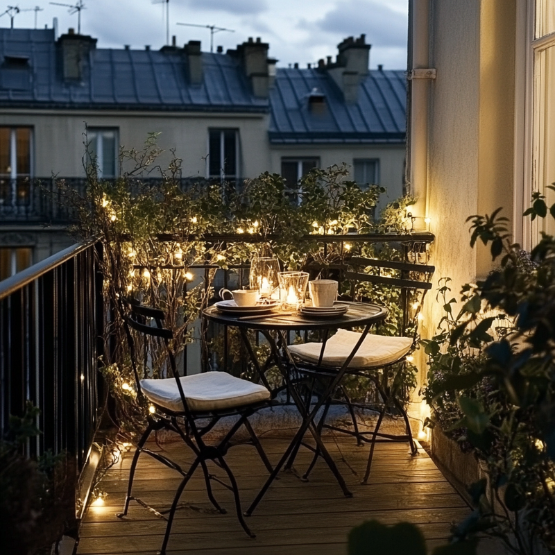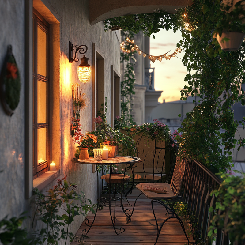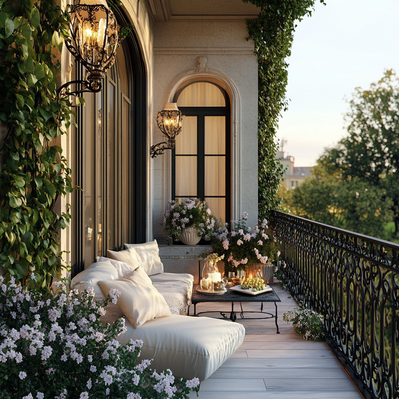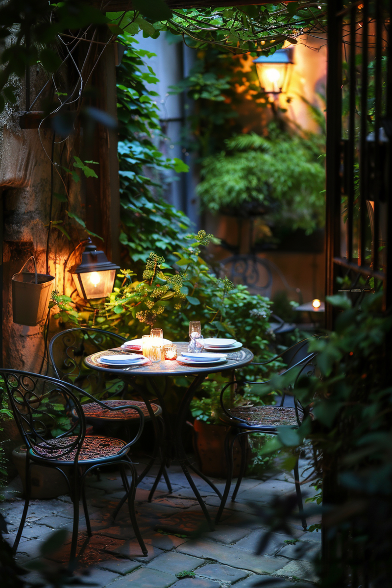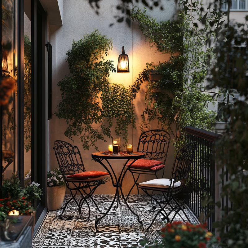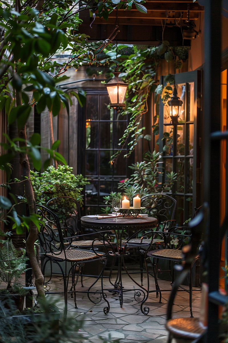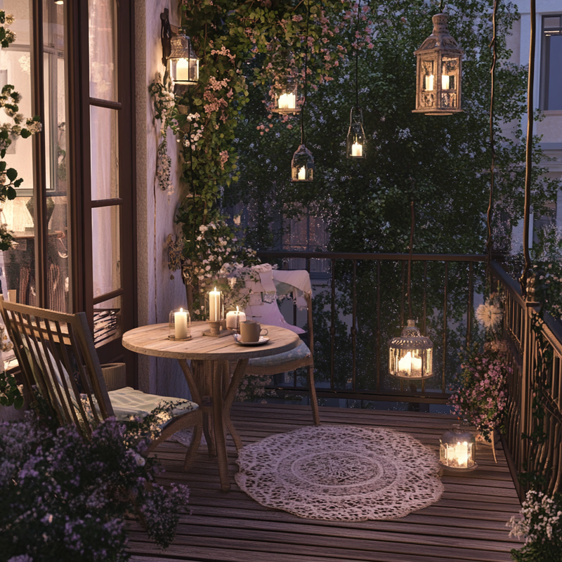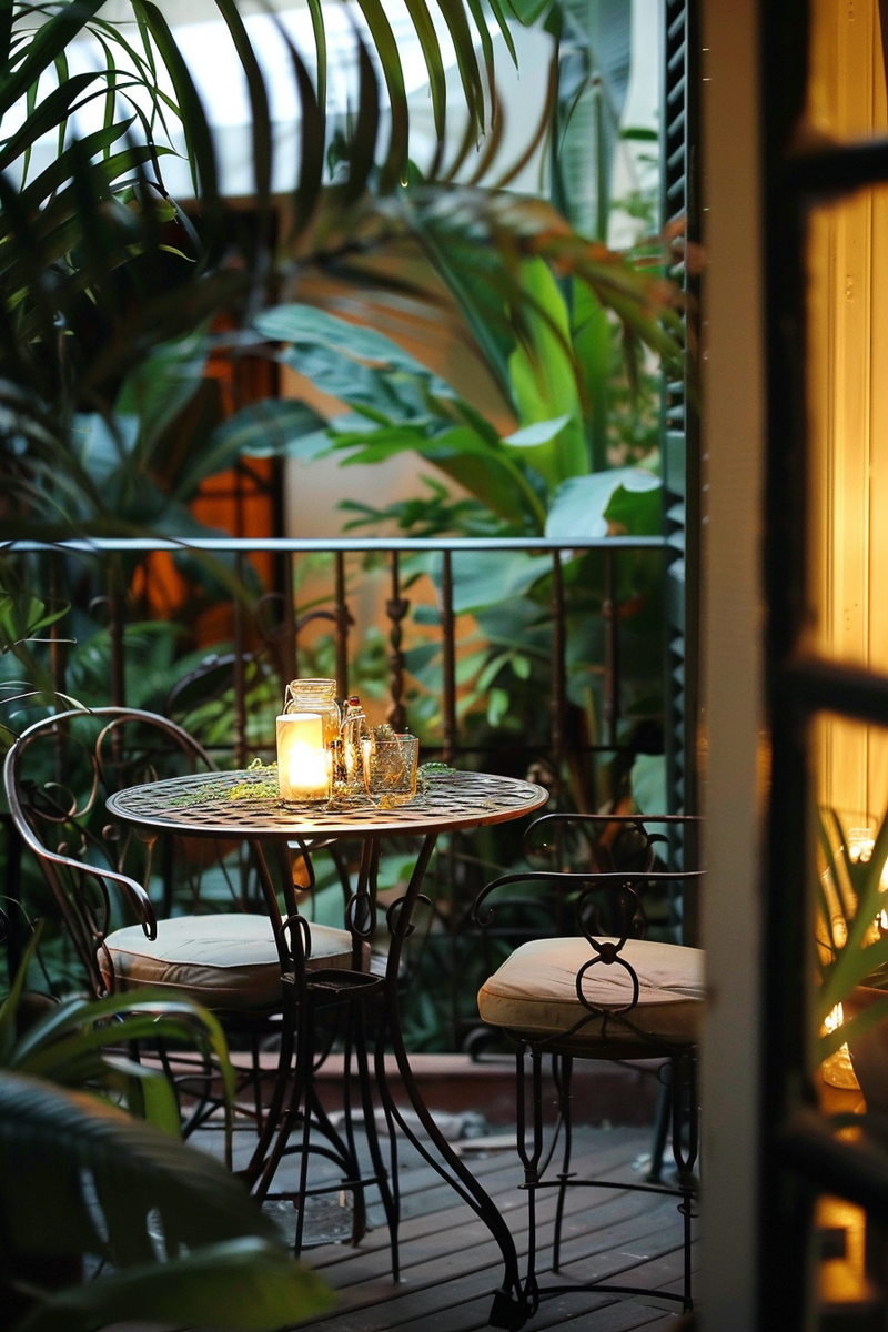 A Parisian-style balcony offers intimate outdoor seating with soft candlelight flickering beside wrought-iron chairs. Lanterns cast a warm glow over ornamental details, enhancing the café ambiance. Lush greenery frames the space, creating a cozy retreat perfect for quiet evenings. The thoughtful design transforms a small corner into a charming escape.