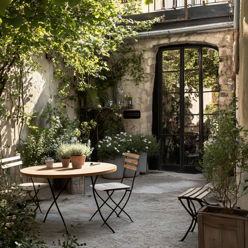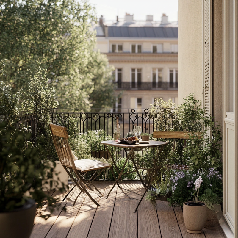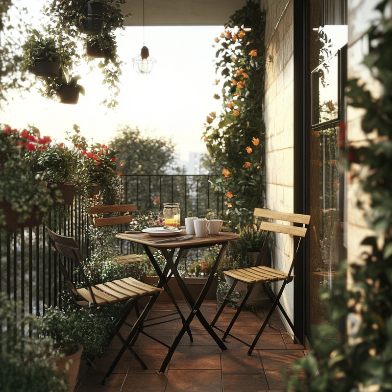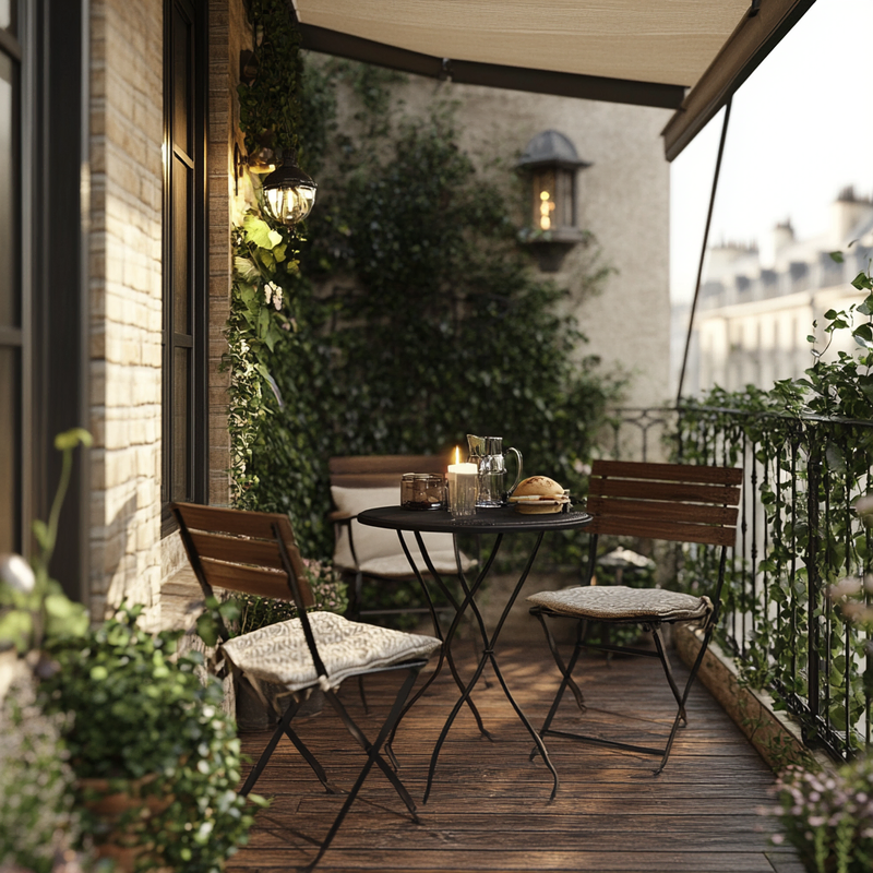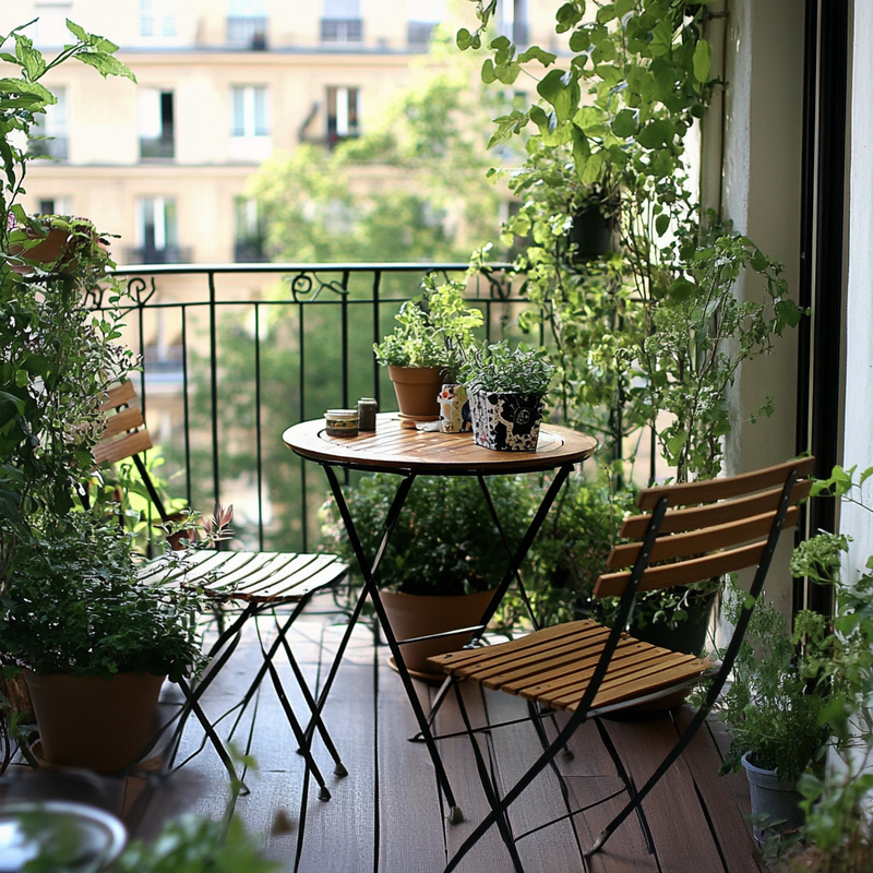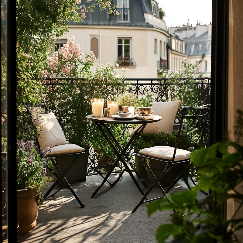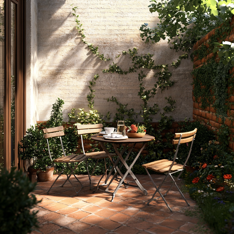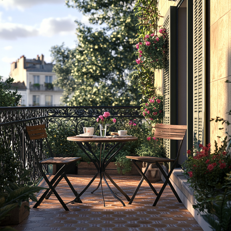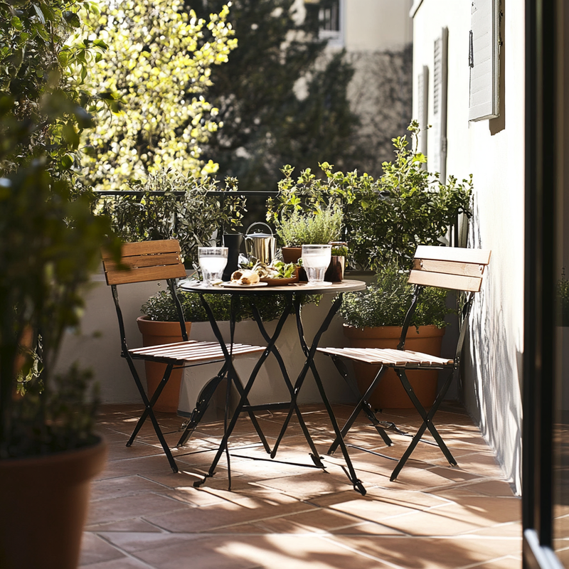 A cozy outdoor seating area embraces Parisian style with a folding bistro set placed on warm terracotta tiles. Thoughtful space maximization ensures a functional dining nook, perfect for morning coffee or evening meals. Surrounded by potted greenery, this inviting retreat blends charm and practicality in a compact yet elegant design.
