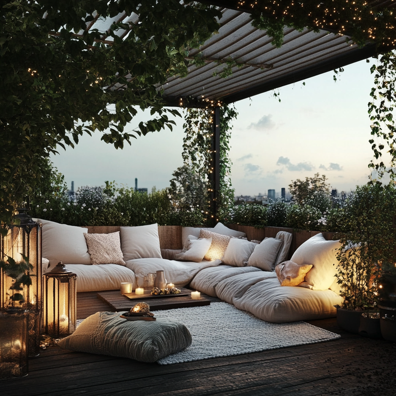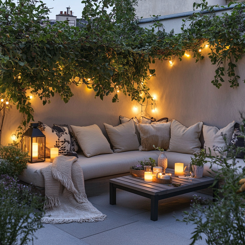 An inviting outdoor seating area blends soft textiles with decorative lighting for a warm, relaxing retreat. Plush cushions and throw blankets add comfort, while accent colors enhance the cozy feel.