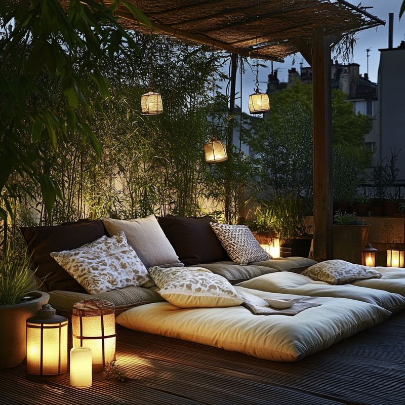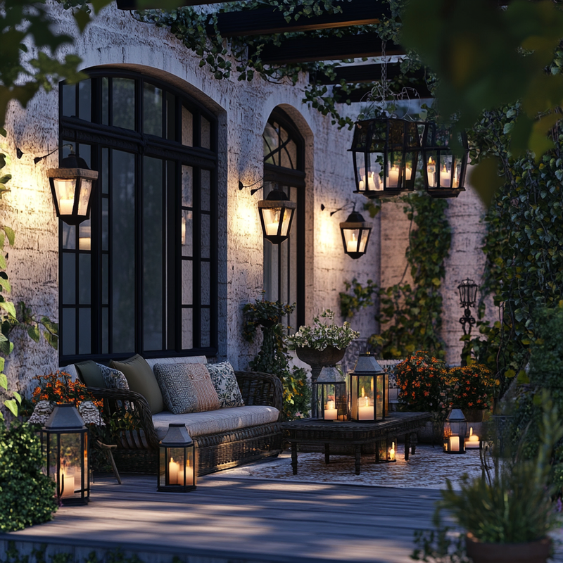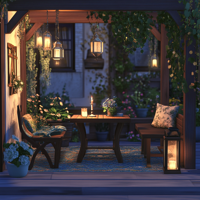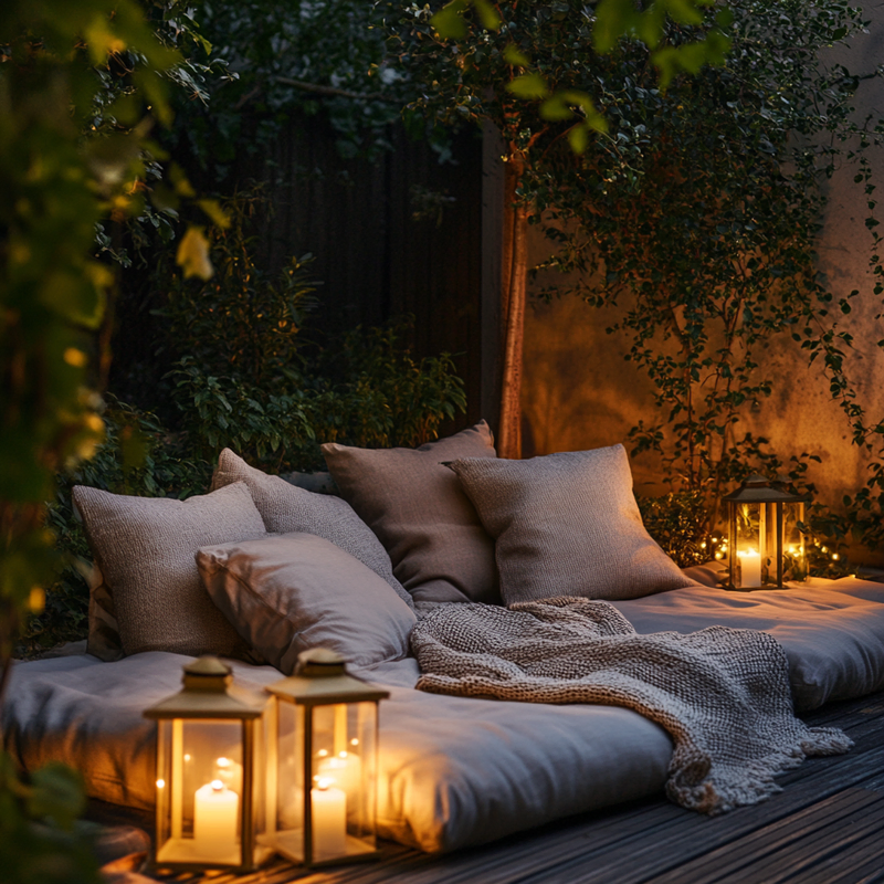 Warm-toned lanterns cast a gentle glow, creating a tranquil space perfect for unwinding in the evening light.
