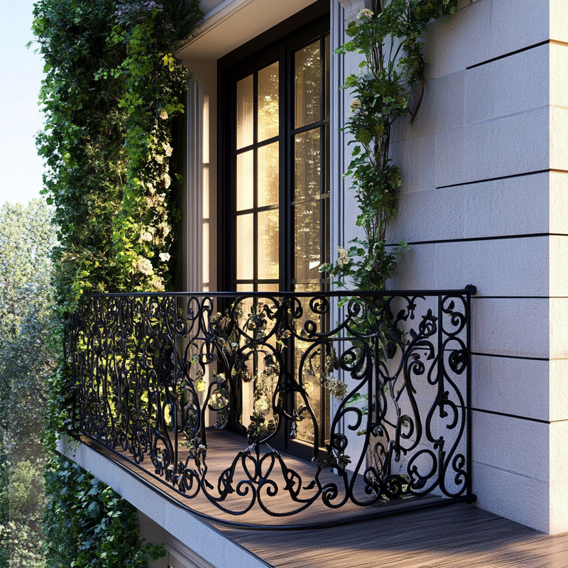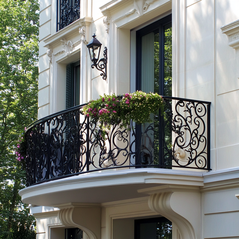 A Parisian-style balcony features intricate wrought iron railings adorned with ornamental details