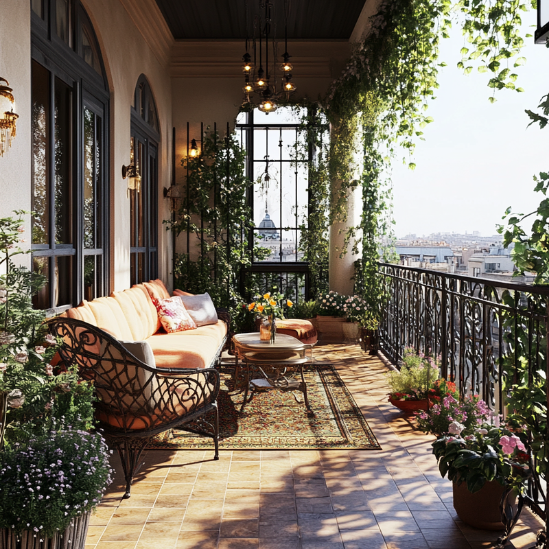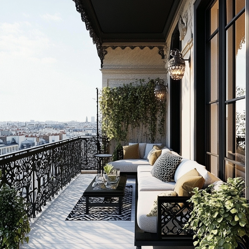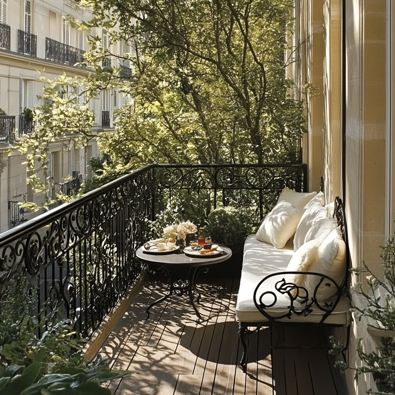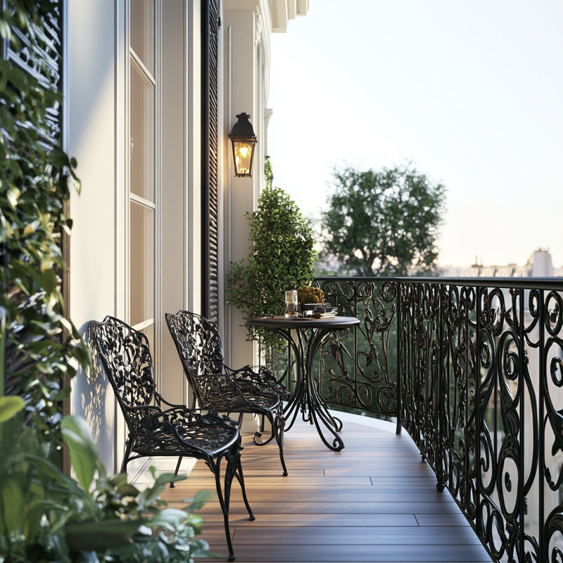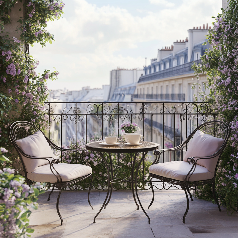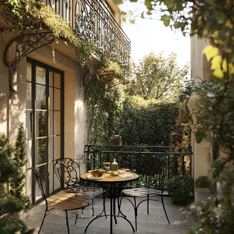 A compact balcony embraces Parisian style with wrought iron railings framing the space. Antique bistro chairs and a marble-topped table evoke a café ambiance, while ornamental details add timeless charm. Potted lavender and ivy soften the edges, creating a serene retreat reminiscent of a quiet morning in Paris.