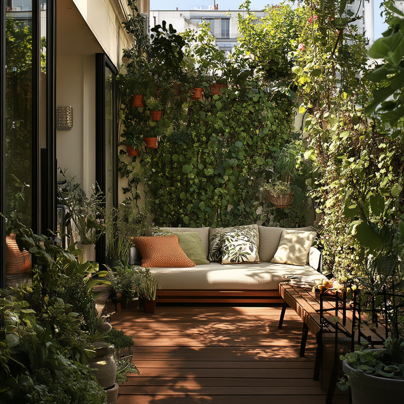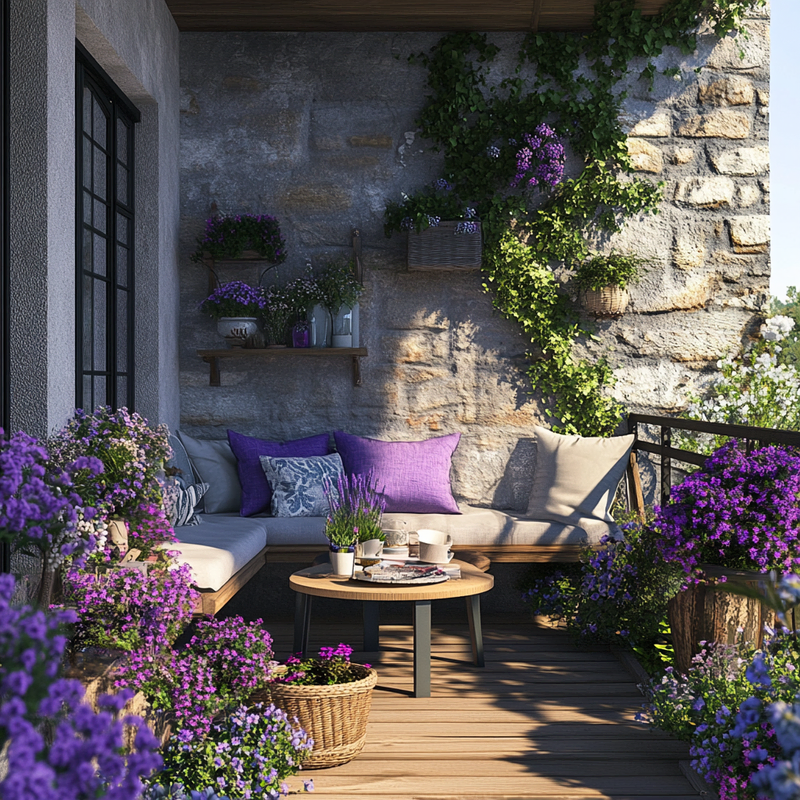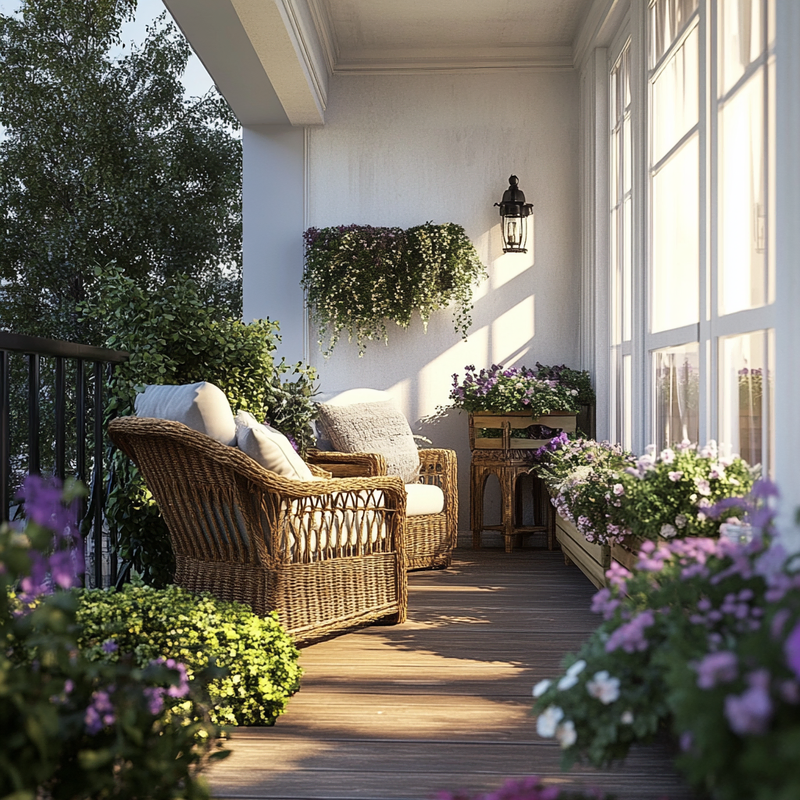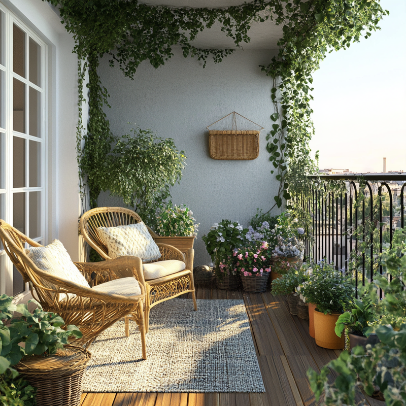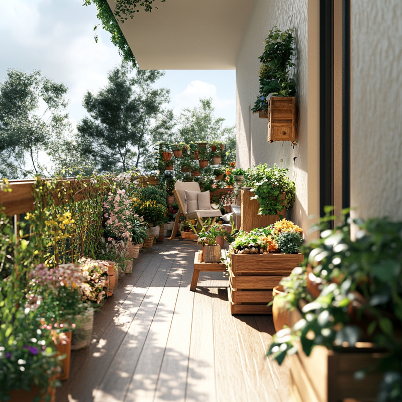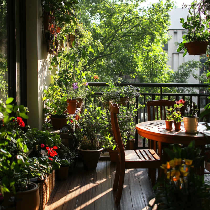 A peaceful balcony garden overflows with vibrant container gardening arrangements, transforming the small space into a lush retreat. Carefully placed balcony plants add layers of greenery, while vertical gardening elements maximize height. Thoughtful ornamental details enhance the serene atmosphere, creating a nature-inspired sanctuary amid the city’s bustle.