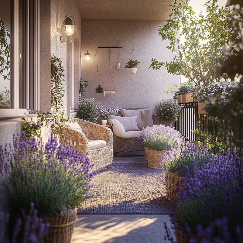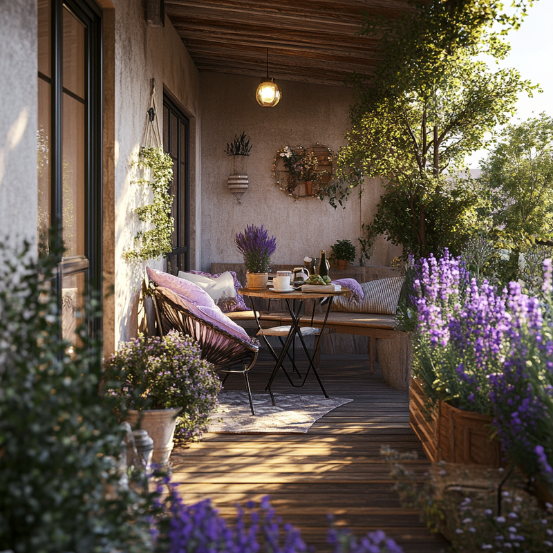 A cozy balcony nook features outdoor seating surrounded by lavender pots, creating a peaceful atmosphere. The small space design mimics a quaint café ambiance, where soft floral scents blend with the morning air. Sunlight filters through, highlighting the gentle greenery and inviting quiet moments of relaxation with a warm drink.