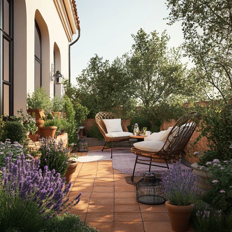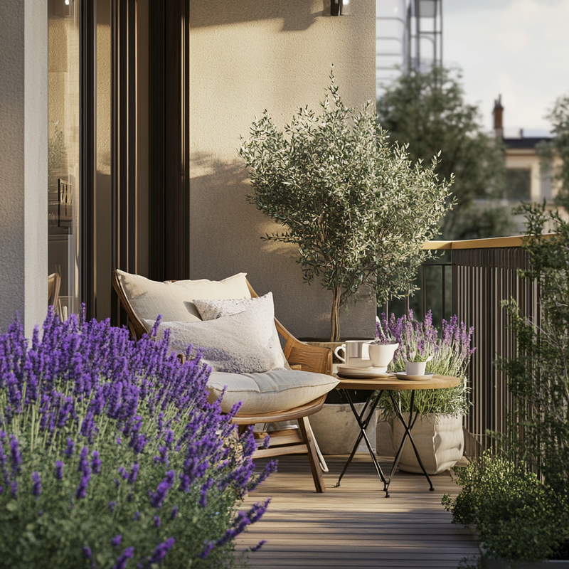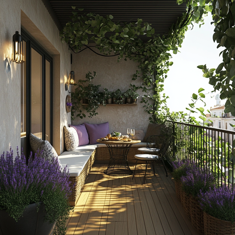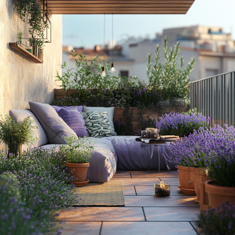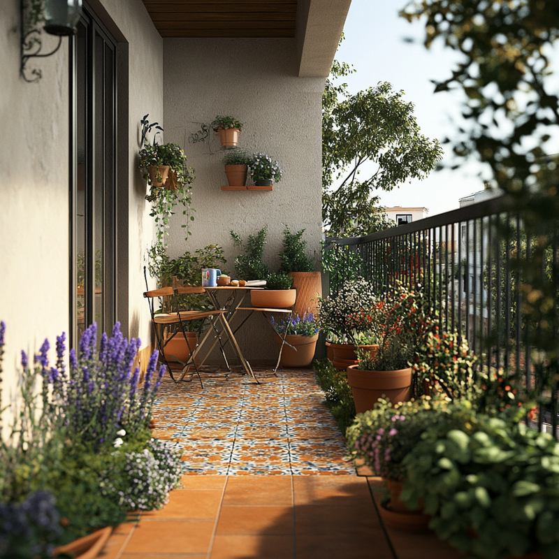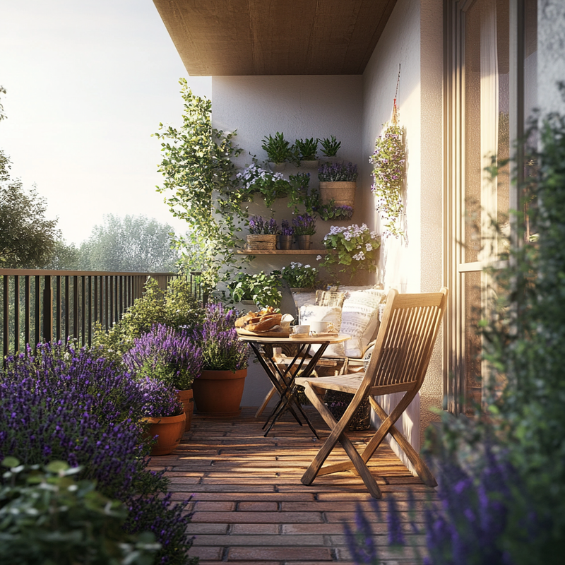 A compact balcony features outdoor seating on warm terracotta tiles, surrounded by lush balcony plants. Lavender pots release a soothing fragrance, enhancing the airy morning ambiance. Sunlight filters through, casting soft shadows as the inviting nook becomes a peaceful spot to enjoy breakfast while immersed in greenery and gentle scents.