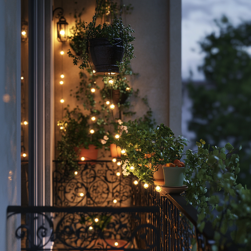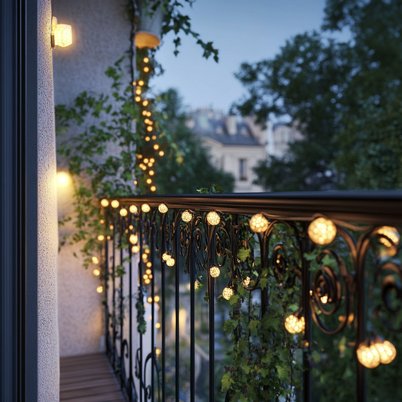 A cozy balcony glows with decorative lighting as twinkling light strings drape over wrought iron railings. The geometric patterns of the railings cast soft shadows, enhancing the intimate ambiance. Gentle illumination highlights potted greenery, creating a serene retreat where warm lighting and intricate metalwork blend seamlessly for a peaceful evening escape.