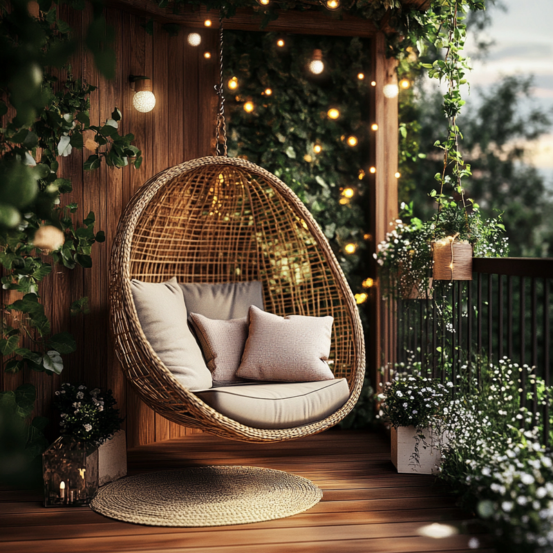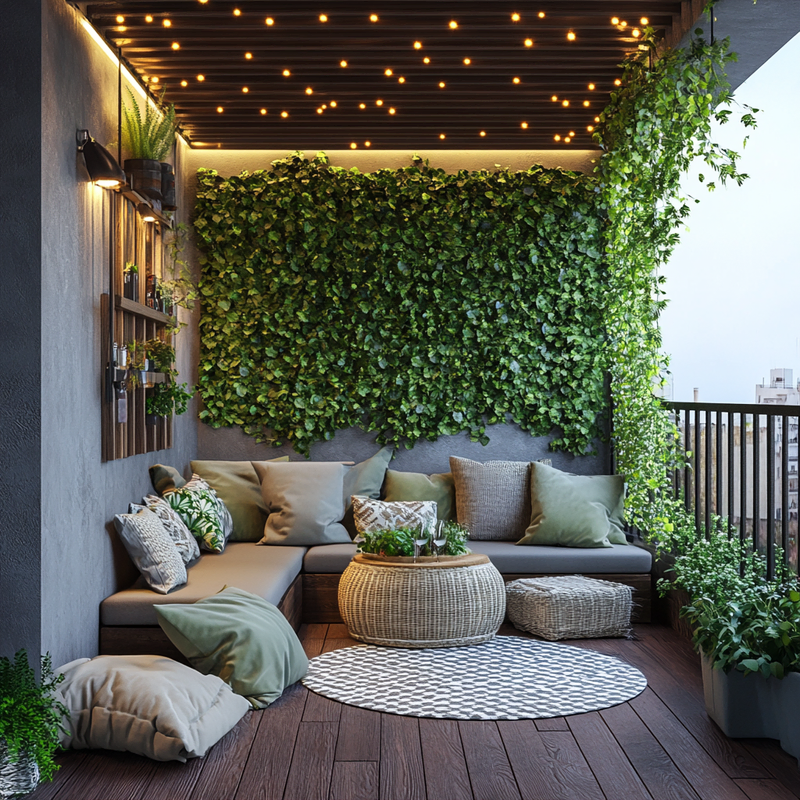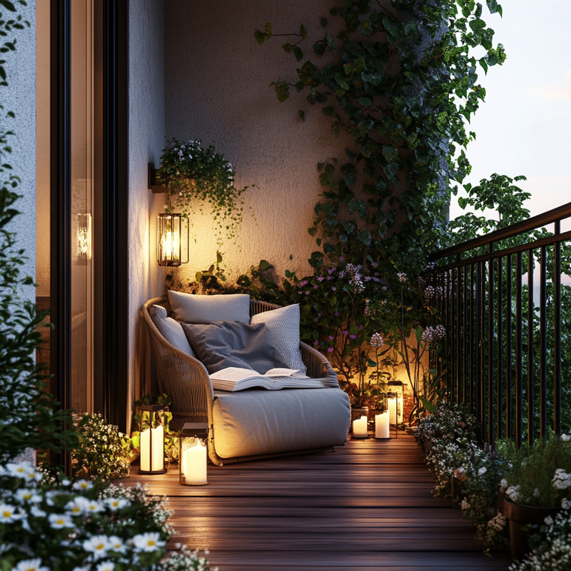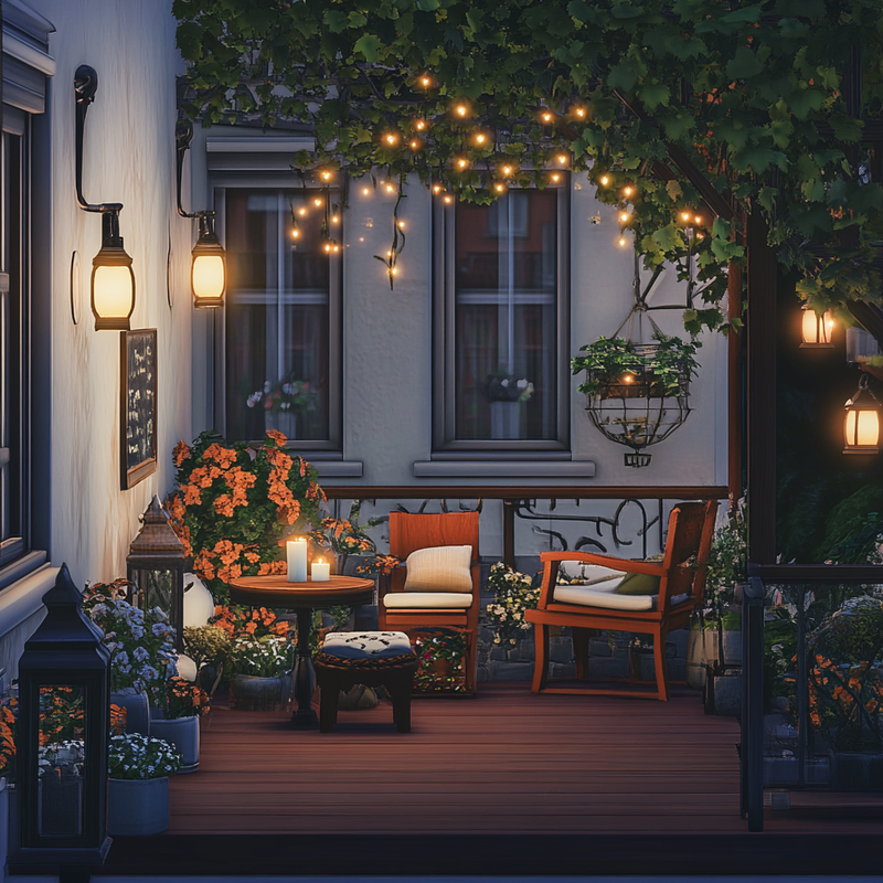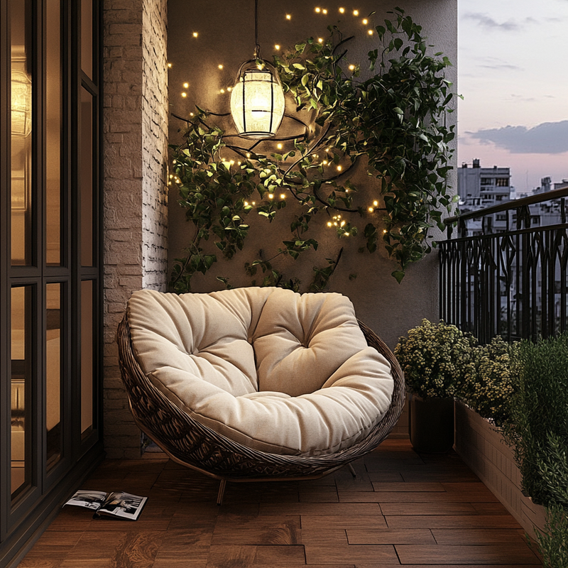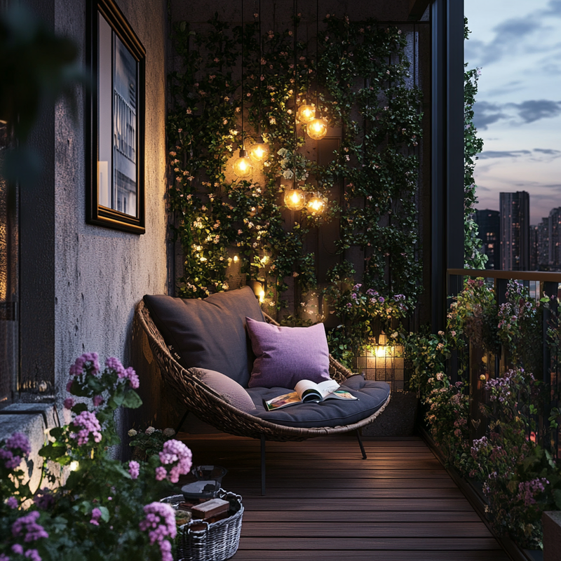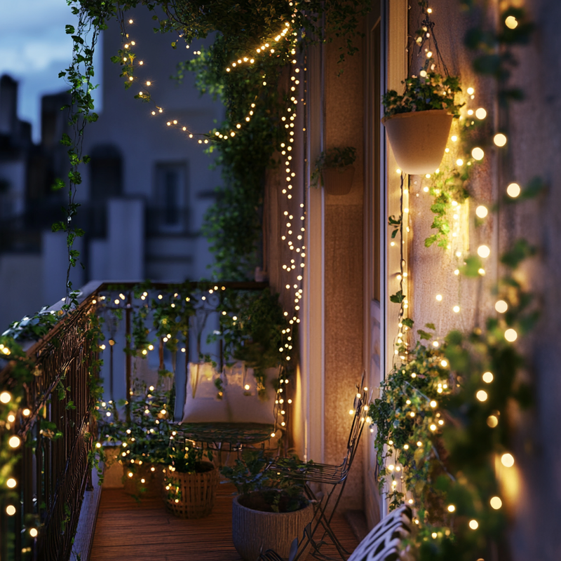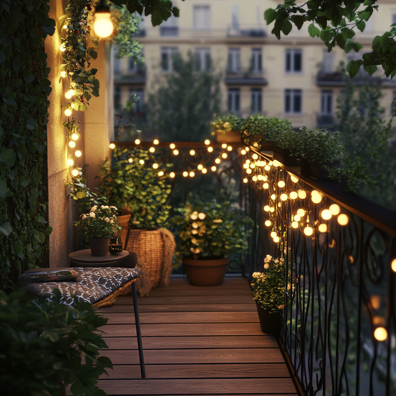 A cozy balcony retreat blends decorative lighting with lush balcony plants, creating a vibrant yet peaceful space. Accent colors from patterned pillows and soft textiles add warmth, while artistic decor enhances the urban setting. The gentle glow of lights invites relaxation, making this small sanctuary perfect for unwinding in style.