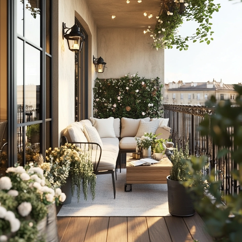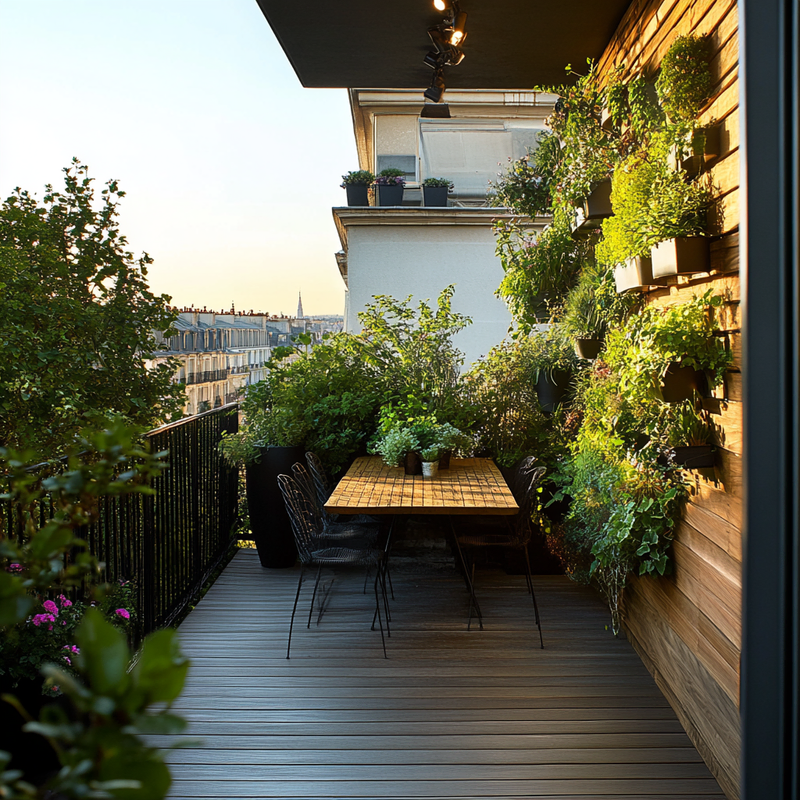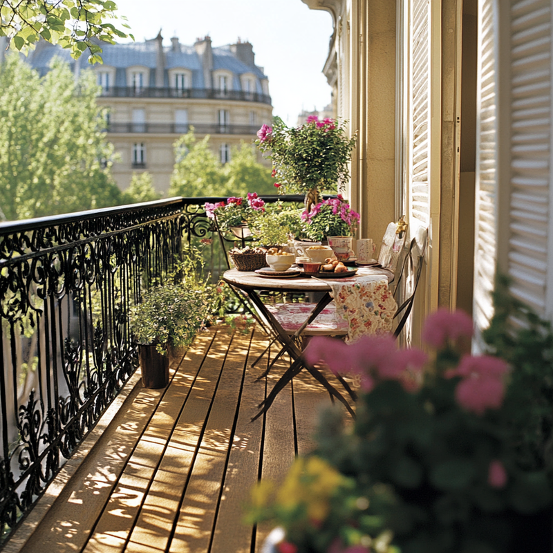 A charming balcony reflects Parisian style with wooden planters filled with lush greenery and soft pastel blooms. Container gardening enhances the small space, creating a cozy retreat. Subtle accent colors blend with natural textures, while trailing vines soften railings, completing a rustic, French country ambiance perfect for quiet moments outdoors.