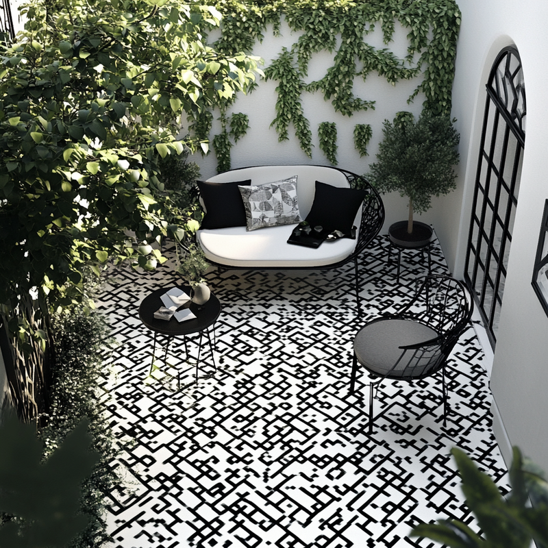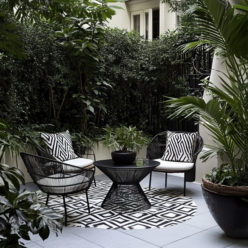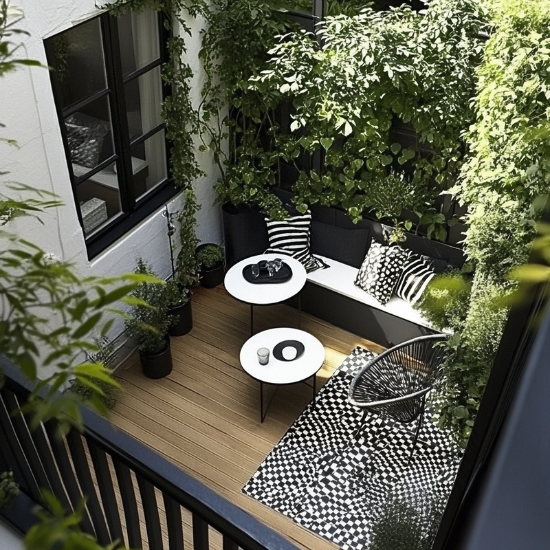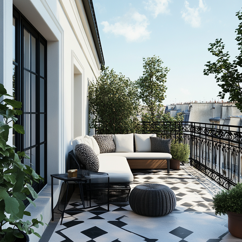 A Parisian-style balcony features sleek outdoor seating framed by bold geometric patterns. Black-and-white planters hold neatly trimmed greenery, while accent colors appear in scattered cushions and flowers. The compact space balances sophistication and comfort, offering a refined retreat that blends classic charm with modern design in a cohesive arrangement.