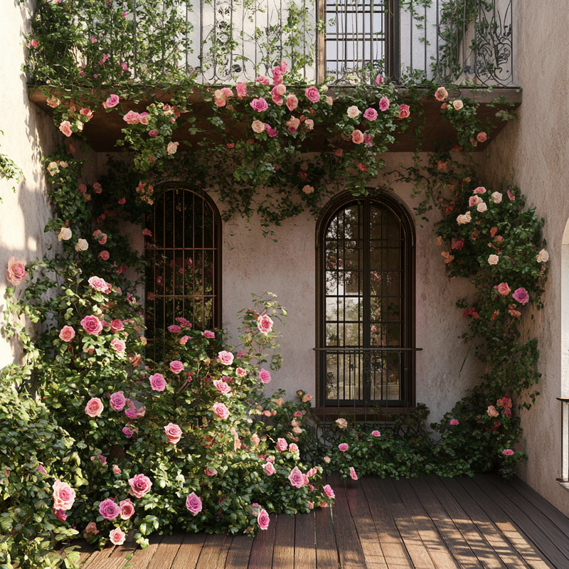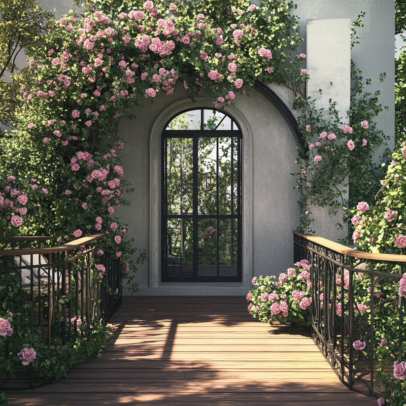 A secluded balcony sanctuary features lush balcony plants climbing elegant wrought iron railings. Climbing roses weave through the structure, creating a natural privacy screen that shields the space from view. The intimate setting provides a peaceful escape, where soft petals and greenery transform the small retreat into a quiet garden hideaway.