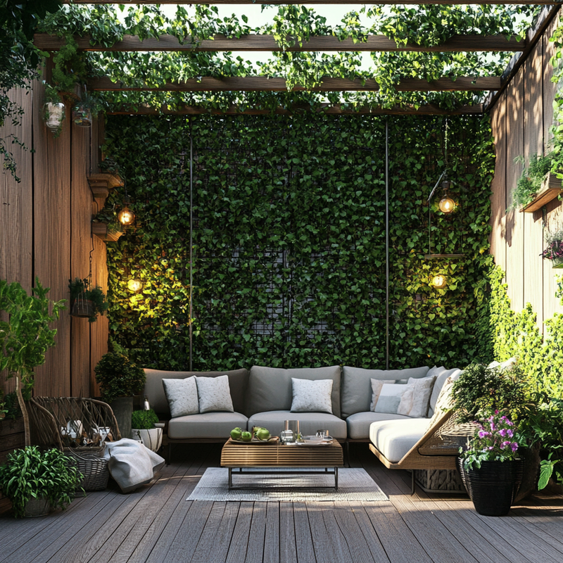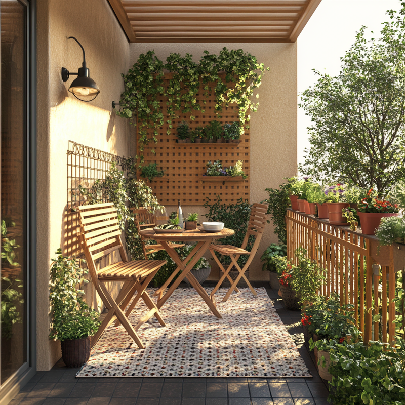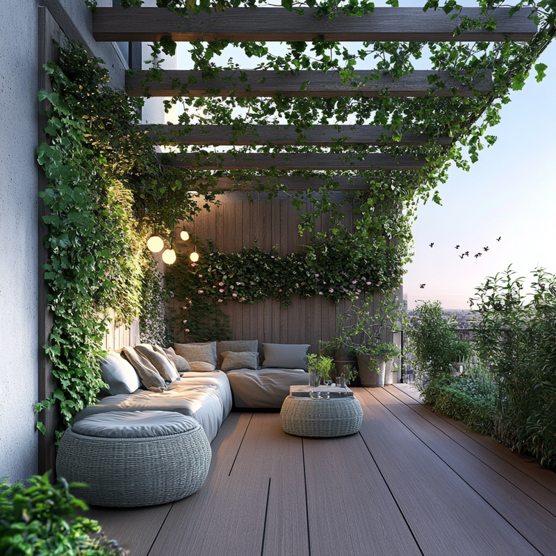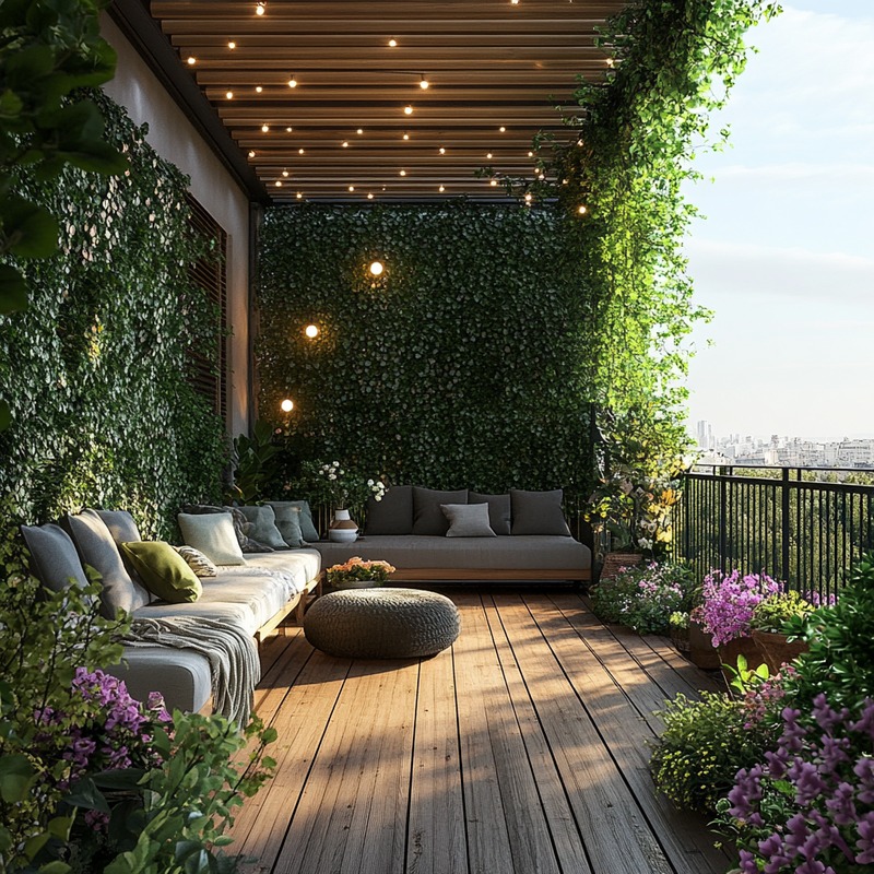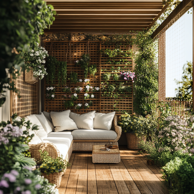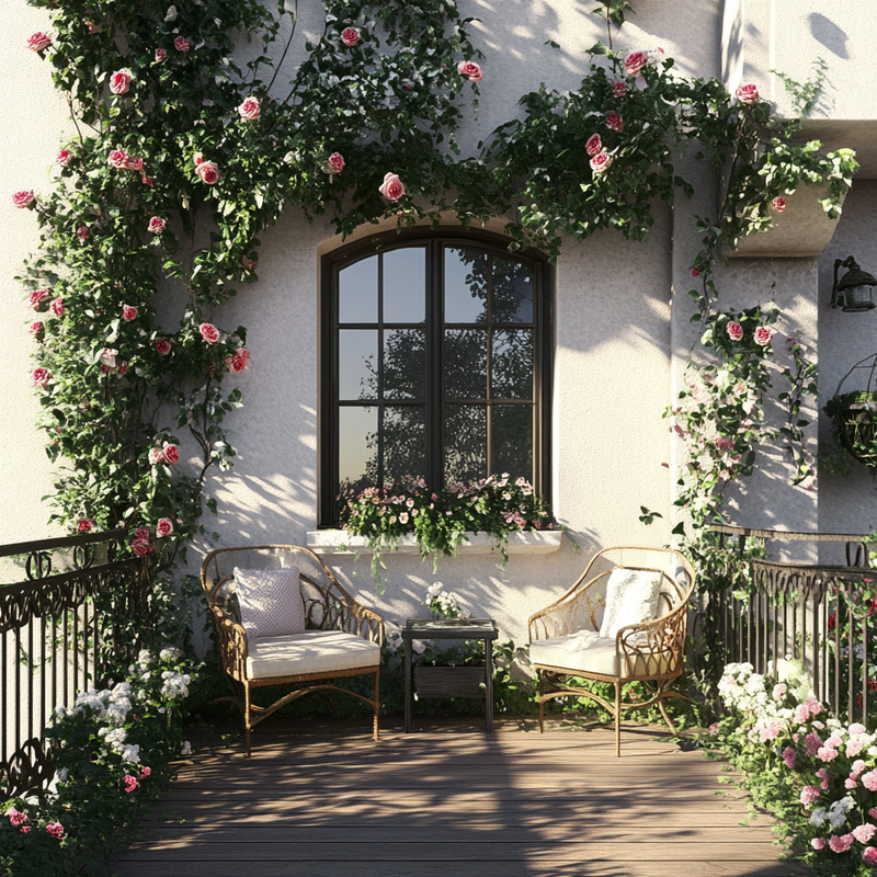 A compact balcony transforms into a lush retreat with vertical gardening techniques. Climbing roses weave through trellises, adding color and fragrance while enhancing privacy screens.