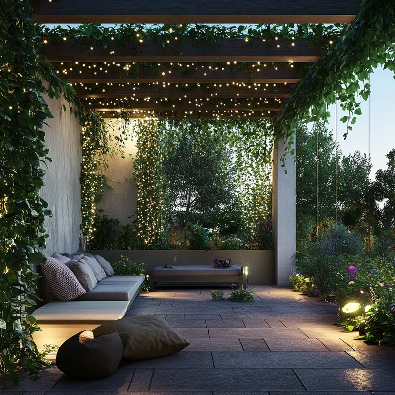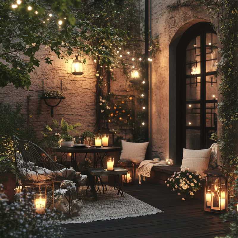 A peaceful garden nook glows with decorative lighting, casting a warm ambiance over the outdoor seating. Delicate light strings drape overhead, enhancing the romantic atmosphere. The gentle illumination highlights potted greenery, creating a serene retreat where soft shadows dance, and the night air invites quiet moments beneath the stars.