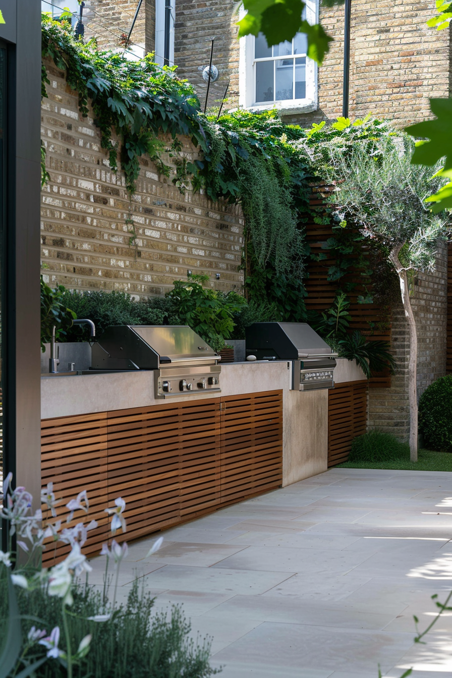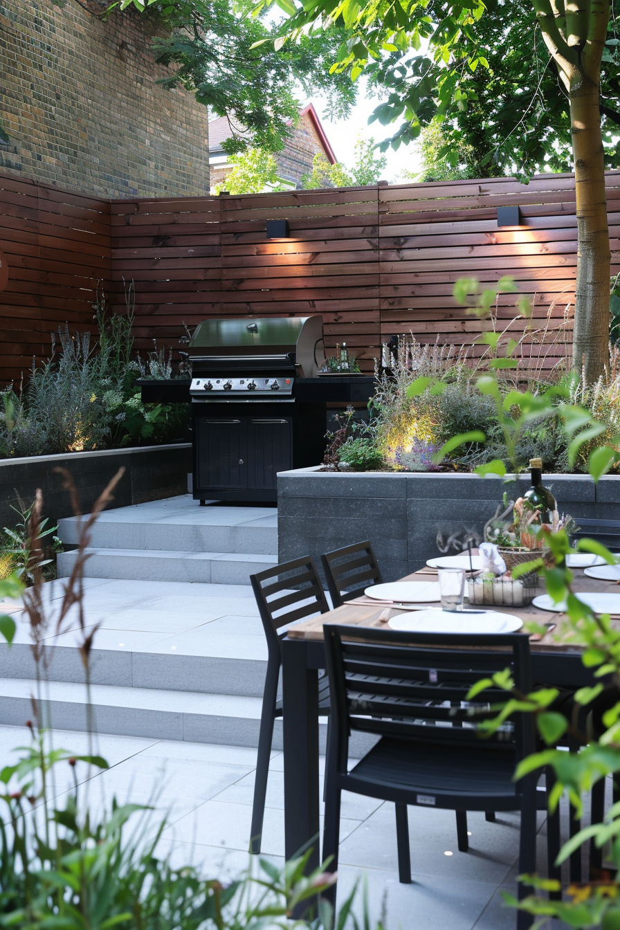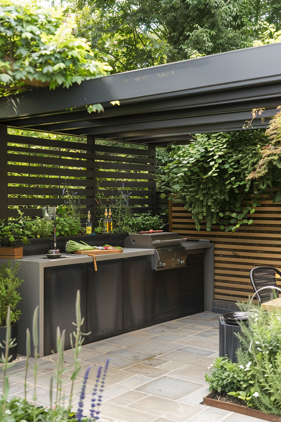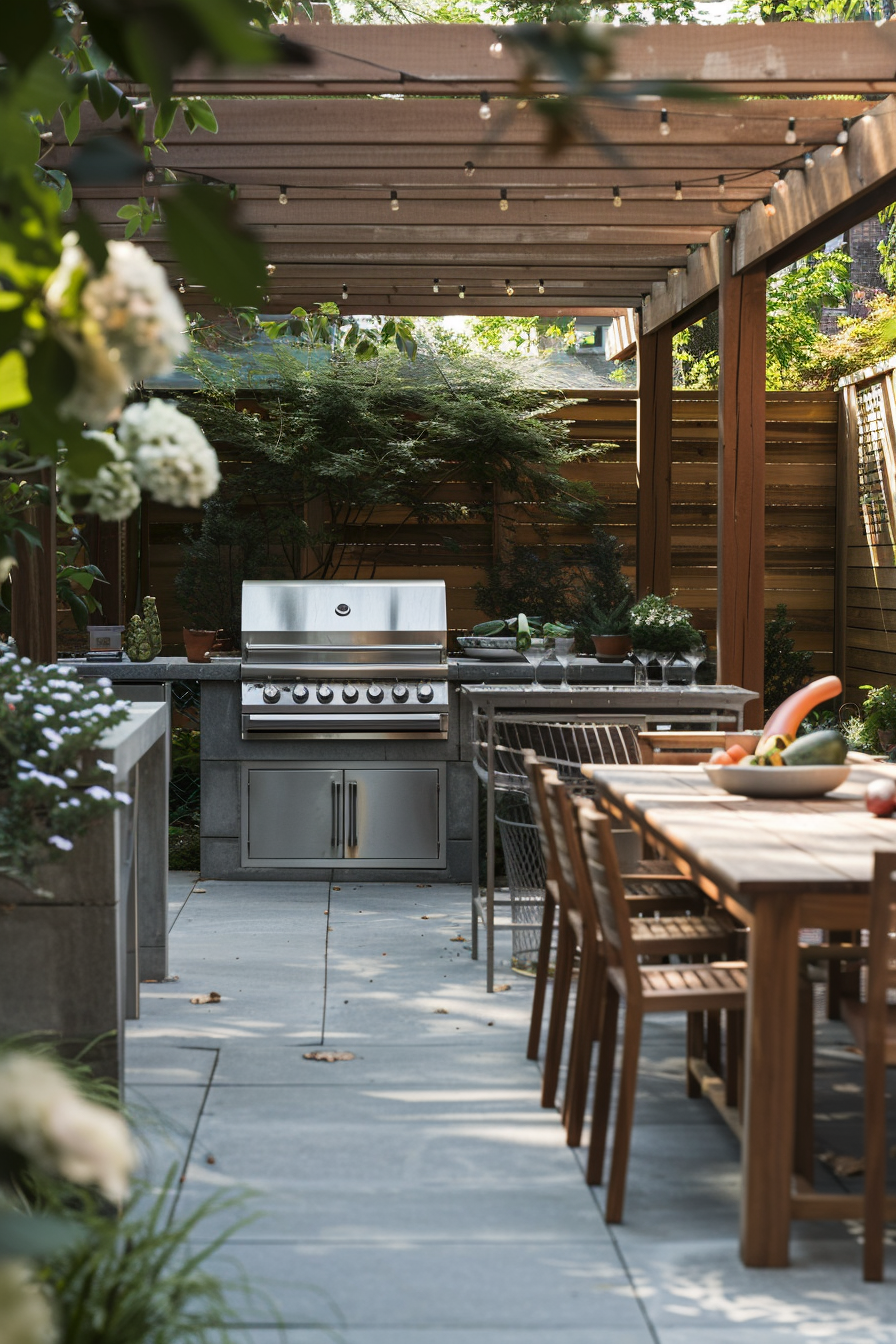 Ever tried fitting a full barbecue setup into a tight corner? This space nails it. The barbecue station tucks neatly beneath a pergola, flanked by compact patio furniture that doesn’t crowd the scene. Weather-resistant materials keep everything crisp year-round, while the smart garden layout makes every square foot count.