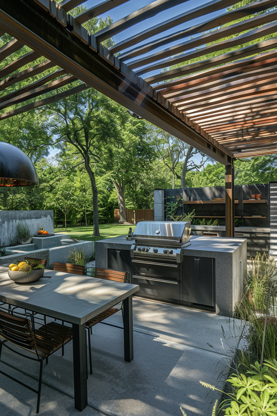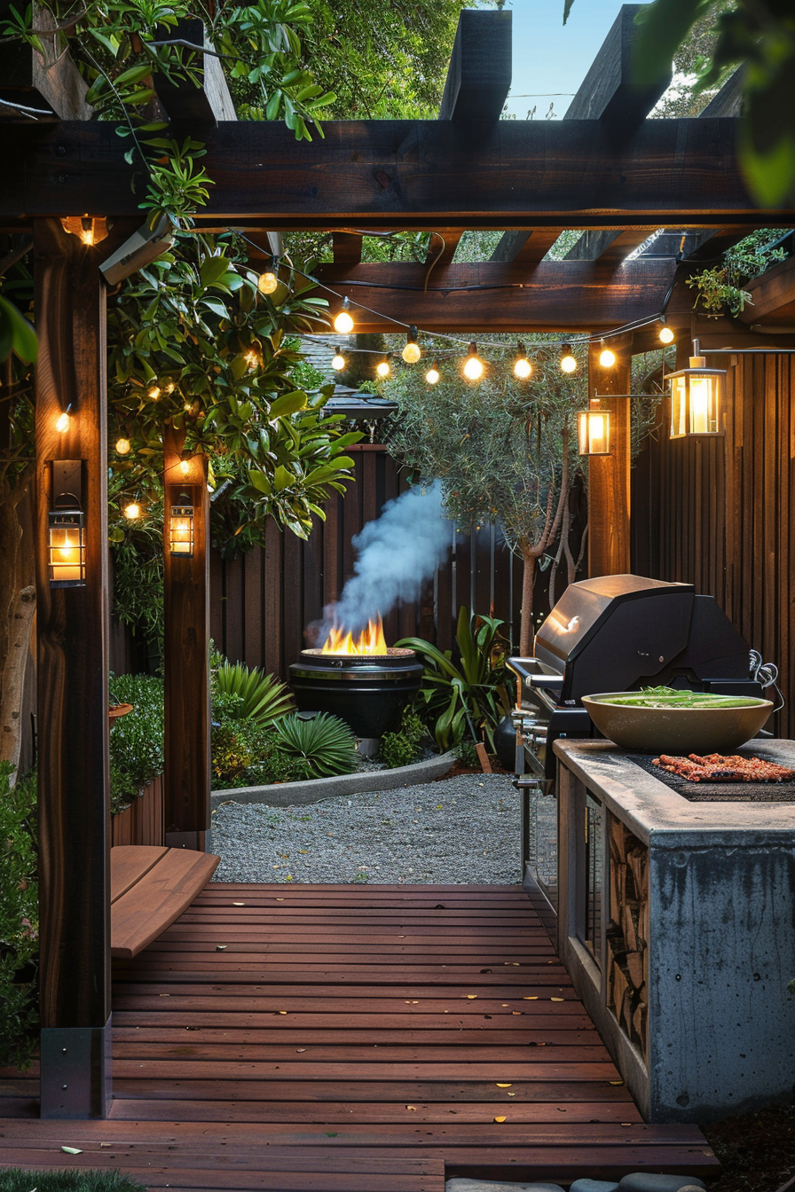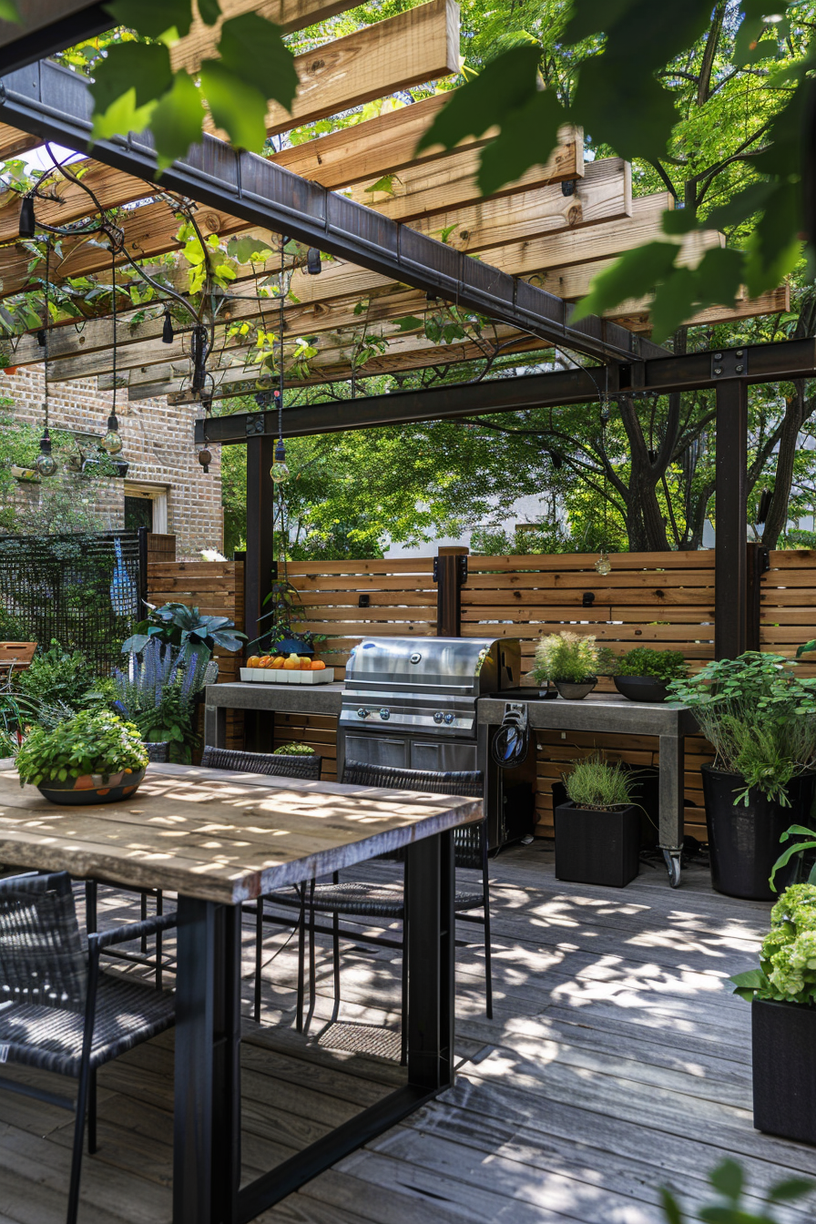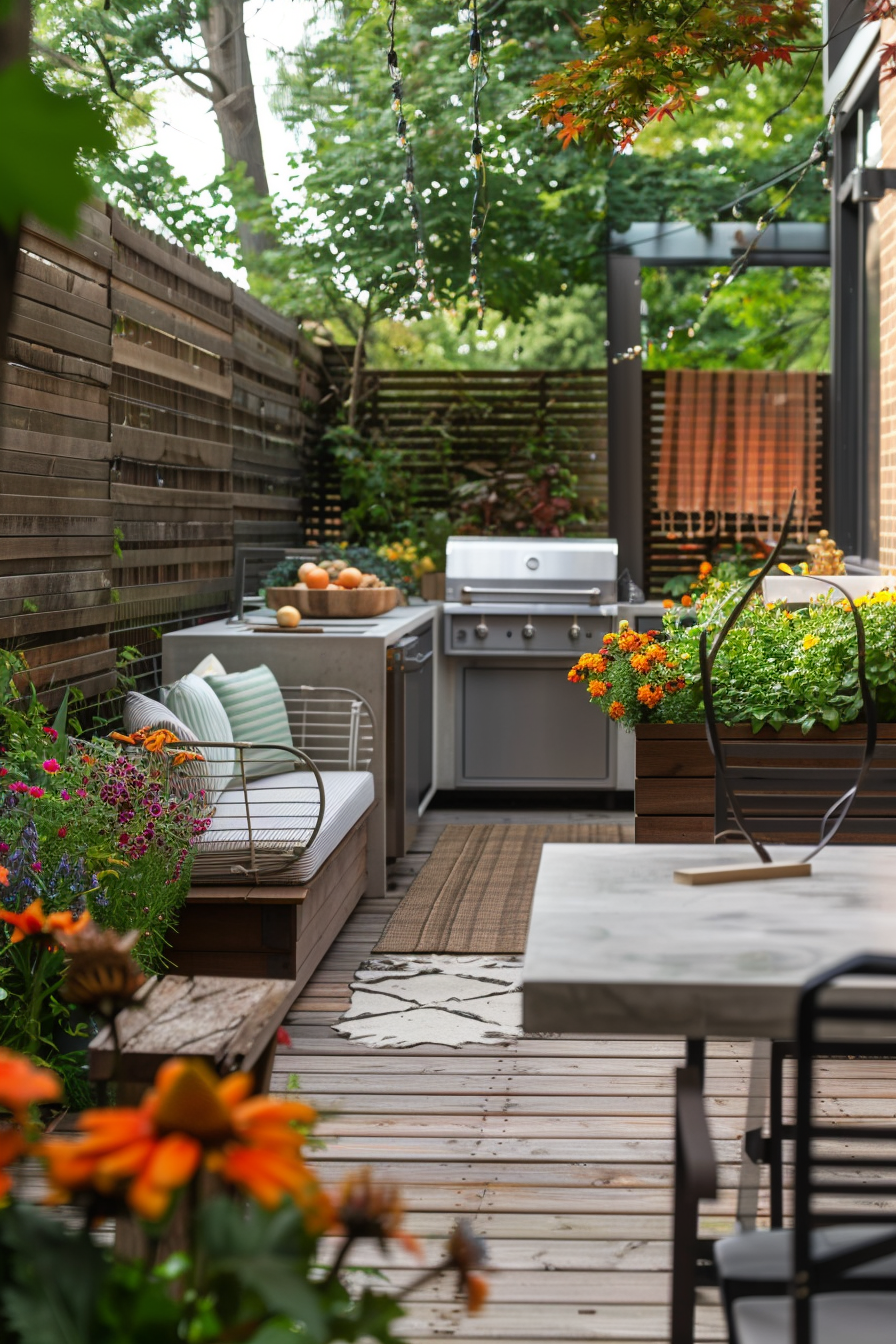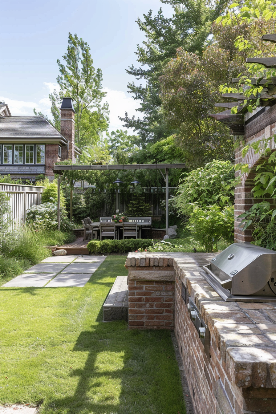 Ever tried fitting a full barbecue setup into a tight corner? This space nails it. The barbecue station tucks neatly beneath a pergola, flanked by compact patio furniture that doesn’t crowd the scene. Weather-resistant materials keep everything crisp year-round, while the smart garden layout makes every square foot count.