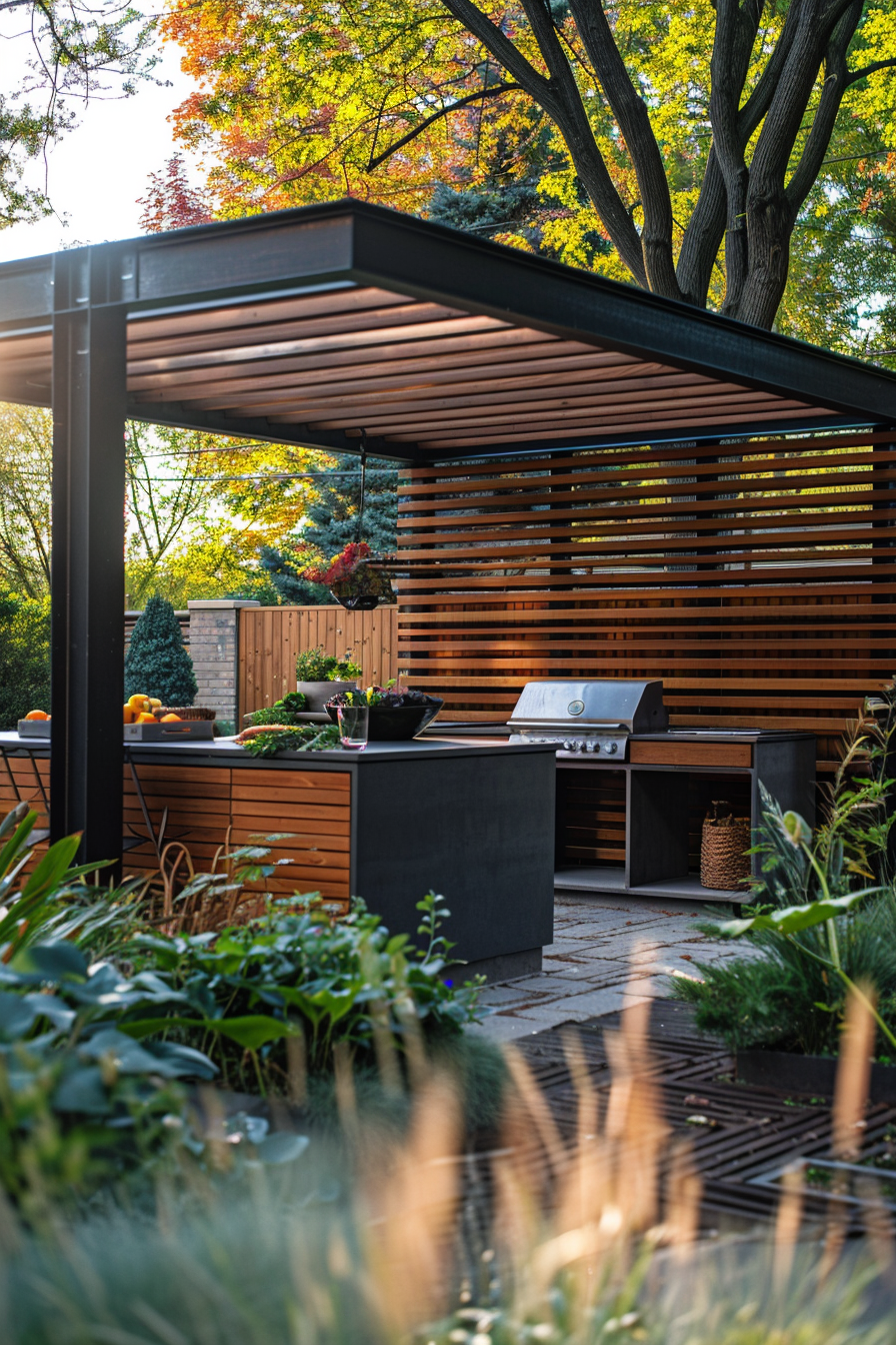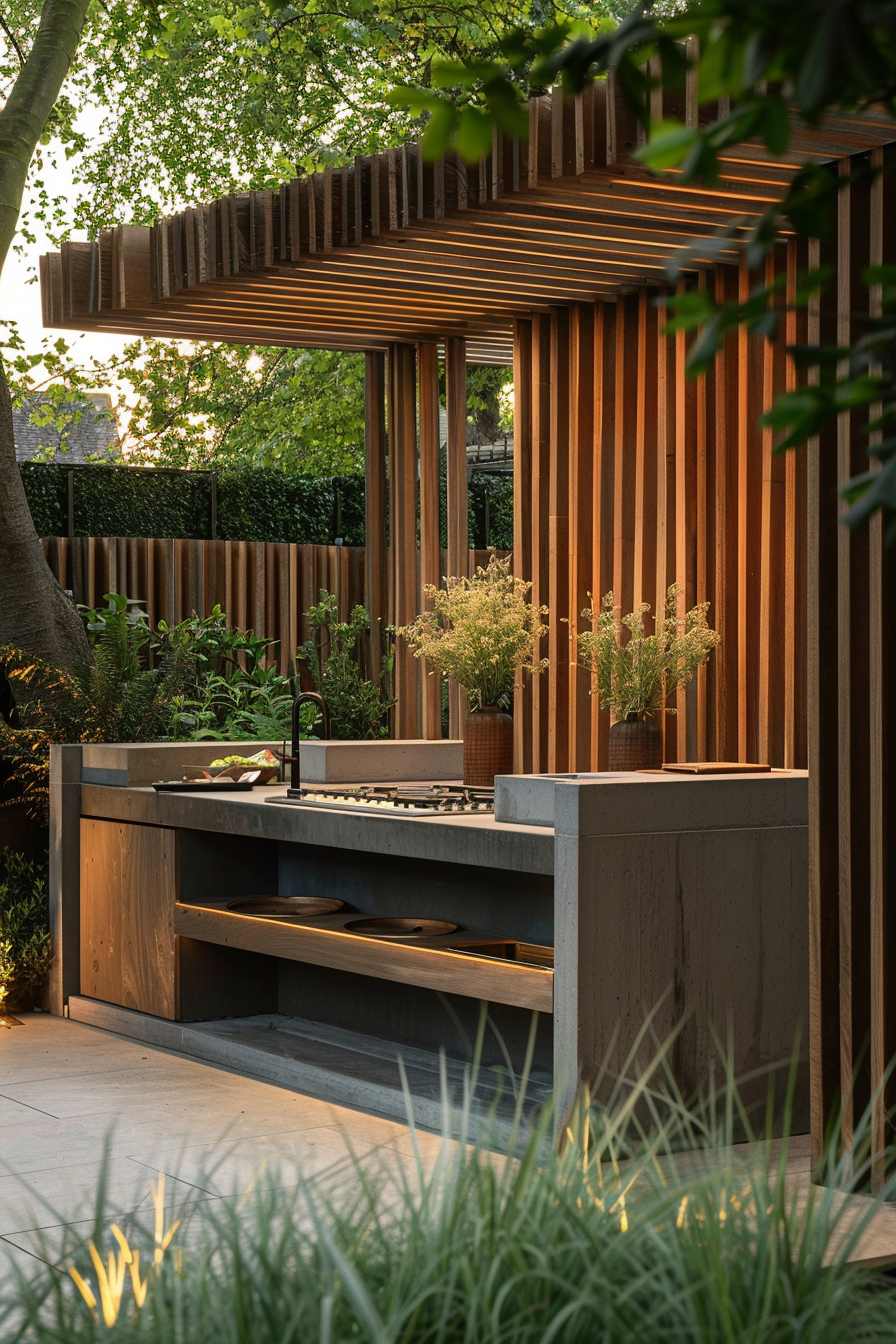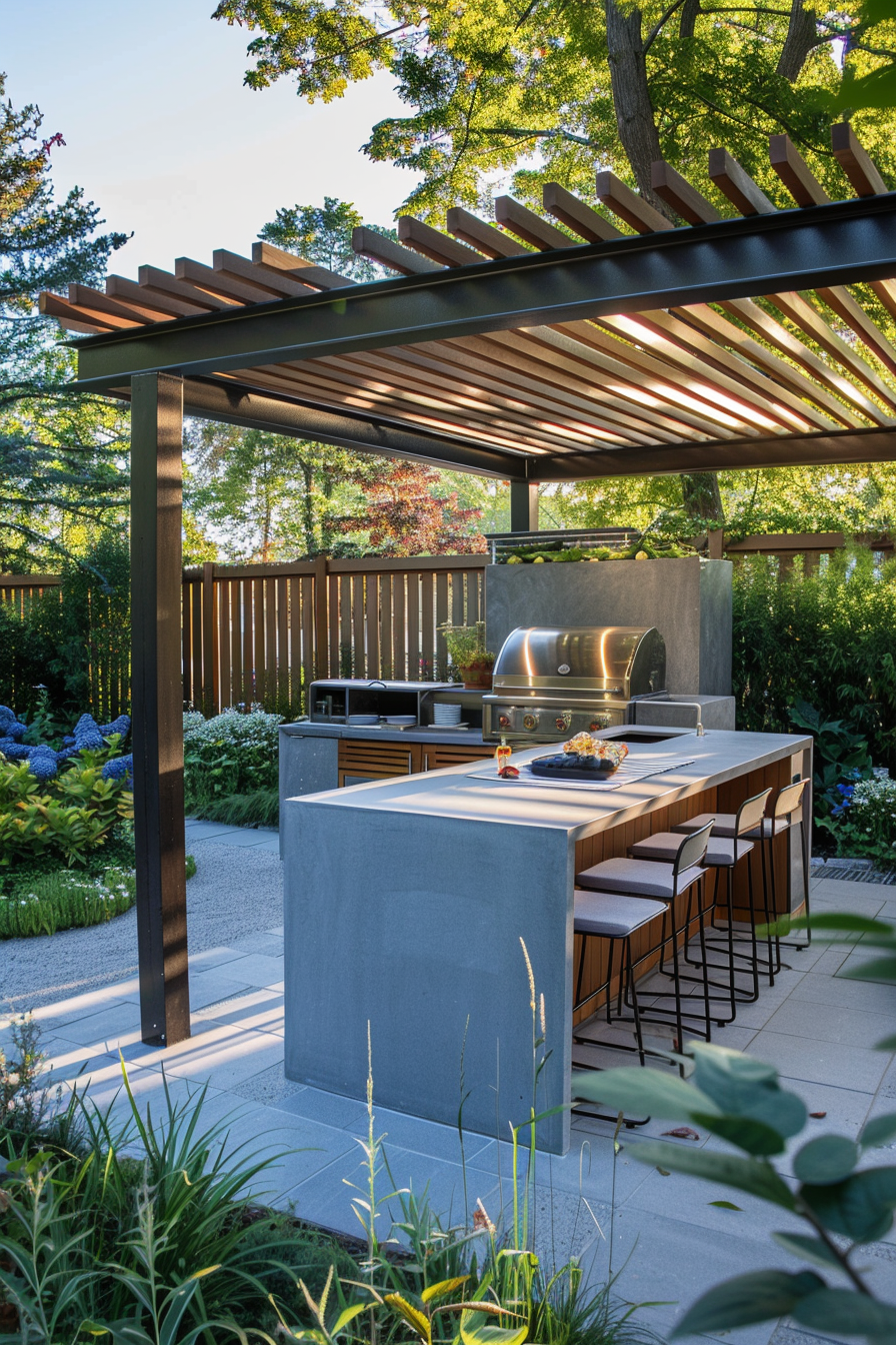 There’s something about cooking outdoors under a pergola that just feels right. The outdoor kitchen tucks neatly beneath slatted beams, lending shade without blocking light. Compact patio furniture keeps the garden layout open, while cozy outdoor seating invites slow evenings. Everything feels balanced—effortless flow, practical function, and just enough comfort.