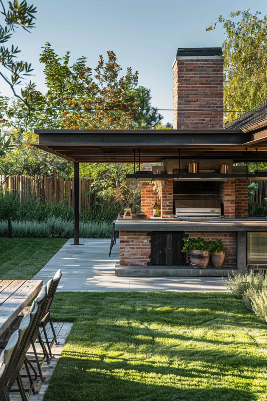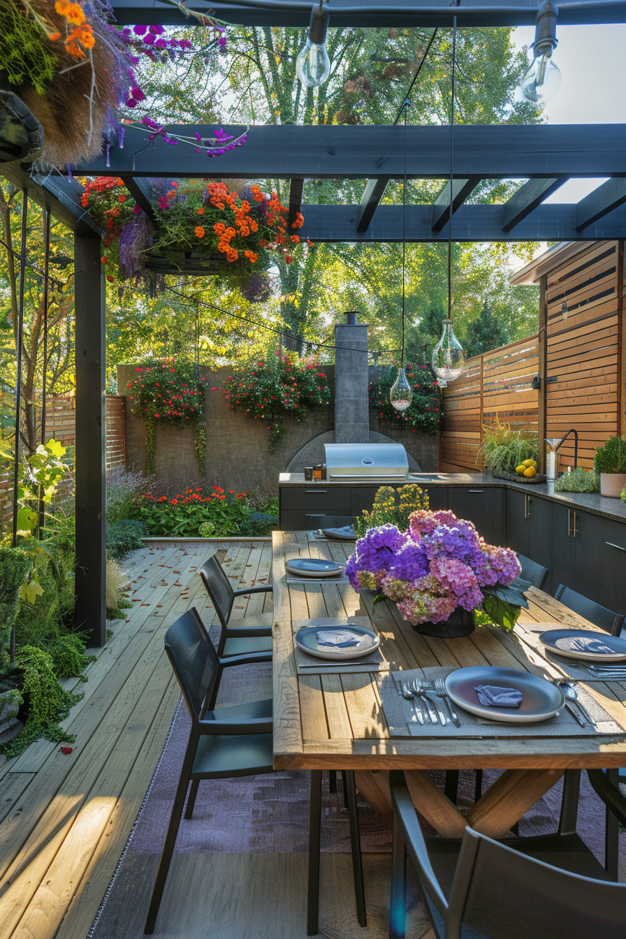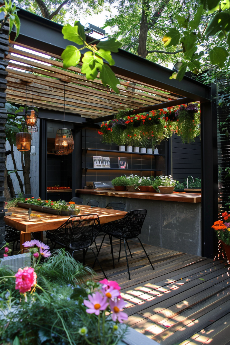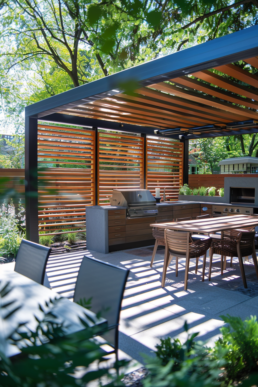 There’s something about cooking outdoors under a pergola that just feels right. The outdoor kitchen tucks neatly beneath slatted beams, lending shade without blocking light. Compact patio furniture keeps the garden layout open, while cozy outdoor seating invites slow evenings. Everything feels balanced—effortless flow, practical function, and just enough comfort.
