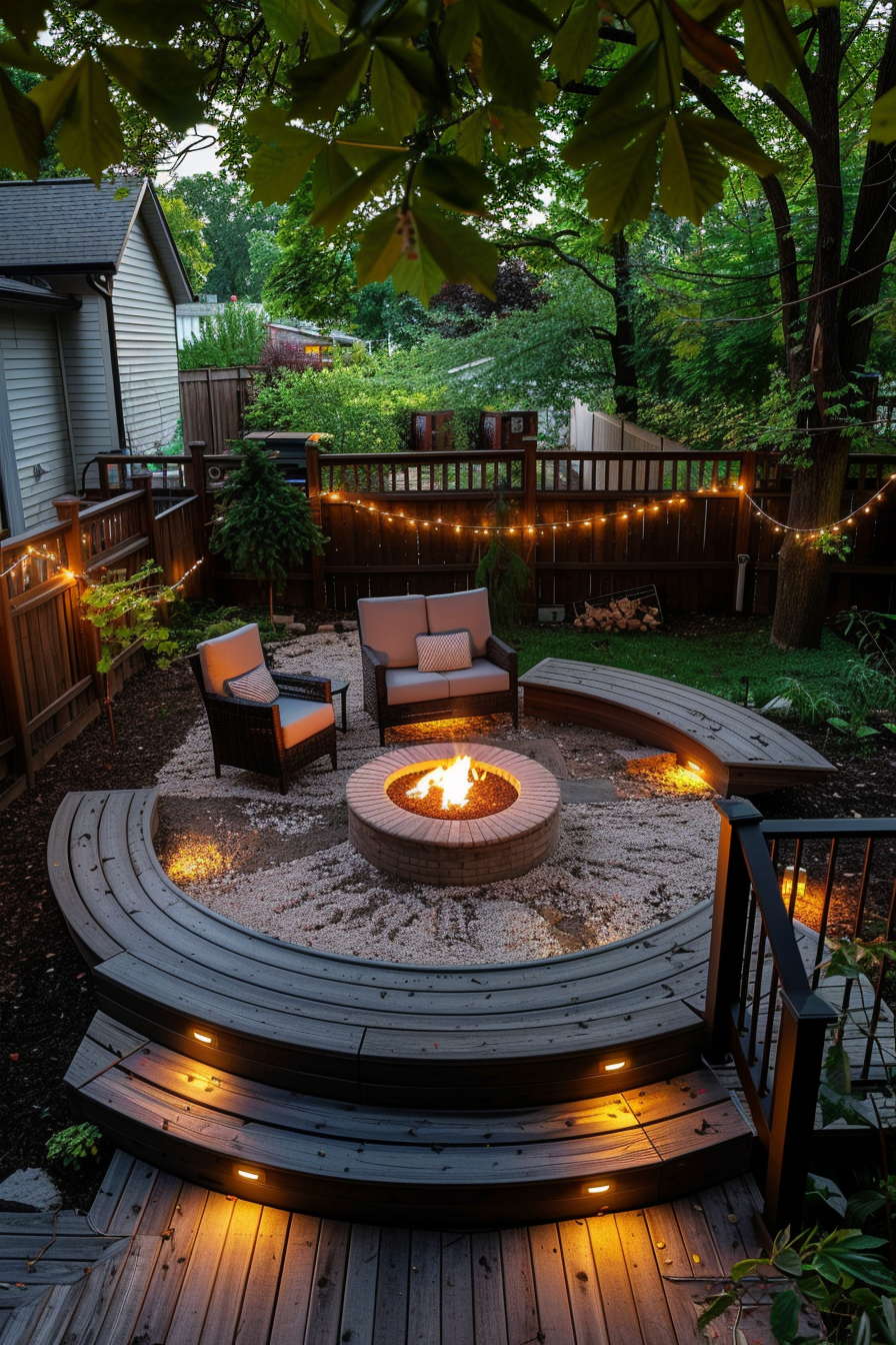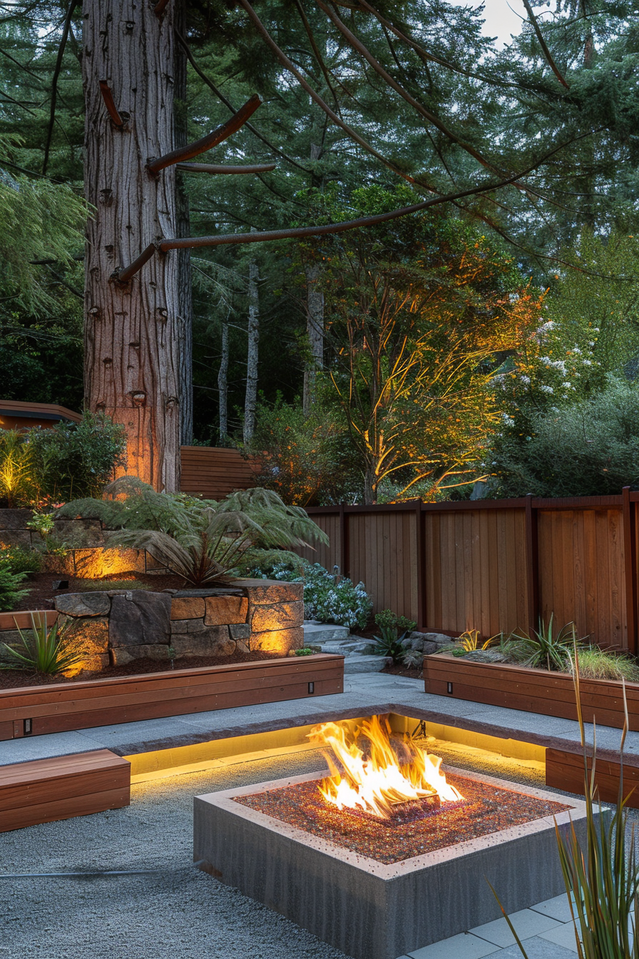 There’s something timeless about gathering around a fire. In this rustic space, the fire pit anchors the layout, framed by soft landscape lighting and natural textures. Privacy screening tucks the spot away, making it feel like a hidden retreat—ideal for entertaining as the evening light fades and conversations stretch into night.