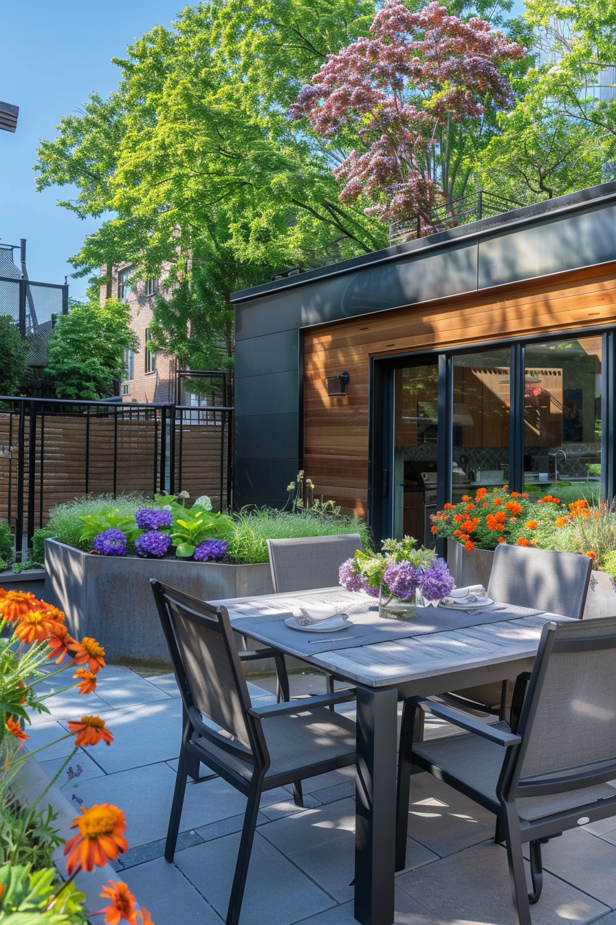 Ever wish your backyard felt more like a weekend café? This cozy decked corner makes it happen—with compact patio furniture, a clever outdoor kitchen, and seasonal flowers lining the edge. The space feels open yet snug, with outdoor seating that folds away, keeping the layout flexible for everyday living.