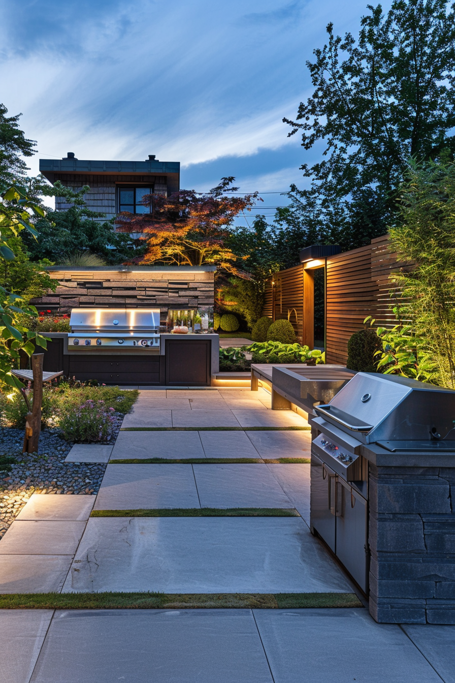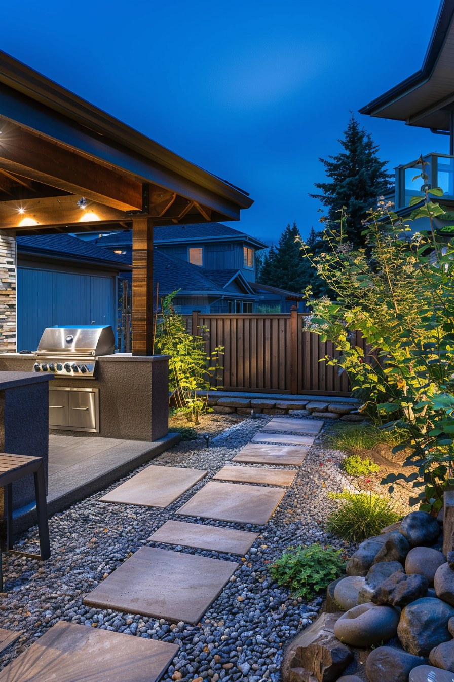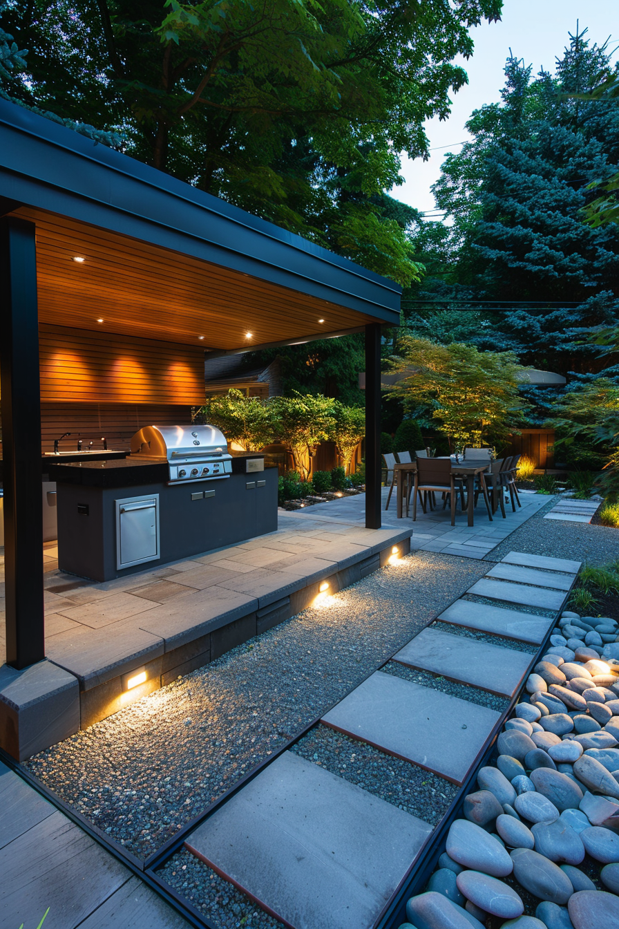 There’s something about soft landscape lighting that transforms a simple barbecue station into an evening sanctuary. Tucked beside weather-resistant walls and framed by stone pathways, the space feels both protected and open. As dusk settles, mood lighting warms the alcove, making late dinners outside feel relaxed, easy, and entirely inviting.