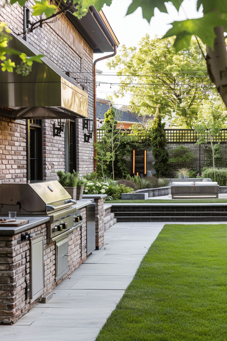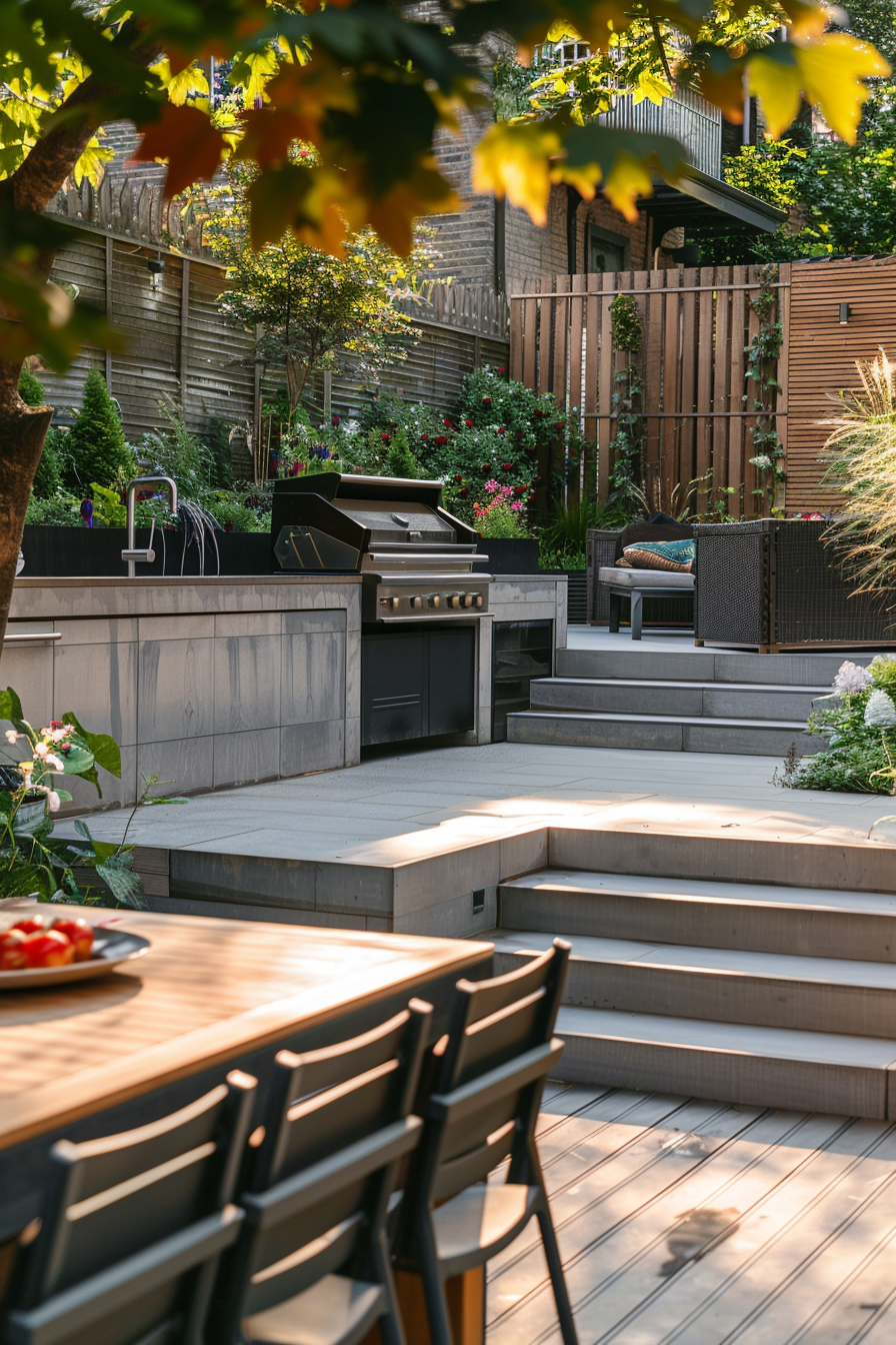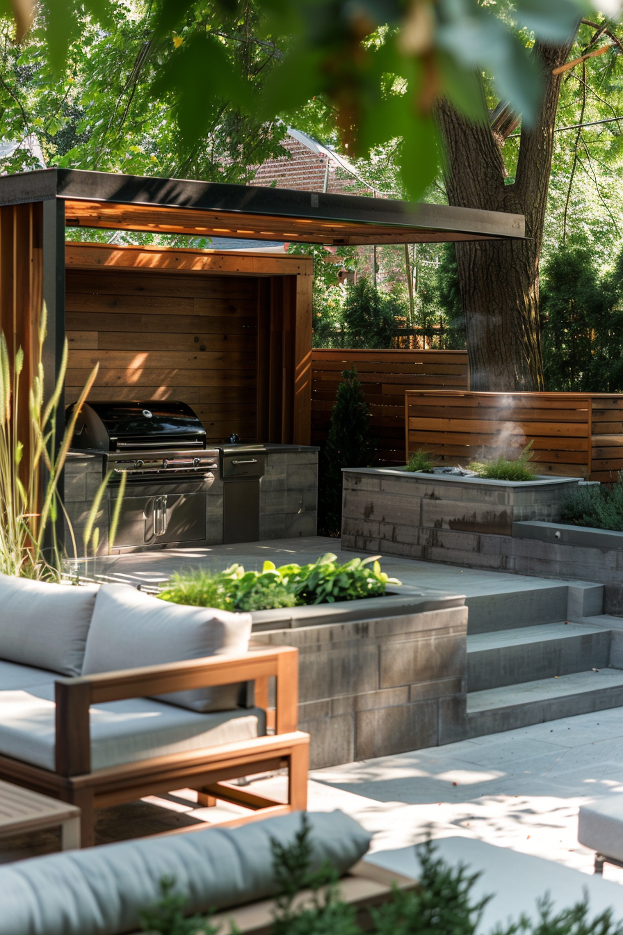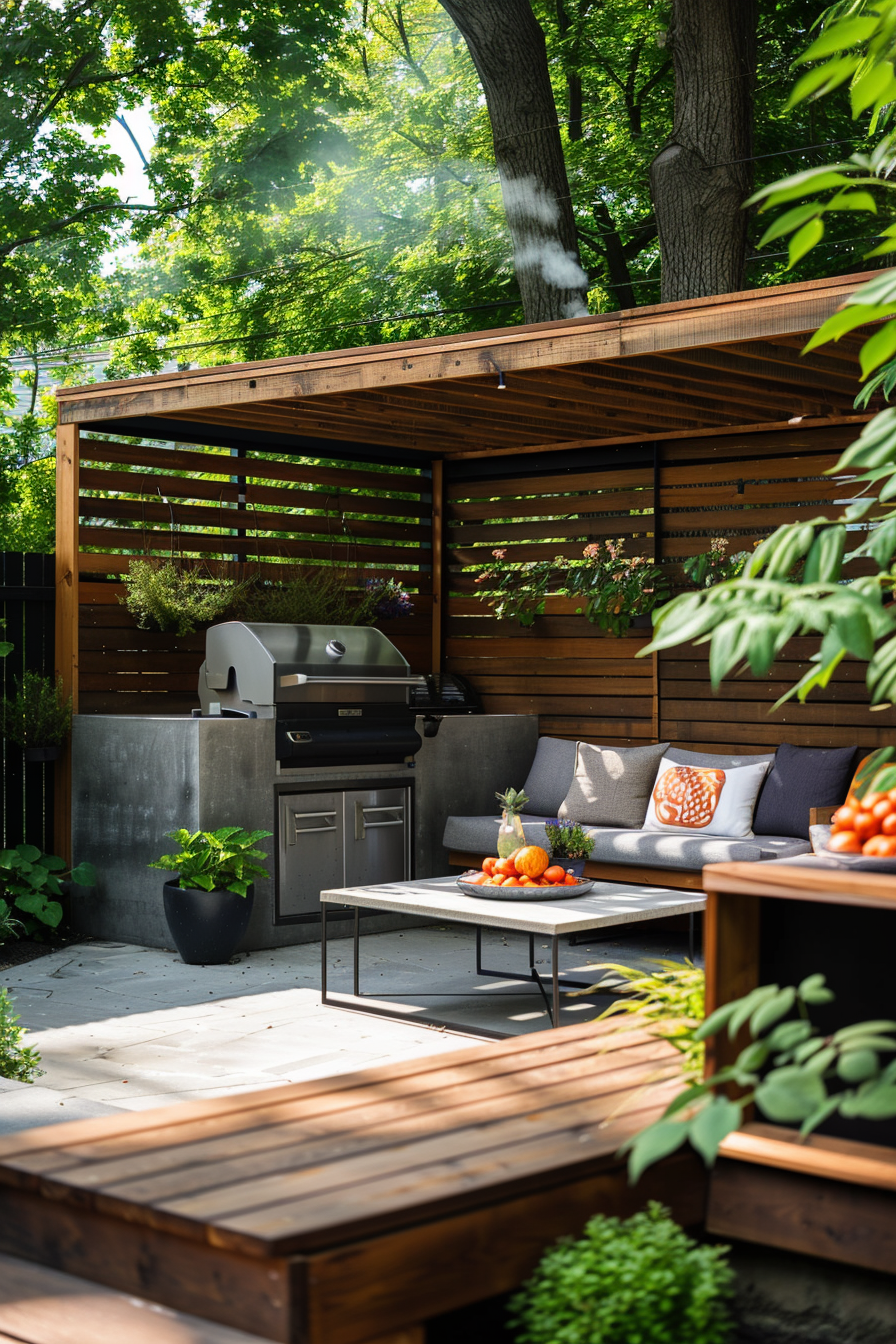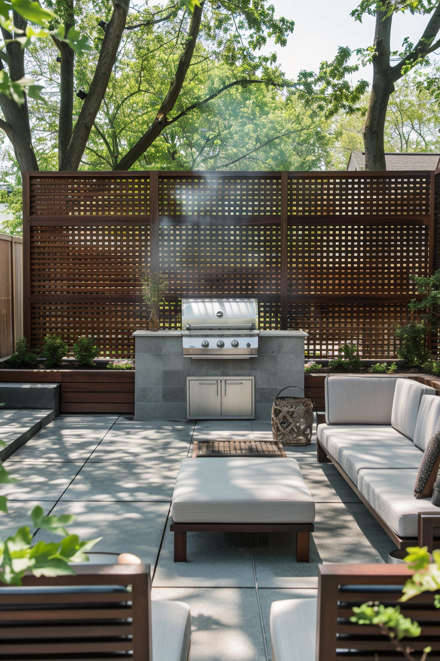 Ever tried grilling in a space that feels too exposed? Here, privacy screening creates a calm boundary while guiding smoke flow away from cushioned patio furniture. The barbecue station sits tucked, yet central, so outdoor seating feels social—not smokey. It’s a lounge that works beautifully, even on breezy afternoons.
