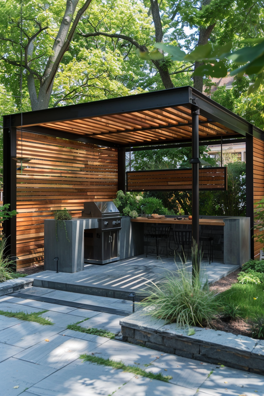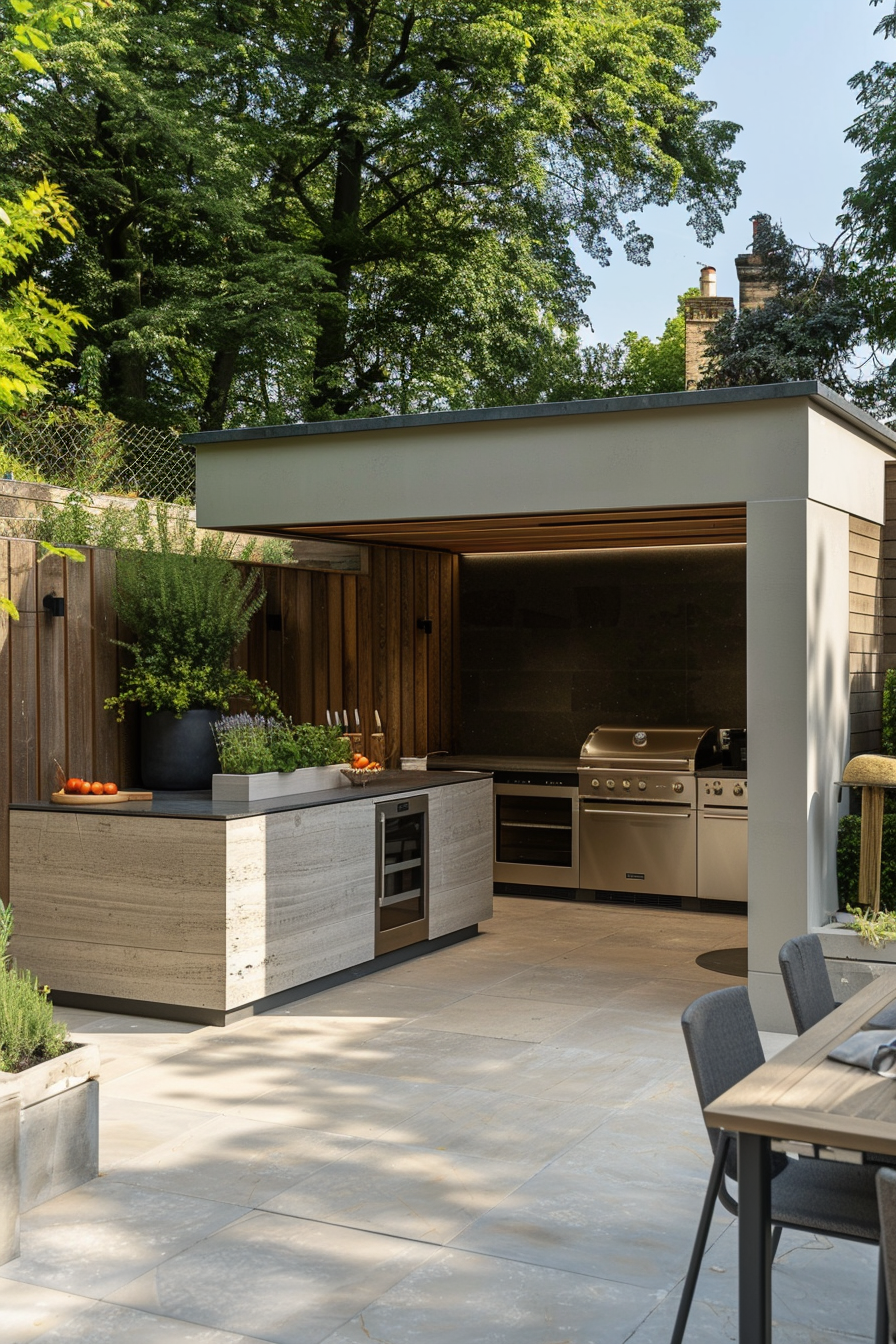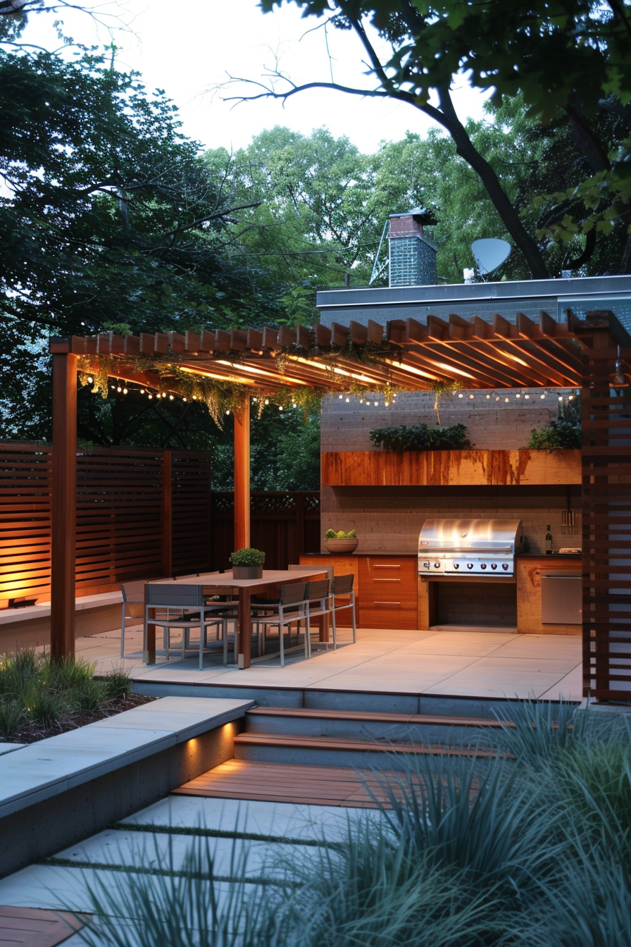 Ever hosted dinner outside and wished the weather behaved? A waterproof canopy solves that, stretching over this compact outdoor kitchen. The built-in grill tucks neatly beneath, with warm lighting and weather-resistant materials keeping the space low-fuss. Trellis privacy screening adds just enough seclusion for relaxed cooking without sacrificing the open feel.