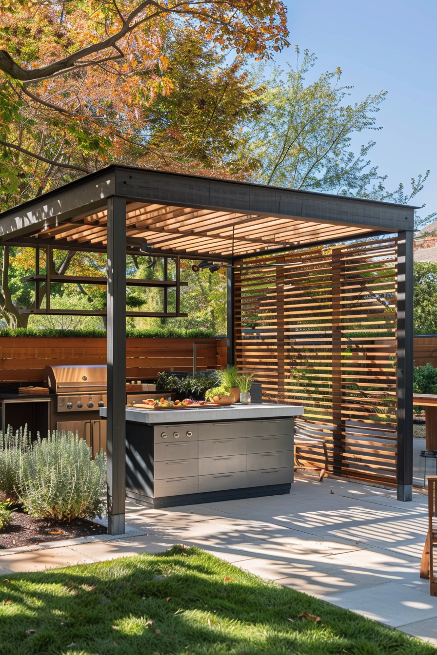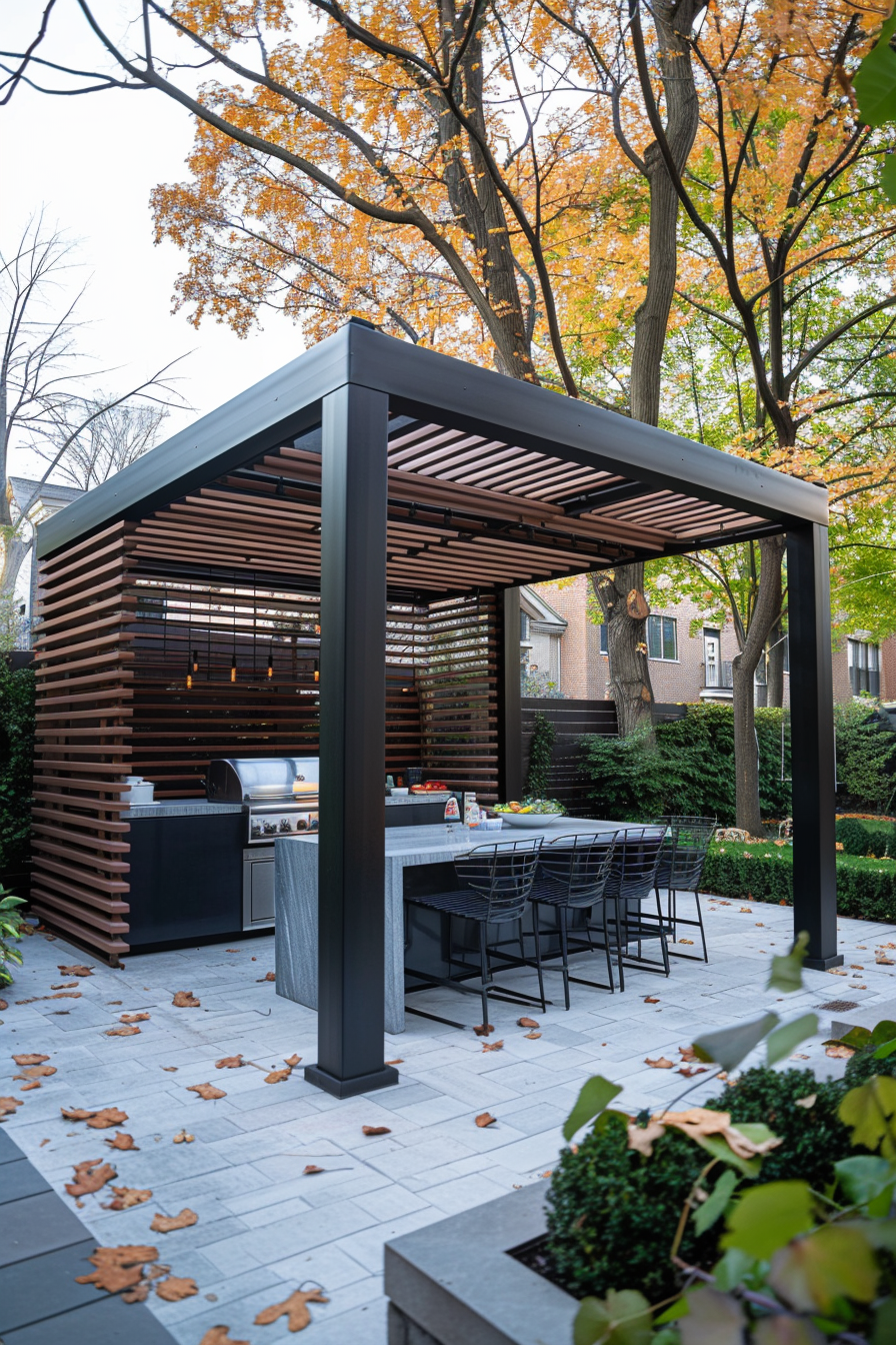 Ever tried flipping burgers while the wind steals your napkins? This freestanding pergola fixes that, crafting a breezy but sheltered outdoor kitchen. Weather-resistant materials keep it worry-free, while subtle privacy screening blocks gusts without closing things in. It’s a smart setup that feels open, functional, and made for impromptu gatherings.