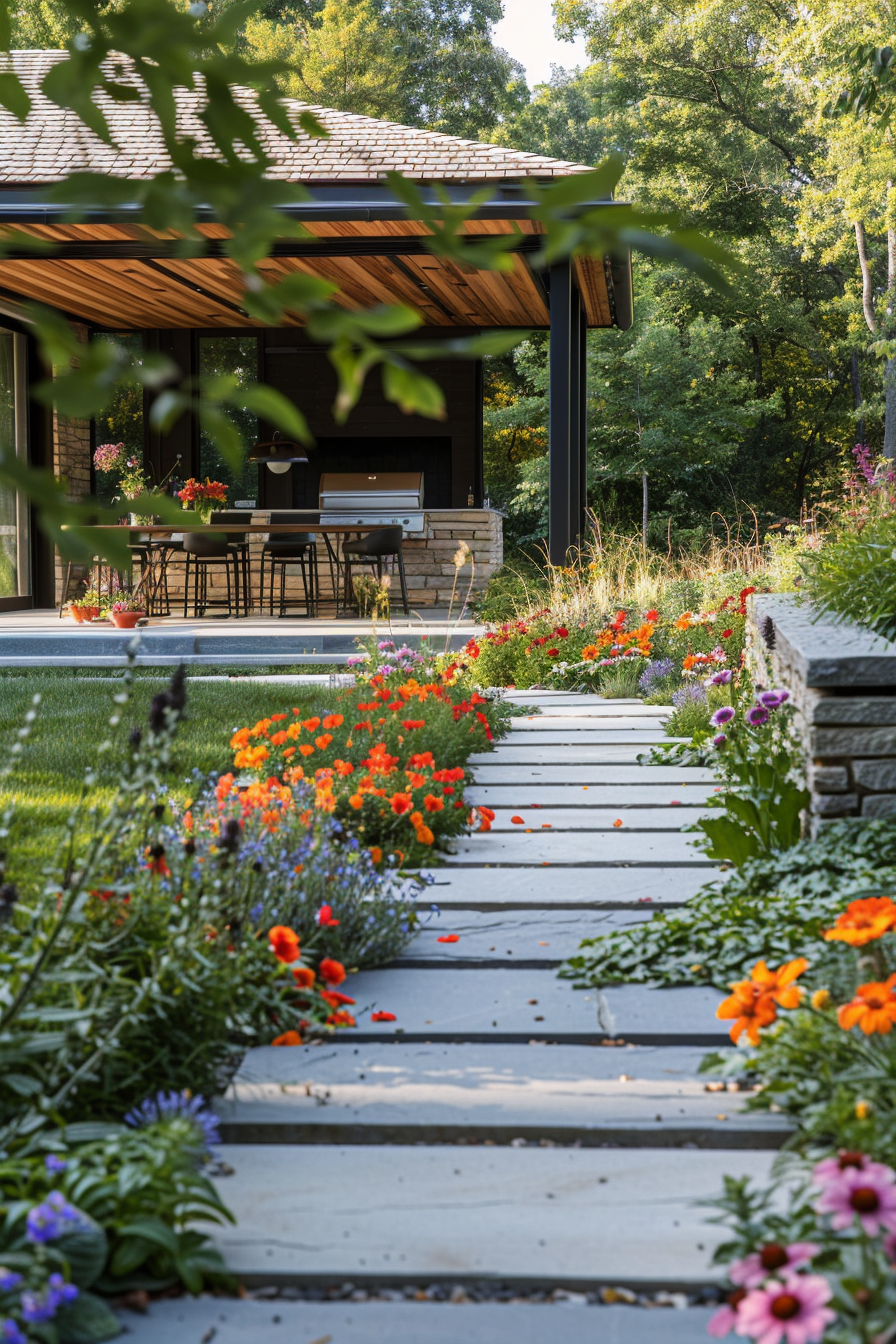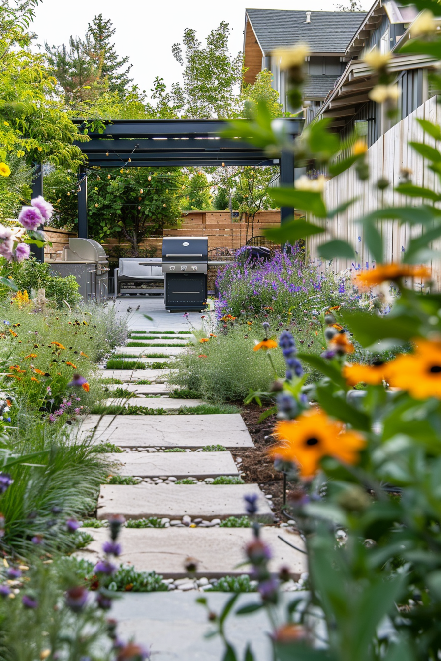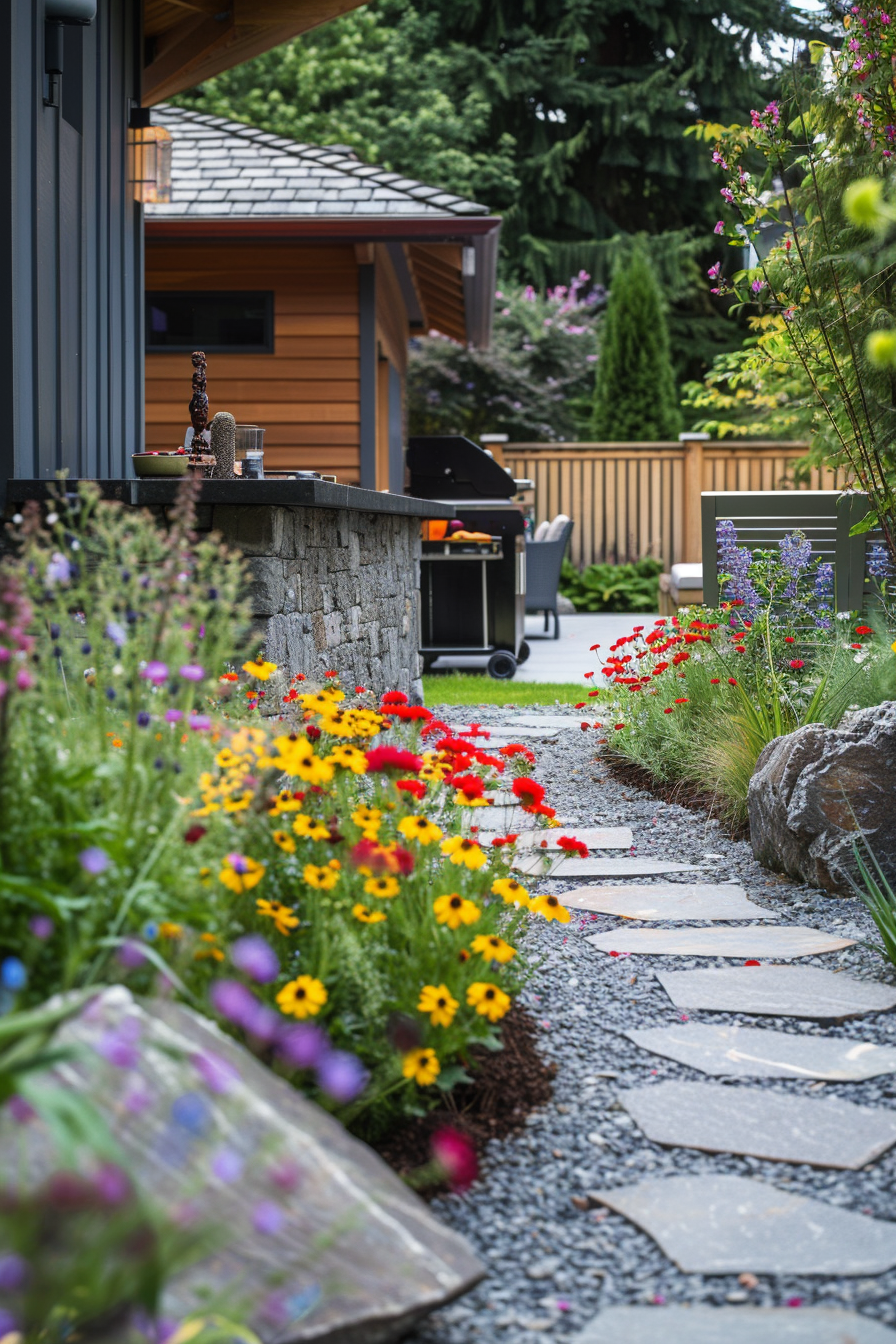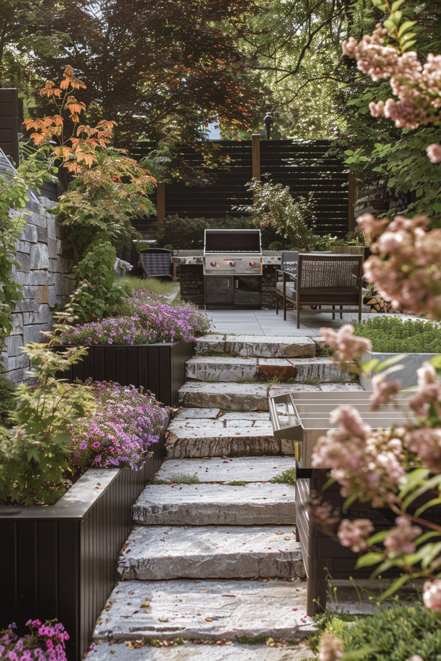 Ever follow a path just to see where it leads? Here, stone pathways meander through seasonal flowers, guiding you to a tucked-away barbecue station. It’s compact but welcoming, with simple outdoor seating nestled nearby. The setup feels intentional—just enough structure to balance the softness and scent of blooming beds.