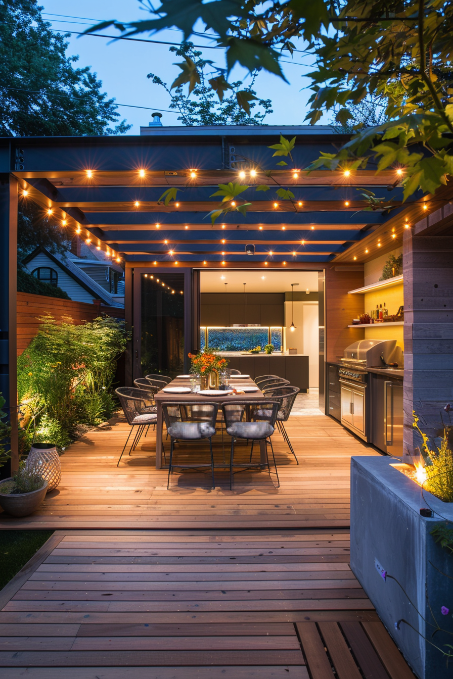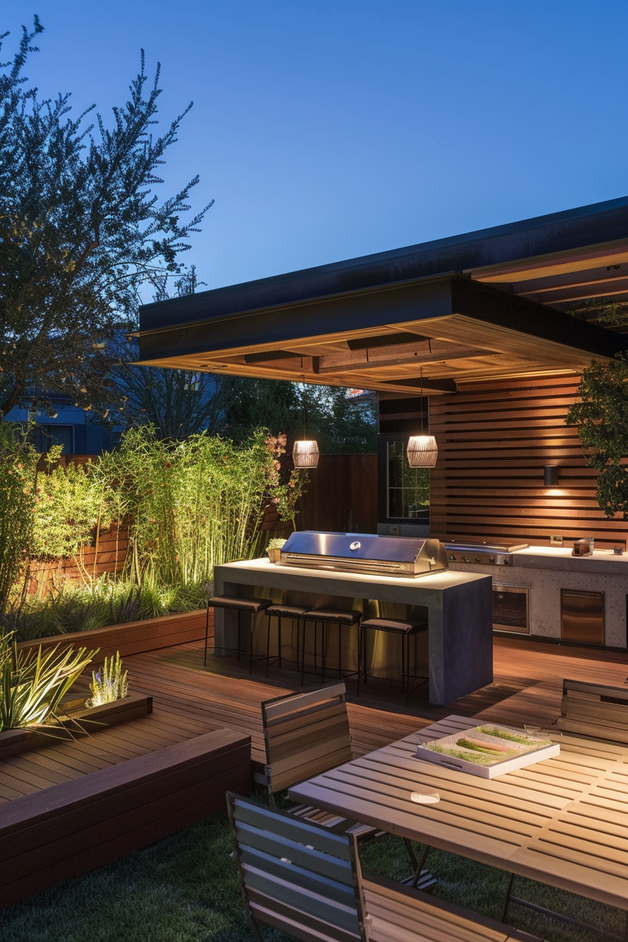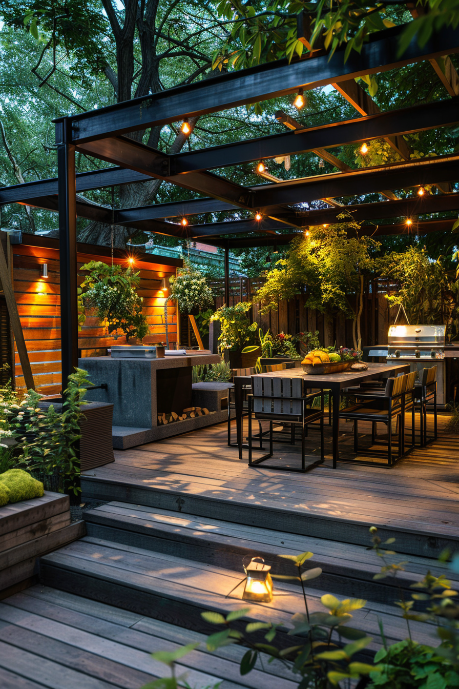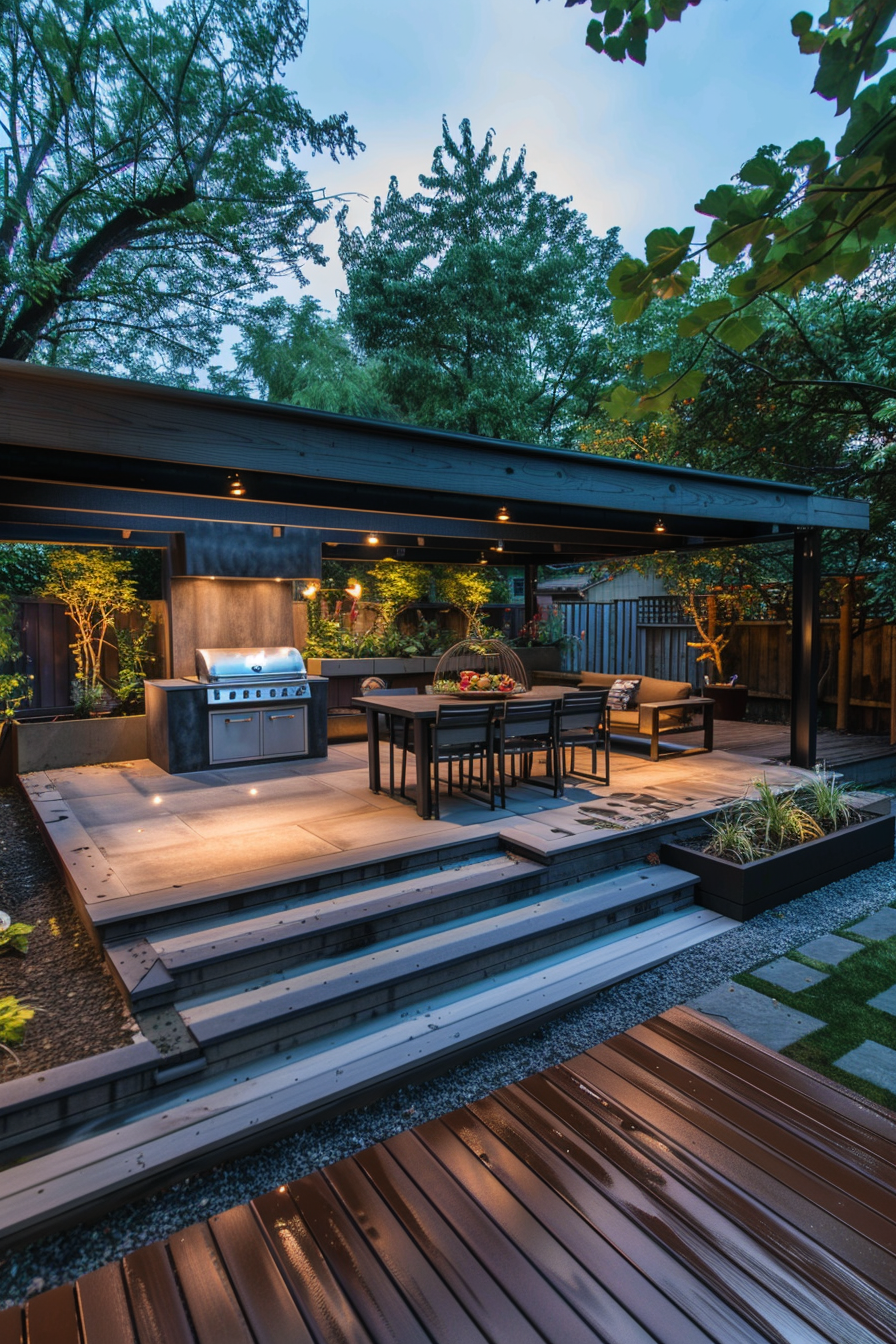 Ever tried cooking outdoors under a canopy of soft landscape lighting? This raised garden deck makes it effortless. The patio furniture feels casual but considered, easy to move with the rhythm of the evening. Mood lighting wraps the space gently, guiding the layout from grill to table without missing a beat.