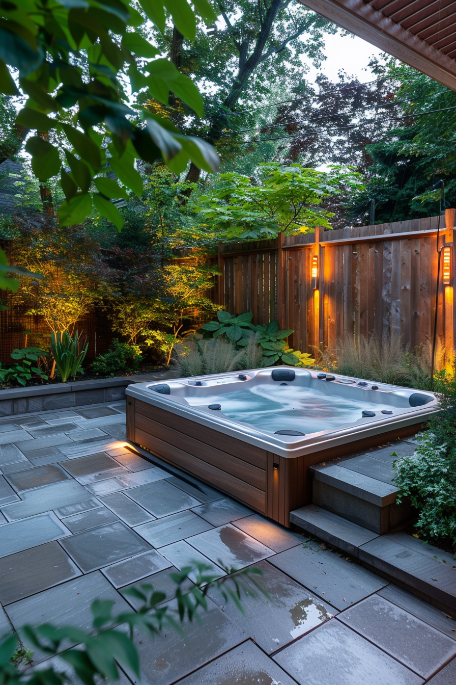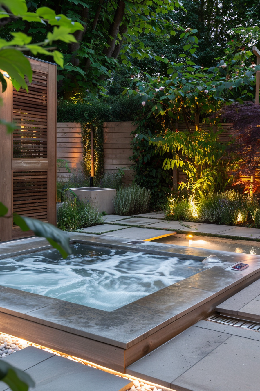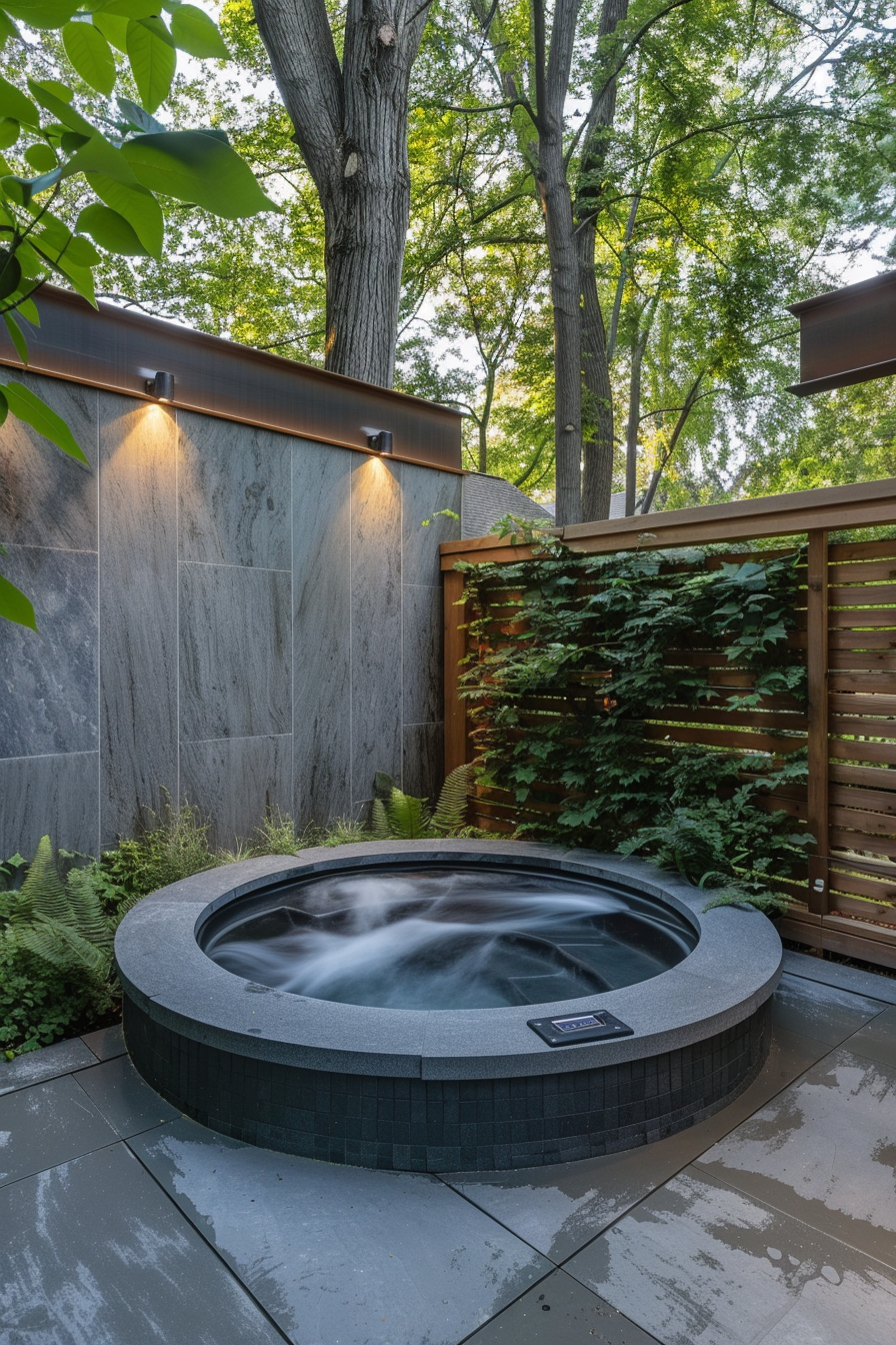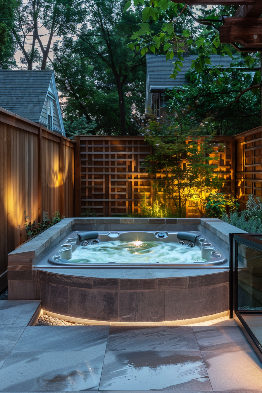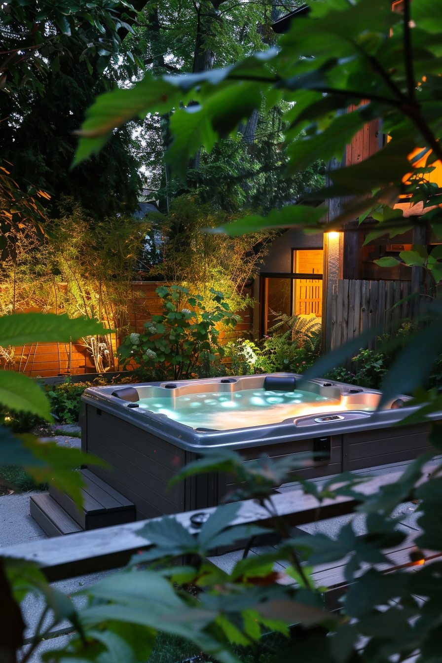 This sleek spa fits perfectly in a small patio, and there’s soft lighting that gives it a peaceful vibe. Stone paths lead you right to it, making it easy to step away from everything and just relax.