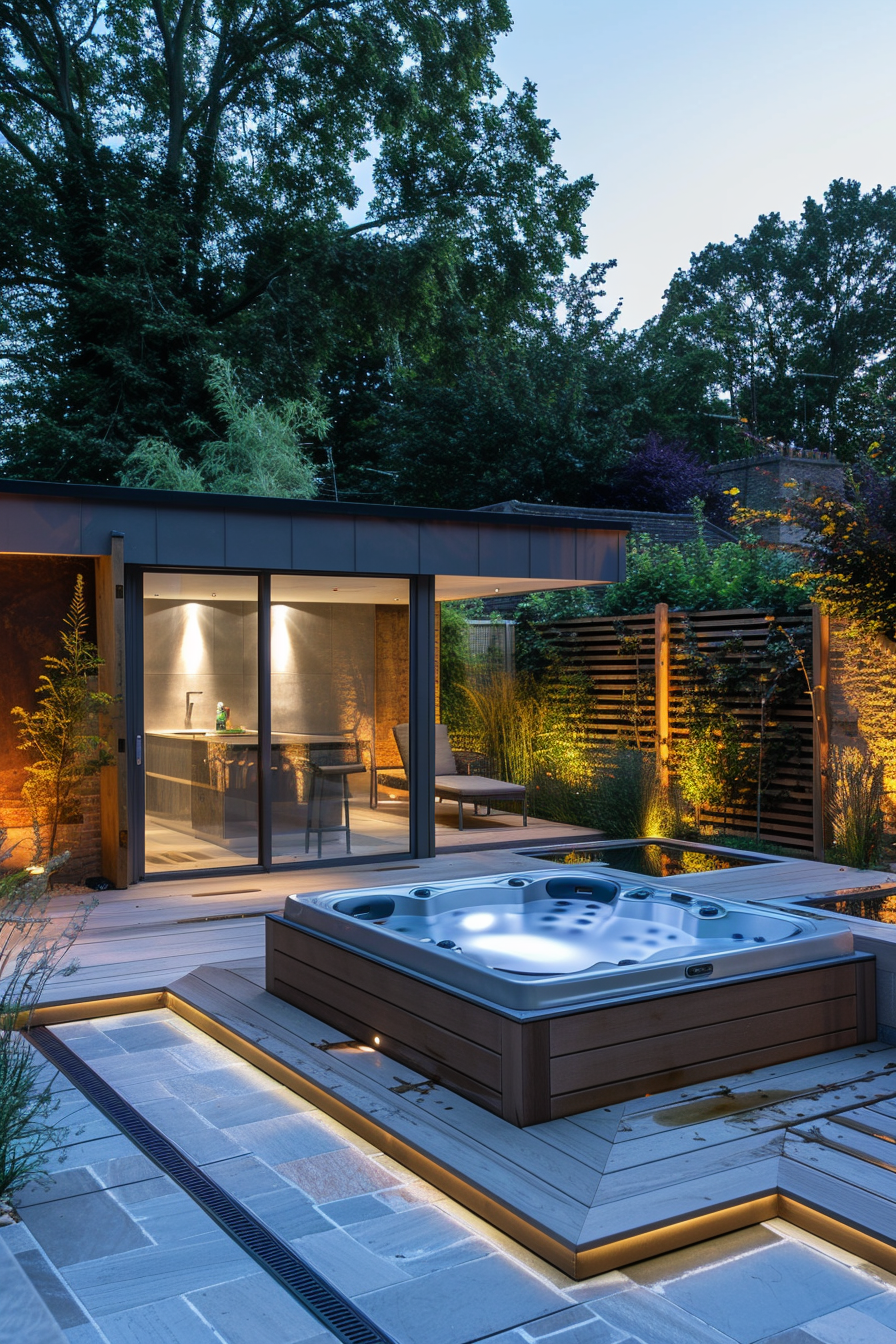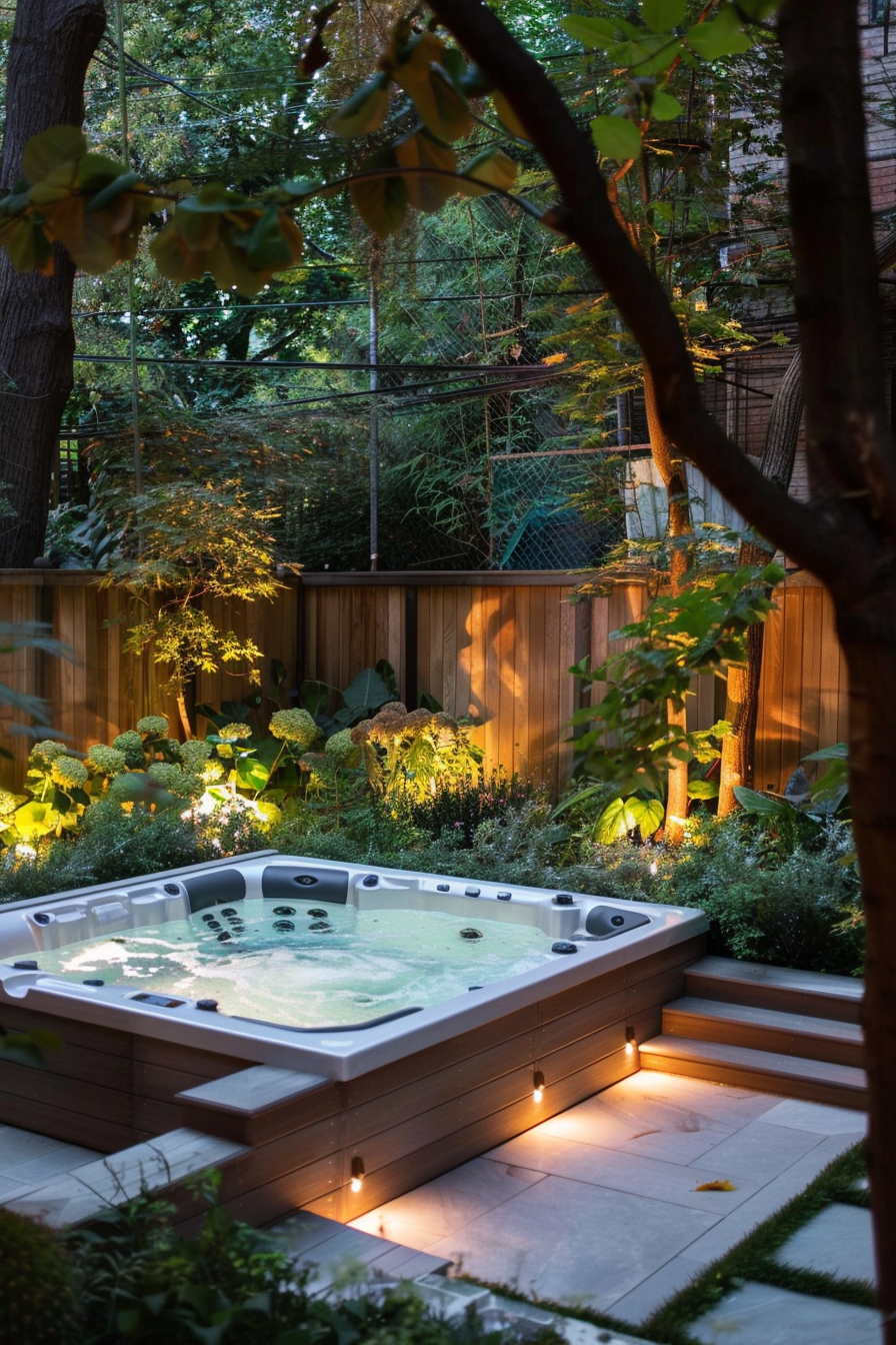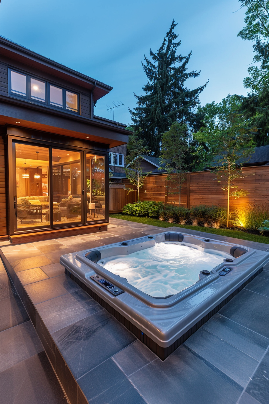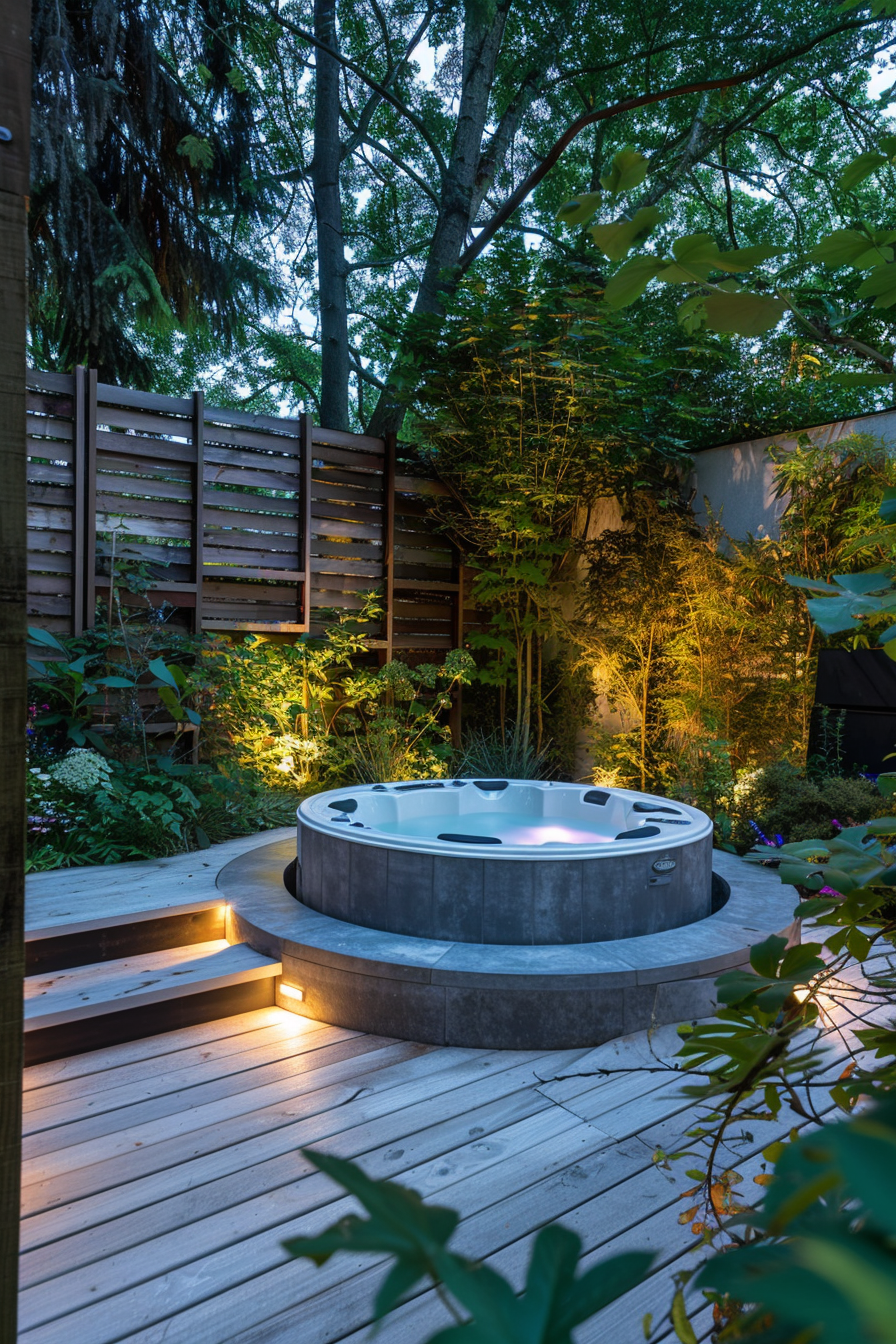 This sleek spa fits perfectly in a small patio, and there’s soft lighting that gives it a peaceful vibe. Stone paths lead you right to it, making it easy to step away from everything and just relax.