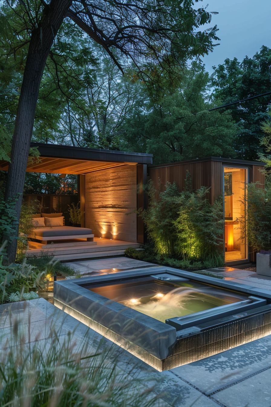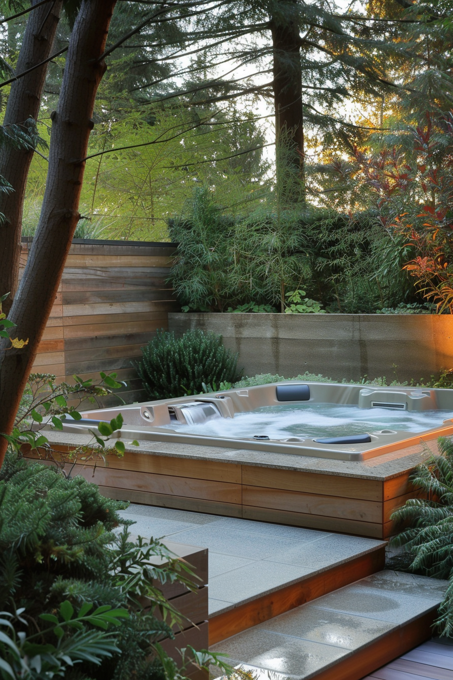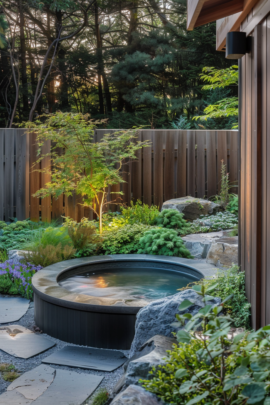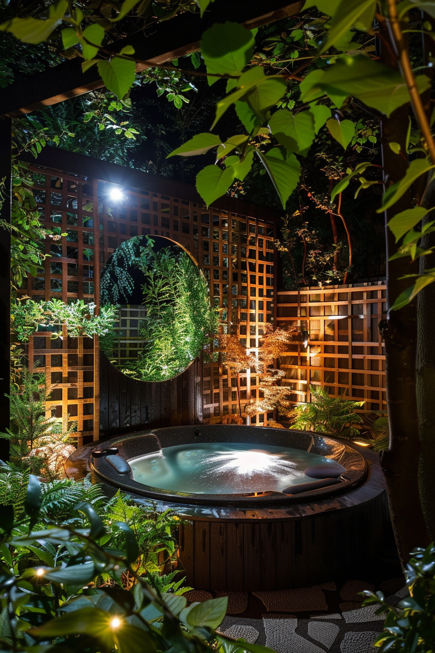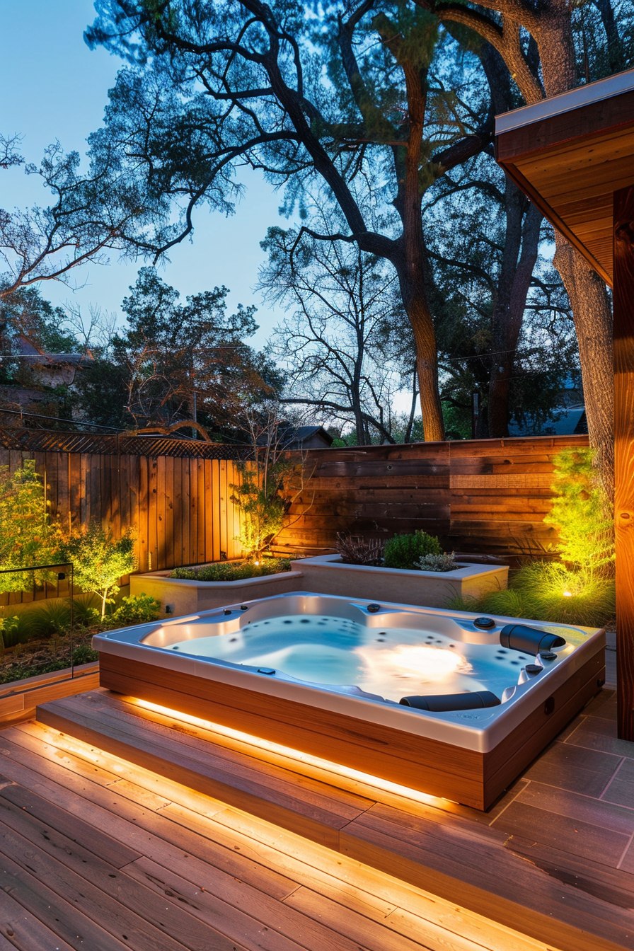 This sleek spa fits perfectly in a small patio, and there’s soft lighting that gives it a peaceful vibe. Stone paths lead you right to it, making it easy to step away from everything and just relax.