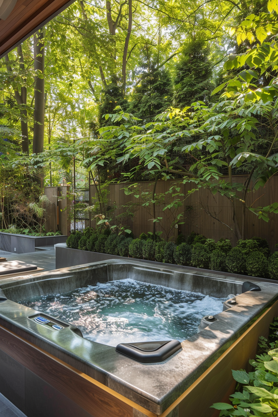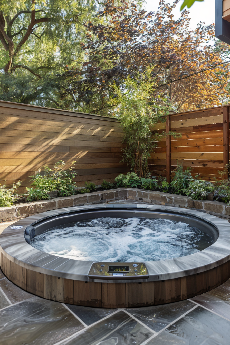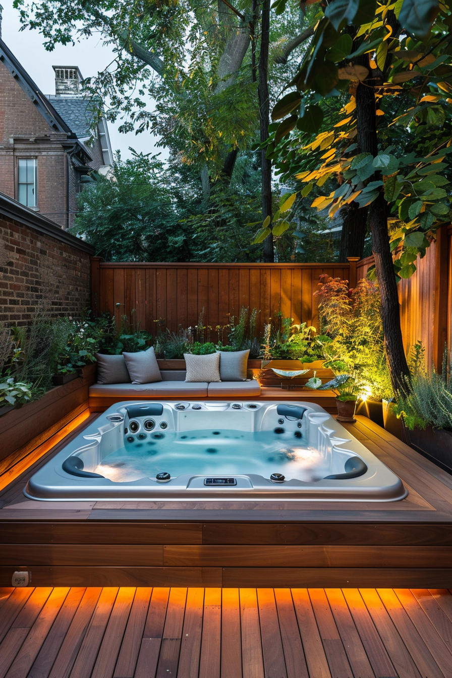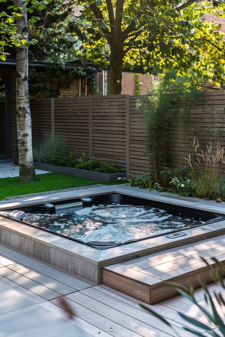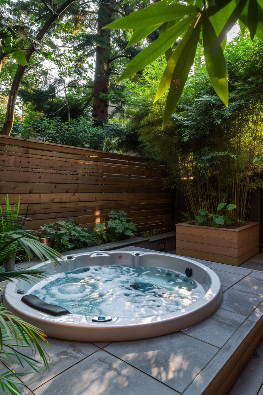 This sleek spa fits perfectly in a small patio, and there’s soft lighting that gives it a peaceful vibe. Stone paths lead you right to it, making it easy to step away from everything and just relax.